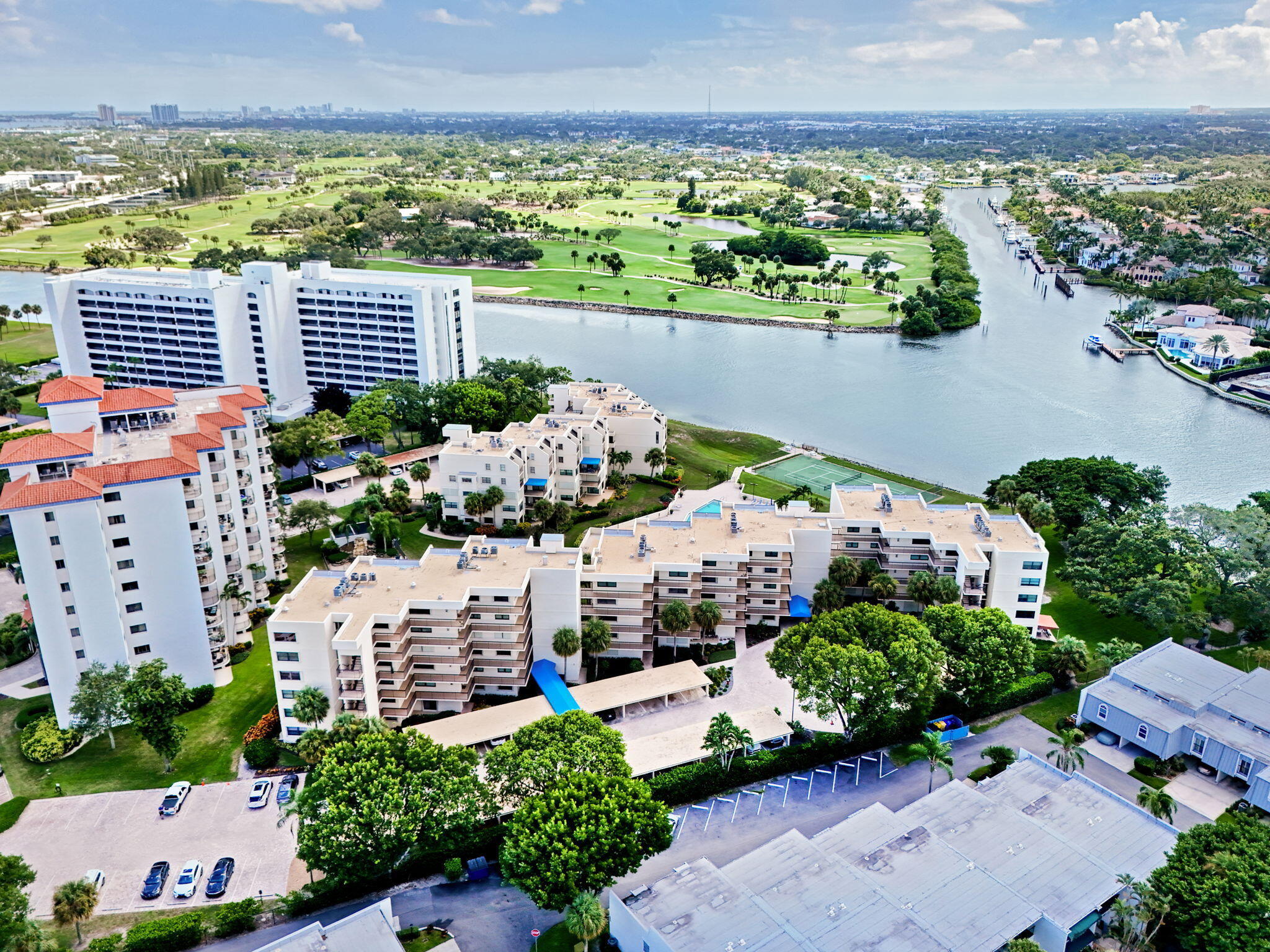 Spacious 2000+ sq. ft. corner unit overlooking the intracoastal, pool & North Palm Golf Course. Watch the boats go by and beautiful sunsets. Available fully furnished. Large rooms including a 20 x 14 foot primary bedroom, 21 x 14 foot living room and a 21 x 12 foot family room. Both bedrooms have large walk in closets and remodeled showers and the primary has double vanities. Washer & Dryer in the unit. Condo features Pool & Tennis. Accordion hurricane shutters for quick & easy protection from storms.Only 3 miles to the beach and walking distance to shopping & restaurants. New roof in 2024. Structural engineering inspections completed.