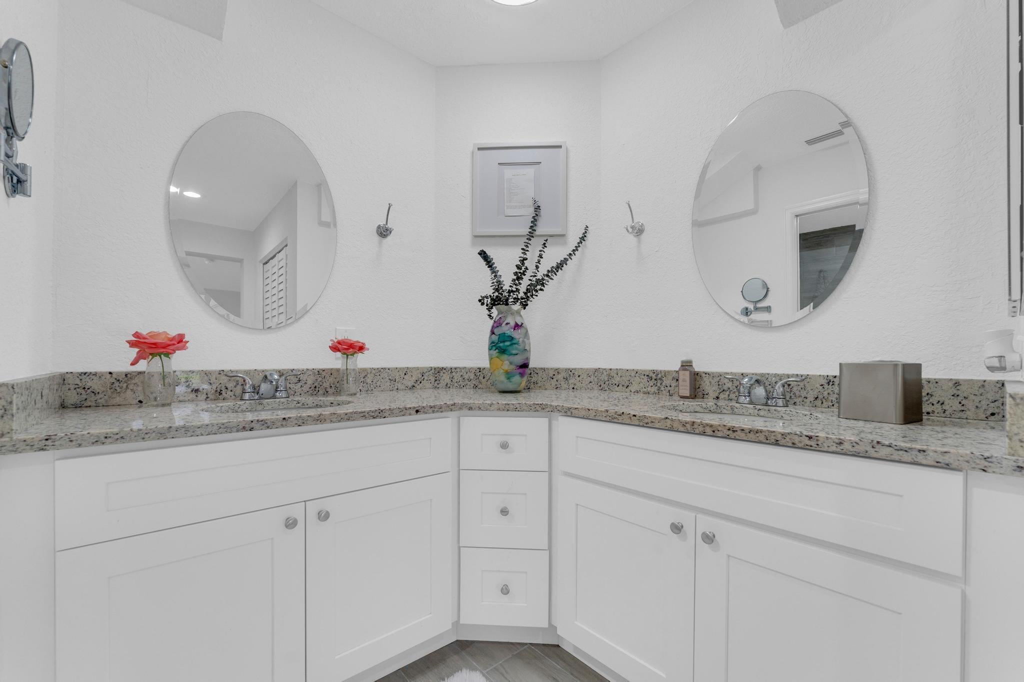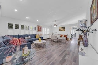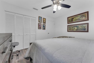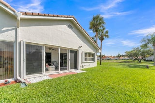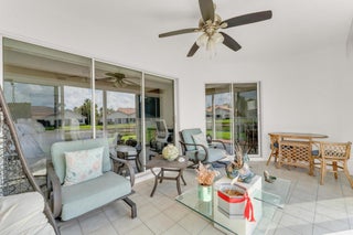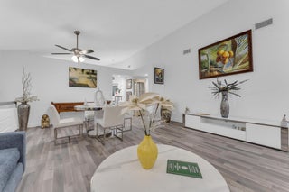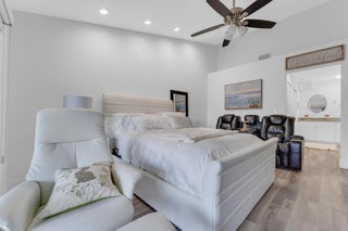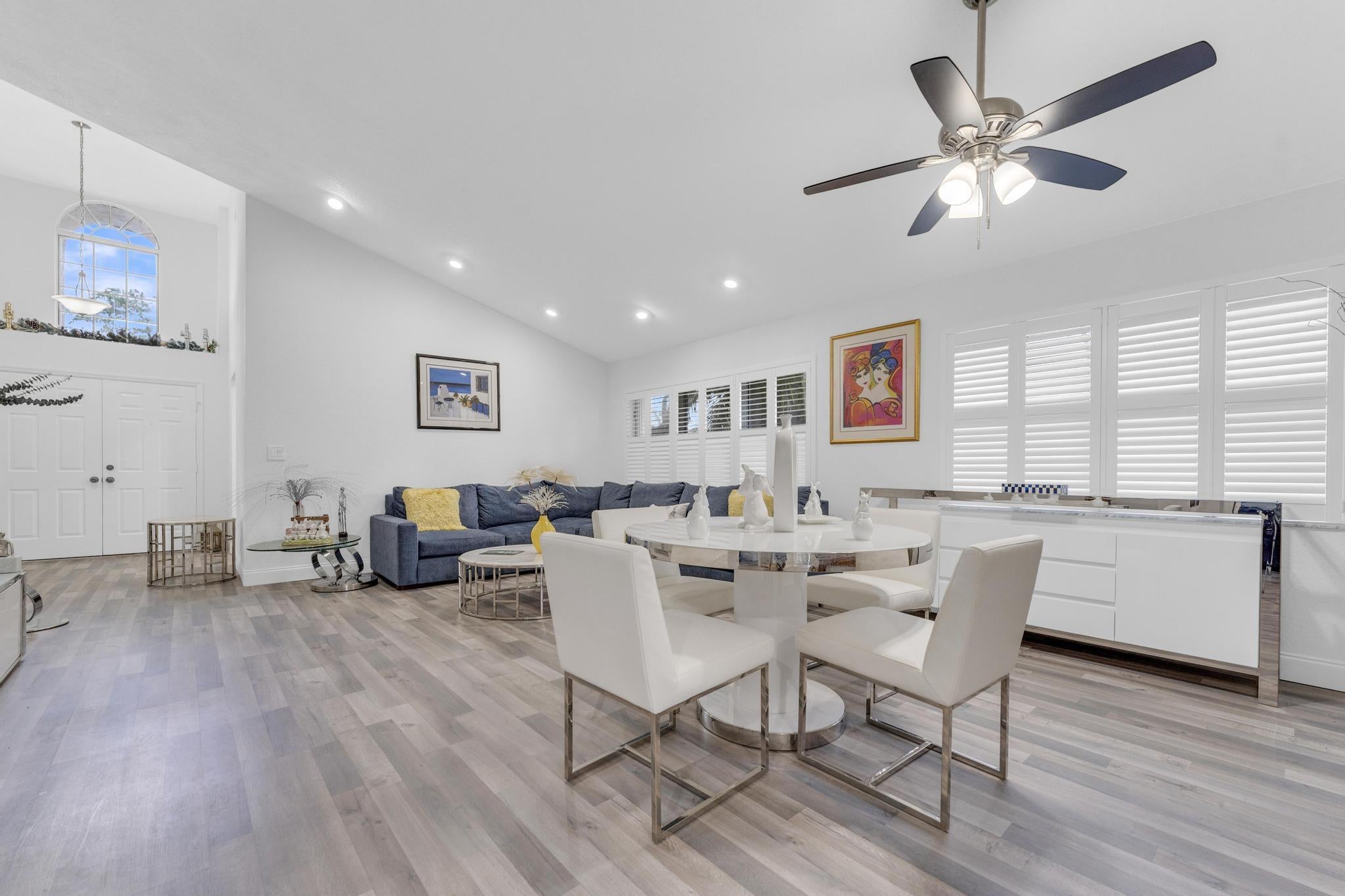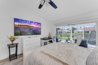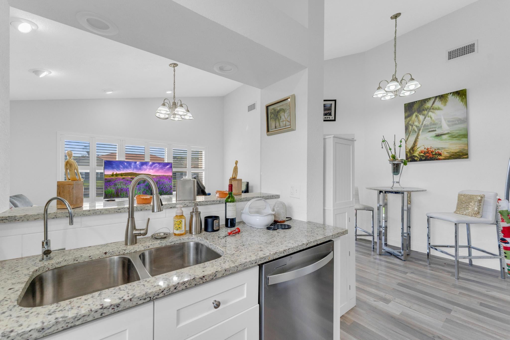 Beautifully updated and turnkey 2-bedroom, 2-bathroom villa with a 1-car garage and stunning lake view. Updates include newer kitchen cabinets with granite countertops, plantation shutters throughout, and impact glass on sliders and kitchen windows. The primary bathroom features dual sinks and granite countertops. Enjoy newer bathroom vanities, tile wainscots, toilets, wood and tile flooring, light fixtures, and hardware throughout. Vaulted ceilings and large windows add character. The owner offers a 1-year guarantee on all appliances. The front yard is professionally landscaped. Includes a pantry, his and her closets, and a coat closet. The roof is from 2024. Enclosed patio area with lake view. 55+ community close to shops, highways, and entertainment.