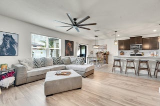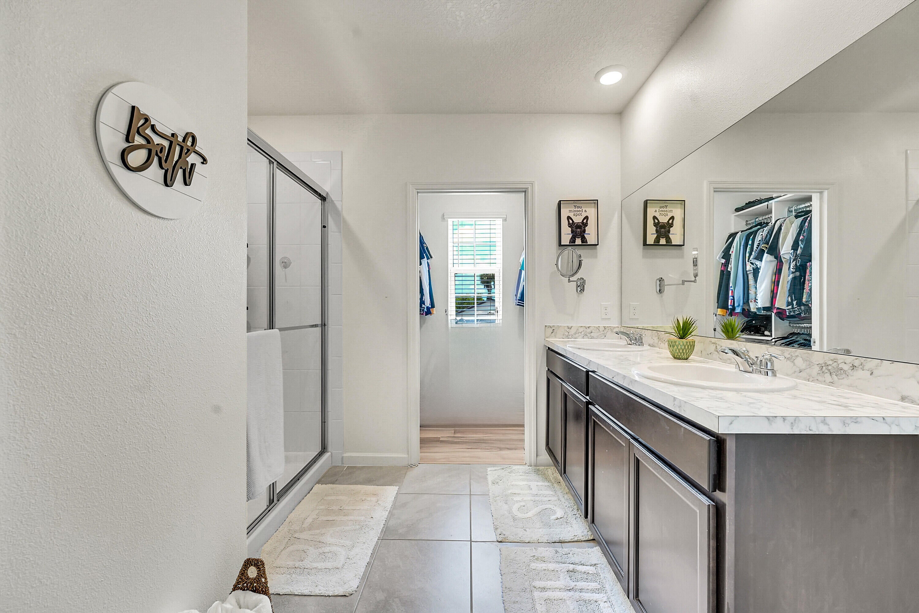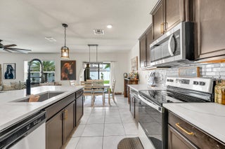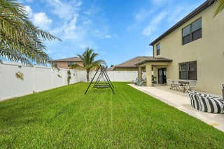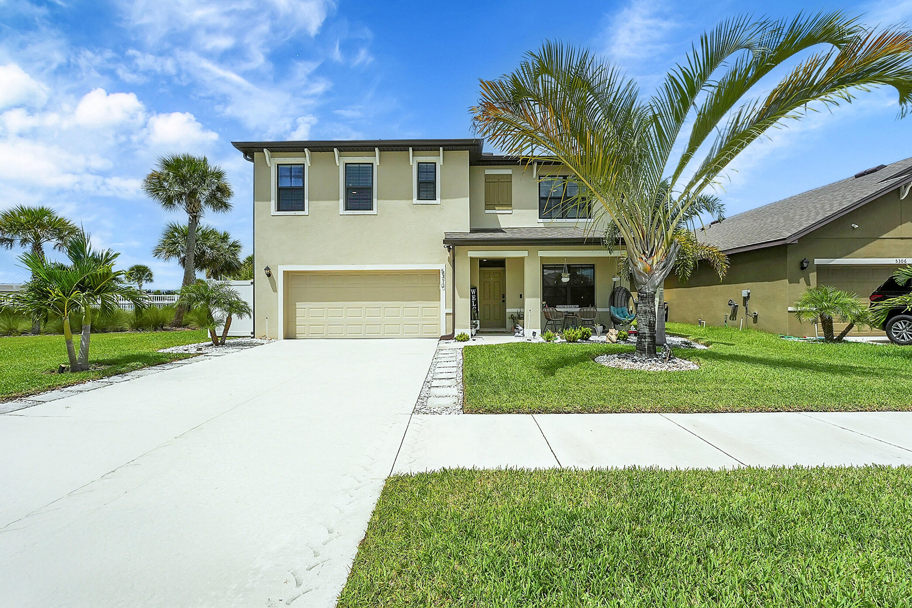 Immaculate two-story home with concrete block construction on both floors! This plan offers a flex room that could be an office. Central living room and open concept kitchen with Quartz countertops, extended island and complete the main level. Duravana waterproof flooring and tiles throughout the house. Upstairs has a generous owner's suite with full bath, loft area that could be an office or entertainment room and the laundry room simplifies an everyday chore! Epoxy coating flooring in the garage and porch of the house. The patio was extended and fenced with fruit trees like Coco Dwarf (refers to a specific type of coconut tree that is smaller in size, it typically reaches heights of 25-60 feet and Sylvestre. St. Augustin grass, that is vividly green, ideal for lawns in hotter climate