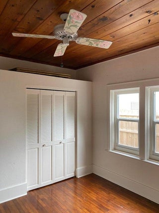 Charming single family home with lots of character in pristine condition. Hardwood floors just refinished in dining and living room. Large kitchen with Island, separate laundry room with newer washer and dryer. The primary bedroom is spacious with a walk-in closet. The entrance way is a separate room with a closet, great space for an office or guest area. House has been painted and refreshed. Huge, fenced yard, off the street parking. Windows & doors are impact glass. This house is a great find. Garage in the back is Not included. Owners use for storage. Lawn care is tenants responsibility.