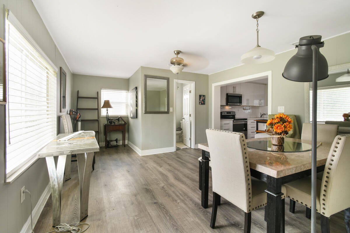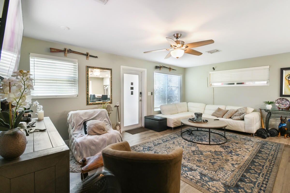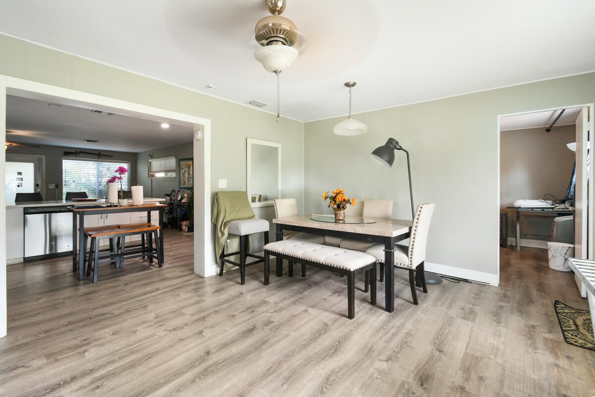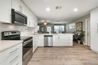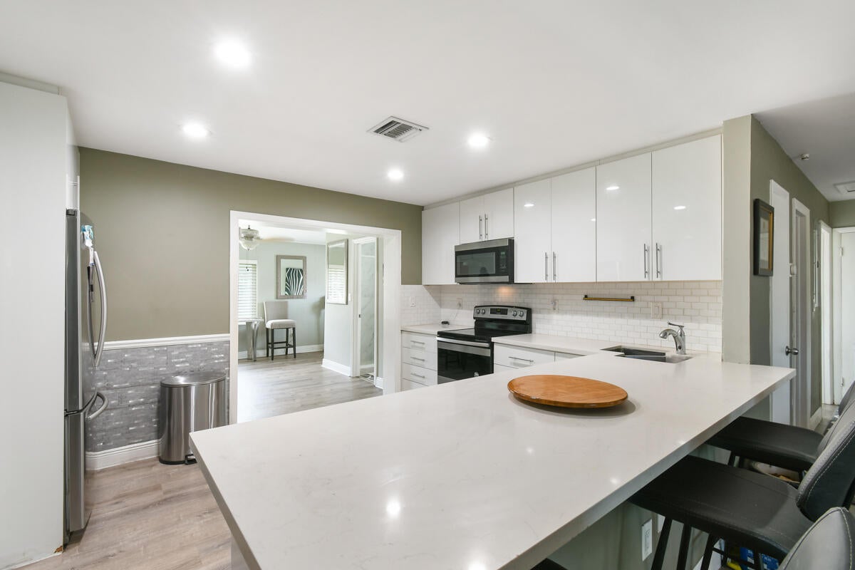 Enjoy comfortable living in this cozy home featuring a stylish kitchen with quartz counter tops & ample cabinetry, modern updated bathrooms, a large family/dining room, laminate flooring throughout, metal roof, impact windows and a newer a/c. Plus a separate laundry room, a covered, screened patio and the property is completely fenced. Third bedroom has no closet. No HOA. Ideally located in Palm Beach Gardens close to shopping, restaurants and freeways.