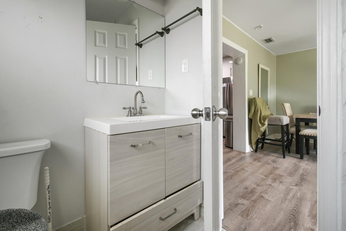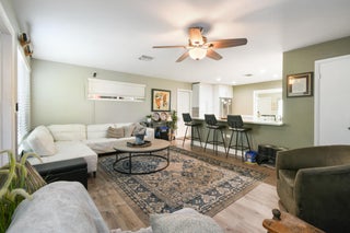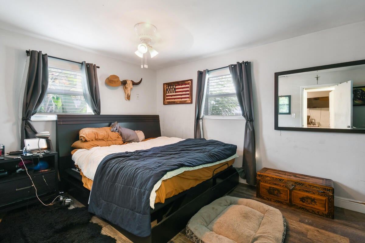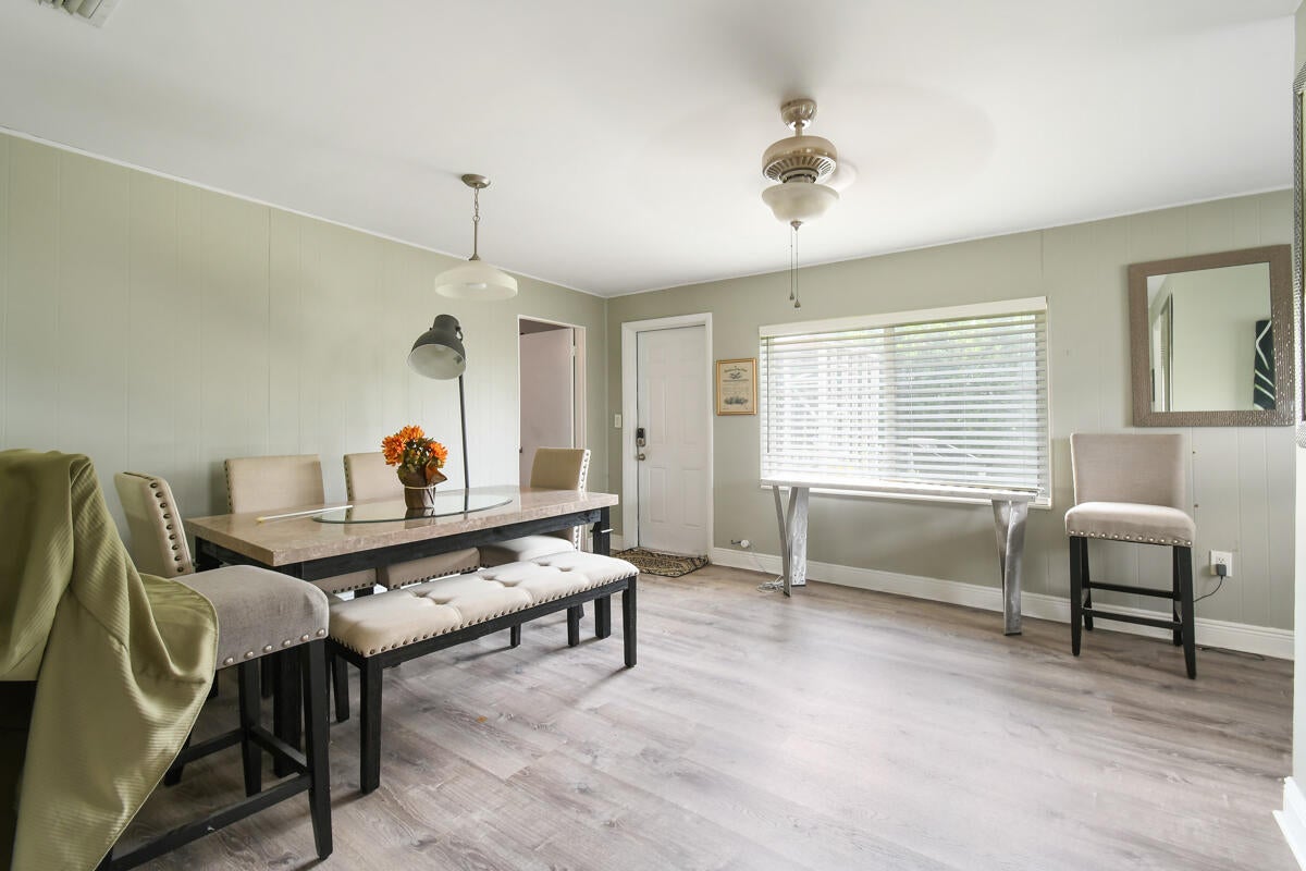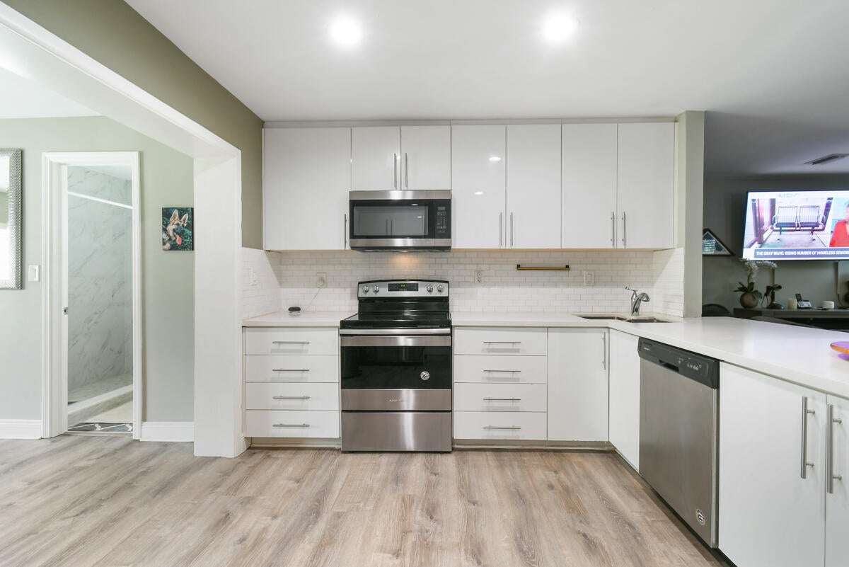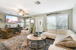 Enjoy comfortable living in this cozy home featuring a stylish kitchen with quartz counter tops & ample cabinetry, modern updated bathrooms, a large family/dining room, laminate flooring throughout, metal roof, impact windows and a newer a/c. Plus a separate laundry room, a covered, screened patio and the property is completely fenced. Third bedroom has no closet. No HOA. Ideally located in Palm Beach Gardens close to shopping, restaurants and freeways.