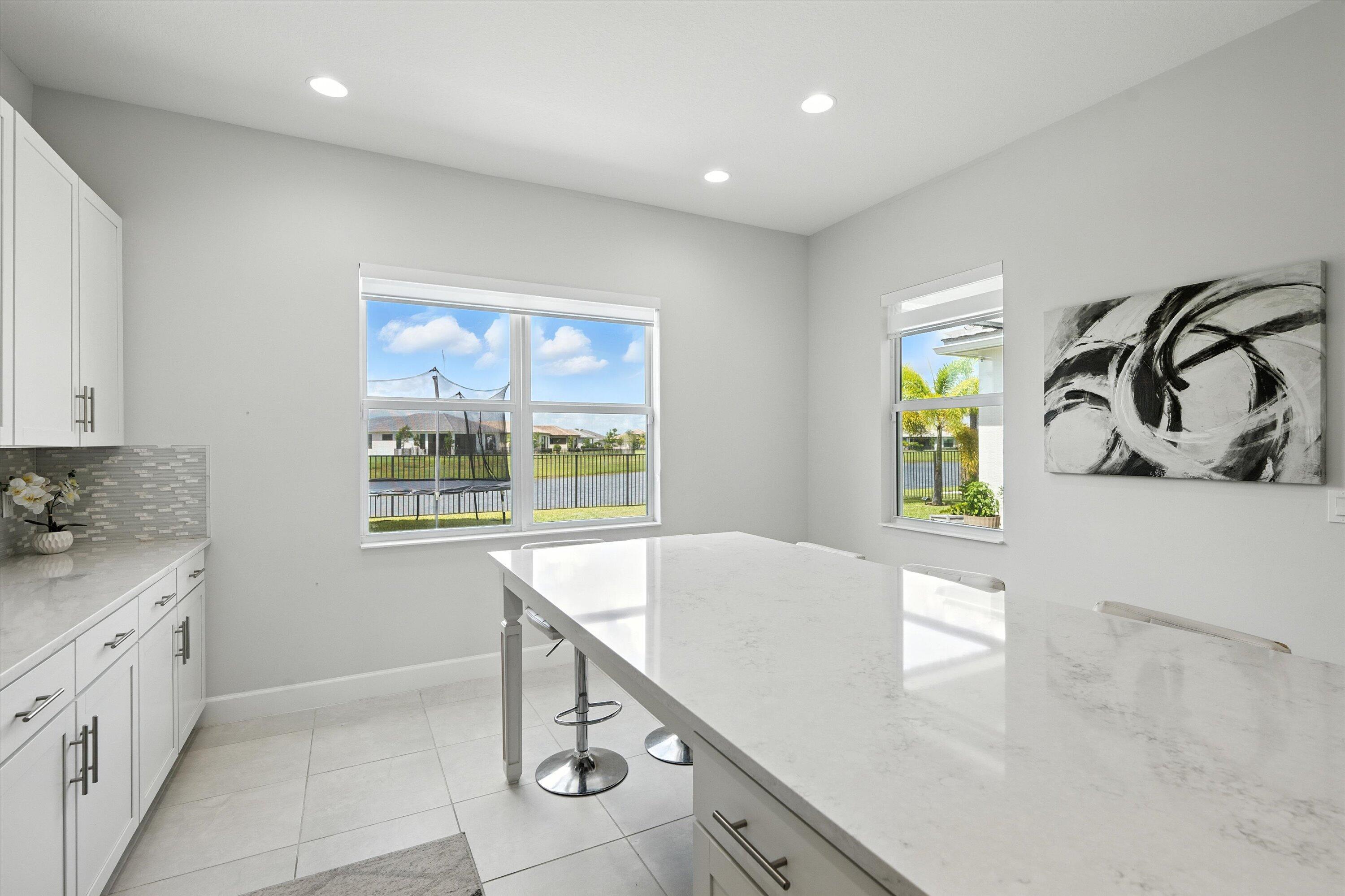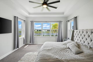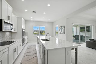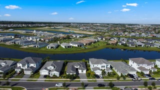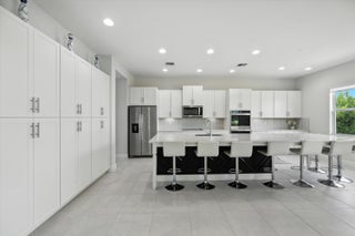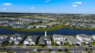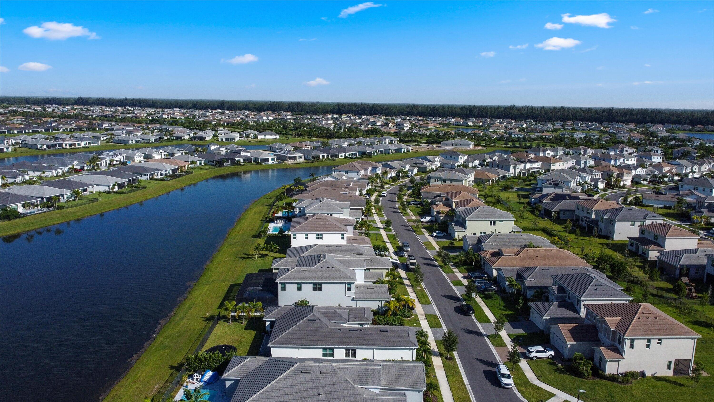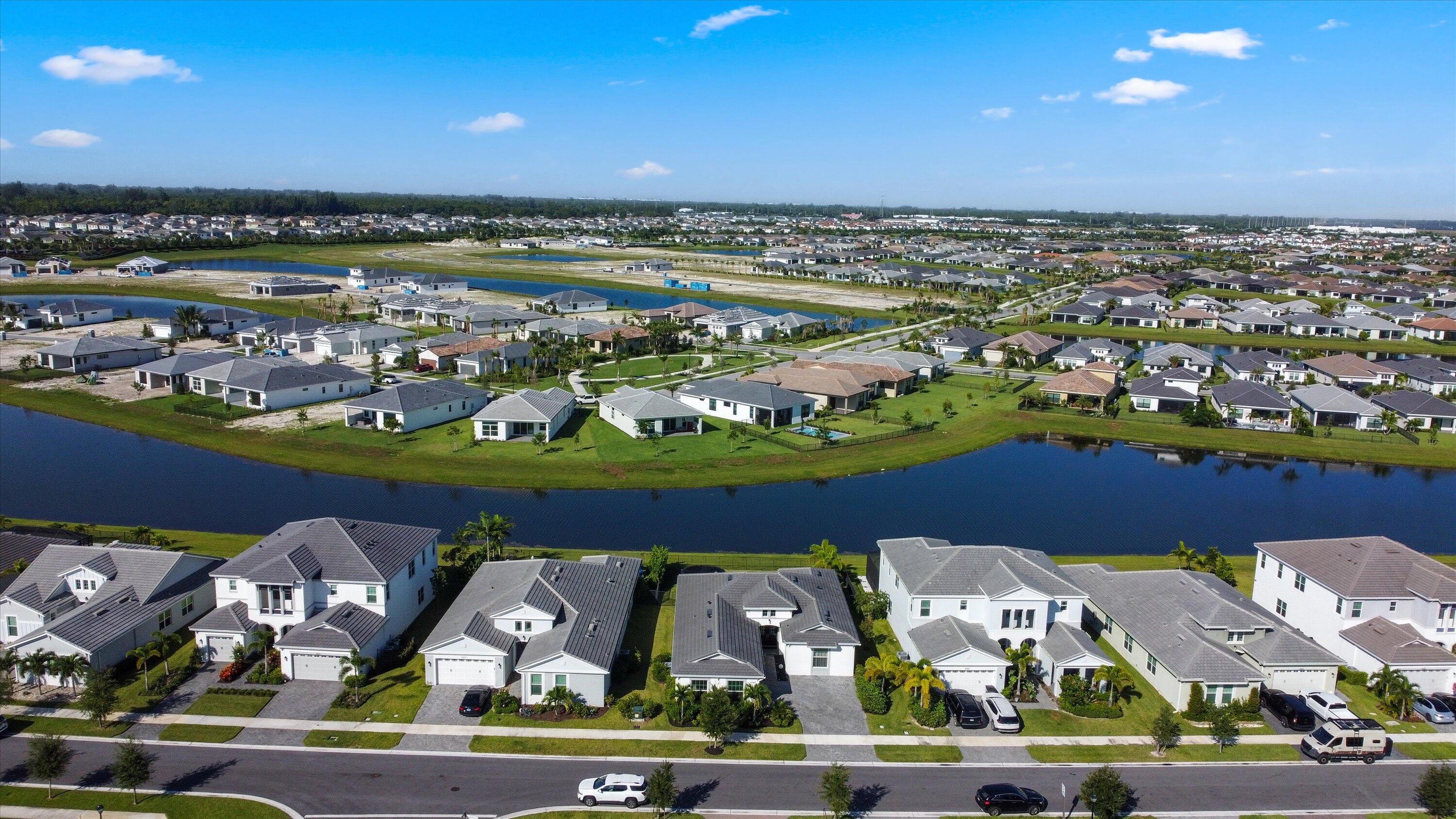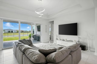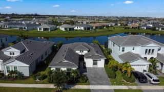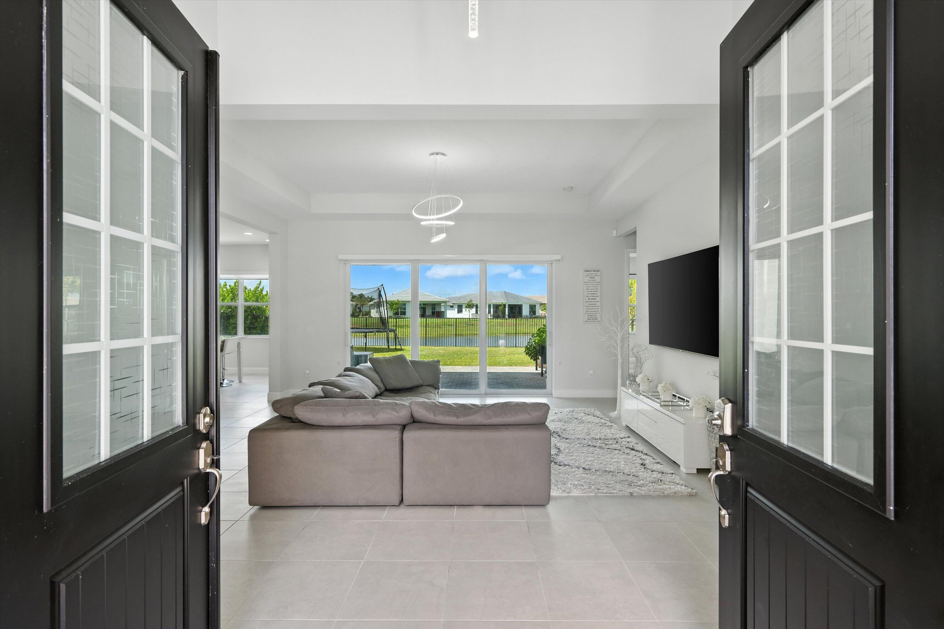 Welcome to this stunning Sandhill model in the desirable Orchards community of Westlake. Offering 3 bedrooms, PLUS a den/office, 3 bathrooms, and a 2-car garage, this home spans 2,410 sq. ft. of thoughtfully designed living space and sits on a beautiful lake view lot. From the moment you arrive, the curb appeal stands out with modern black double doors that open to a bright and inviting interior. White walls and tile flooring flow throughout the main living areas, creating a fresh and airy atmosphere. The living room is filled with natural light thanks to expansive sliding glass doors that frame the picturesque lake views.The gourmet kitchen is a true centerpiece, showcasing white shaker cabinets, an abundance of storage, quartz countertops, a stylish backsplash, stainless steel appliances including double wall ovens, recessed lighting, and a long extended island with seating for up to 10 guests. Just off the kitchen, the formal dining room provides an elegant setting with its spacious design and bold black accent wall. The owner's suite is generously sized with multiple windows that bathe the room in light and features carpet flooring, walk-in closets, and a spa-like bathroom with white shaker cabinetry, granite countertops, dual sinks, and a glass-enclosed shower. The second bedroom is a private ensuite with its own bathroom offering granite counters, white cabinetry, and a shower-tub combination. The third bedroom is conveniently located near a full guest bath, appointed with quartz countertops, white shaker cabinets, and a shower. The home also includes a spacious den/office with upgraded modern double black doors and tile flooring, as well as a laundry room with Whirlpool appliances. Outdoor living is equally impressive with a covered lanai featuring a motorized screen enclosure, extended paver patio, and a fenced backyard with ample space for a pool all while enjoying serene lake views. With full impact windows throughout, this home combines style, comfort, and peace of mind in one perfect package.