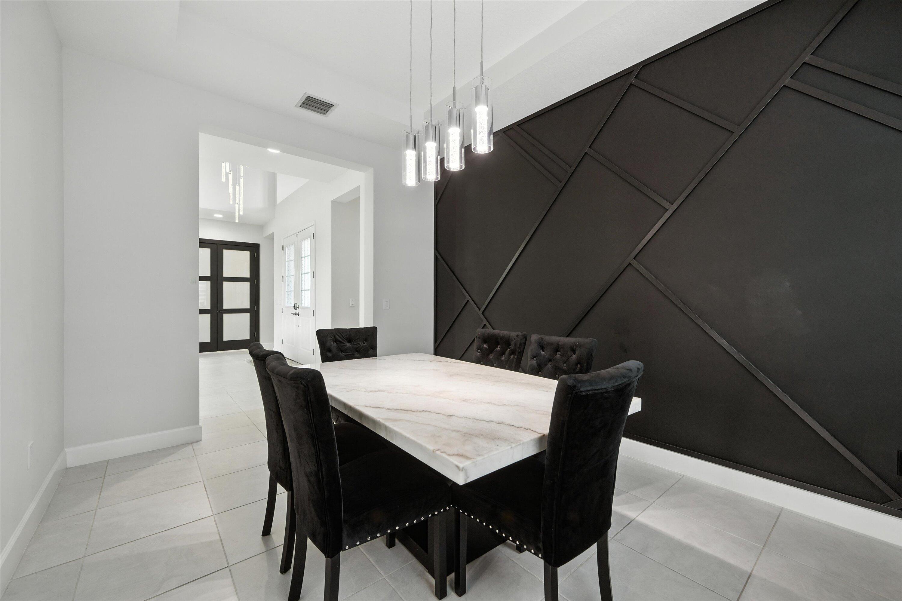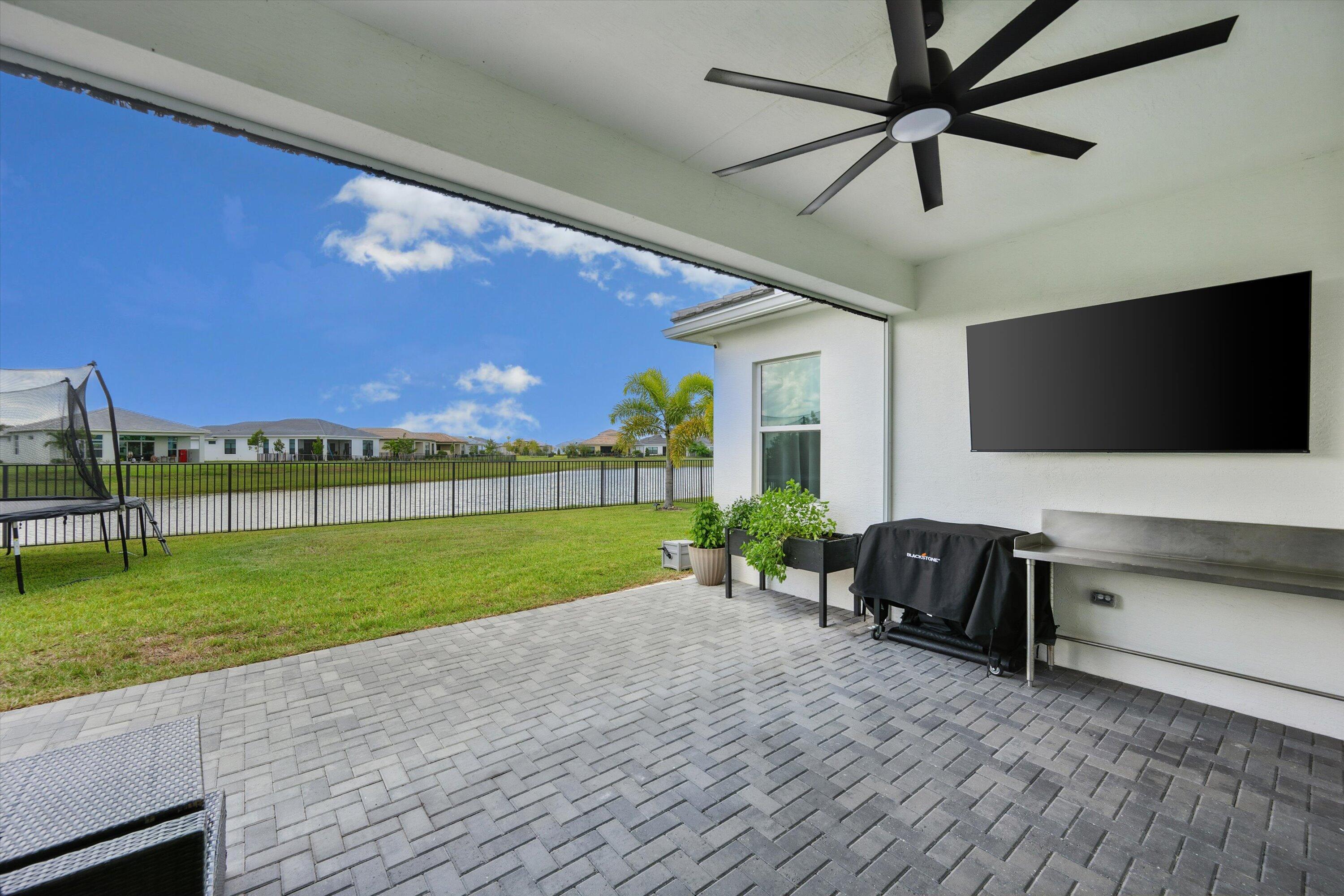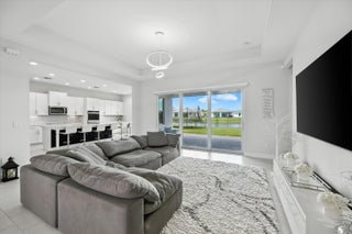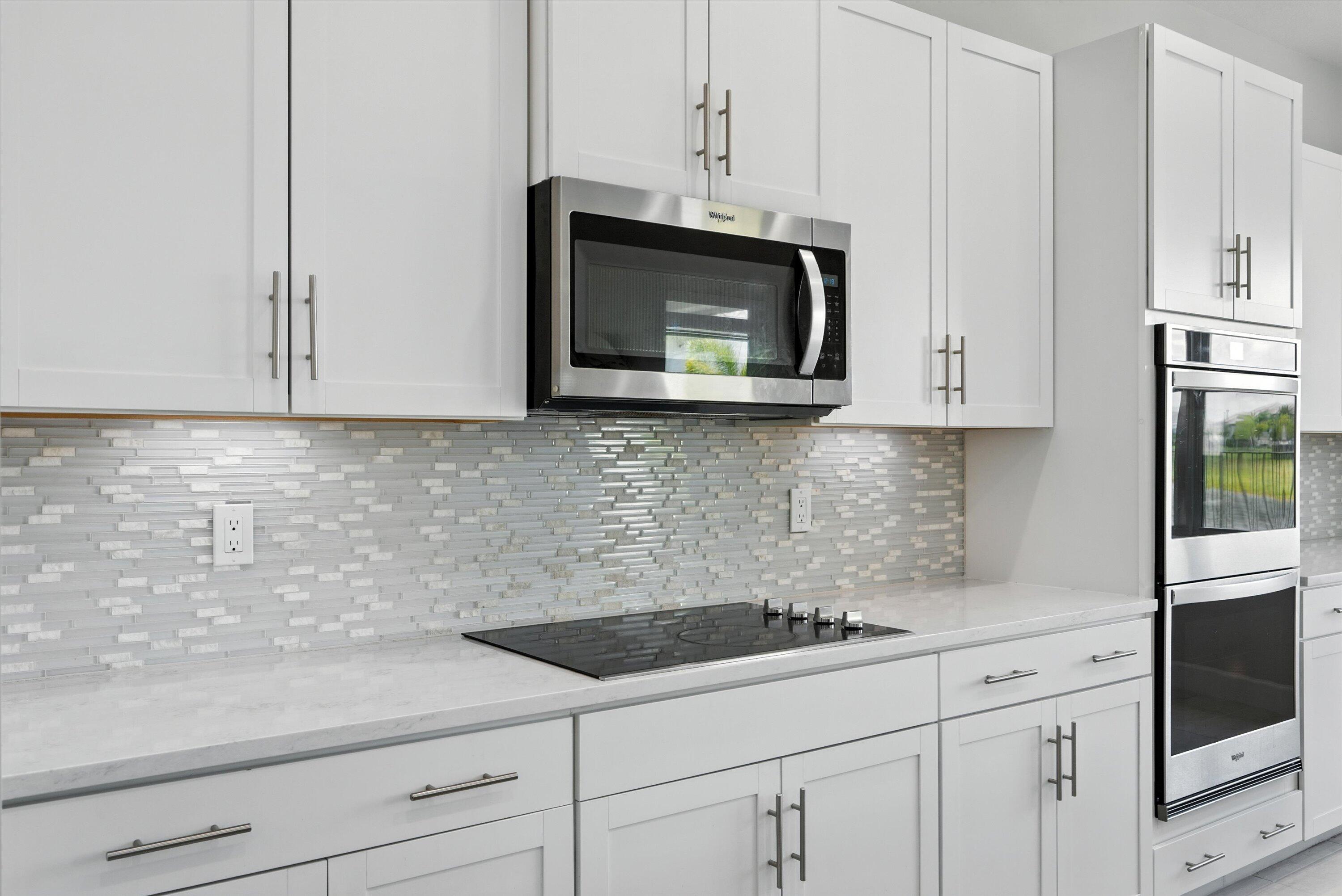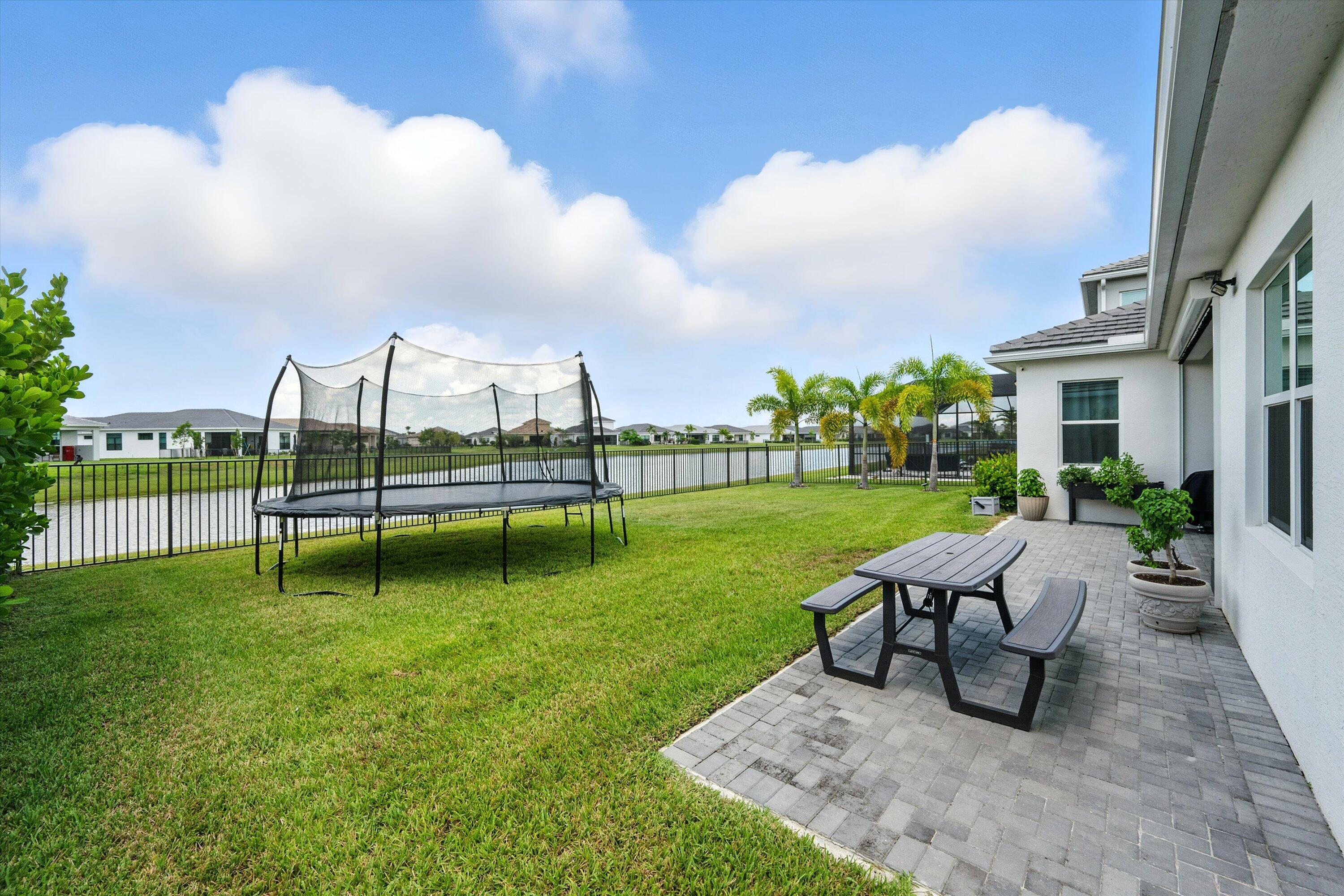 Welcome to this stunning Sandhill model in the desirable Orchards community of Westlake. Offering 3 bedrooms, PLUS a den/office, 3 bathrooms, and a 2-car garage, this home spans 2,410 sq. ft. of thoughtfully designed living space and sits on a beautiful lake view lot. From the moment you arrive, the curb appeal stands out with modern black double doors that open to a bright and inviting interior. White walls and tile flooring flow throughout the main living areas, creating a fresh and airy atmosphere. The living room is filled with natural light thanks to expansive sliding glass doors that frame the picturesque lake views.The gourmet kitchen is a true centerpiece, showcasing white shaker cabinets, an abundance of storage, quartz countertops, a stylish backsplash, stainless steel appliances including double wall ovens, recessed lighting, and a long extended island with seating for up to 10 guests. Just off the kitchen, the formal dining room provides an elegant setting with its spacious design and bold black accent wall. The owner's suite is generously sized with multiple windows that bathe the room in light and features carpet flooring, walk-in closets, and a spa-like bathroom with white shaker cabinetry, granite countertops, dual sinks, and a glass-enclosed shower. The second bedroom is a private ensuite with its own bathroom offering granite counters, white cabinetry, and a shower-tub combination. The third bedroom is conveniently located near a full guest bath, appointed with quartz countertops, white shaker cabinets, and a shower. The home also includes a spacious den/office with upgraded modern double black doors and tile flooring, as well as a laundry room with Whirlpool appliances. Outdoor living is equally impressive with a covered lanai featuring a motorized screen enclosure, extended paver patio, and a fenced backyard with ample space for a pool all while enjoying serene lake views. With full impact windows throughout, this home combines style, comfort, and peace of mind in one perfect package.