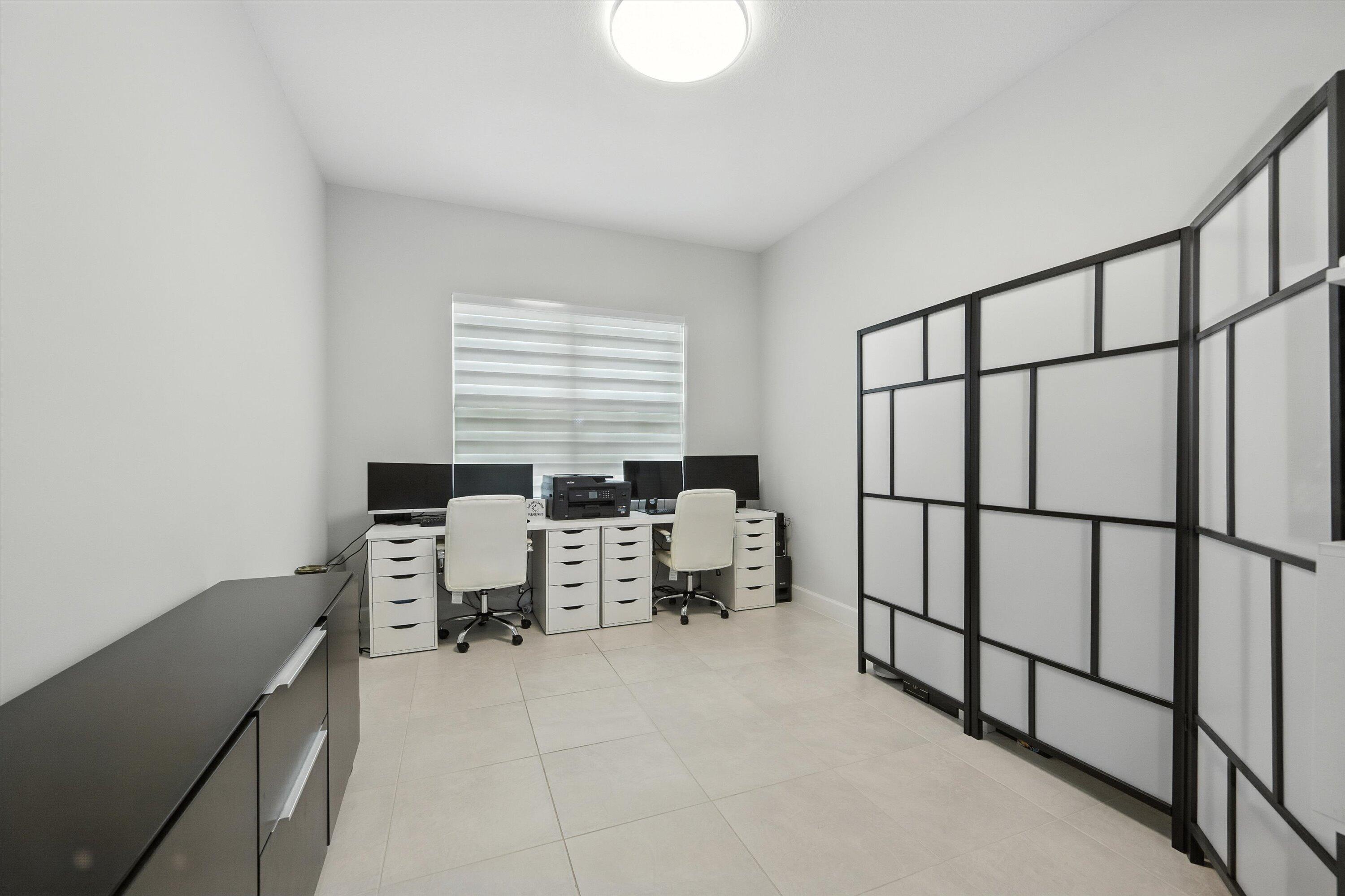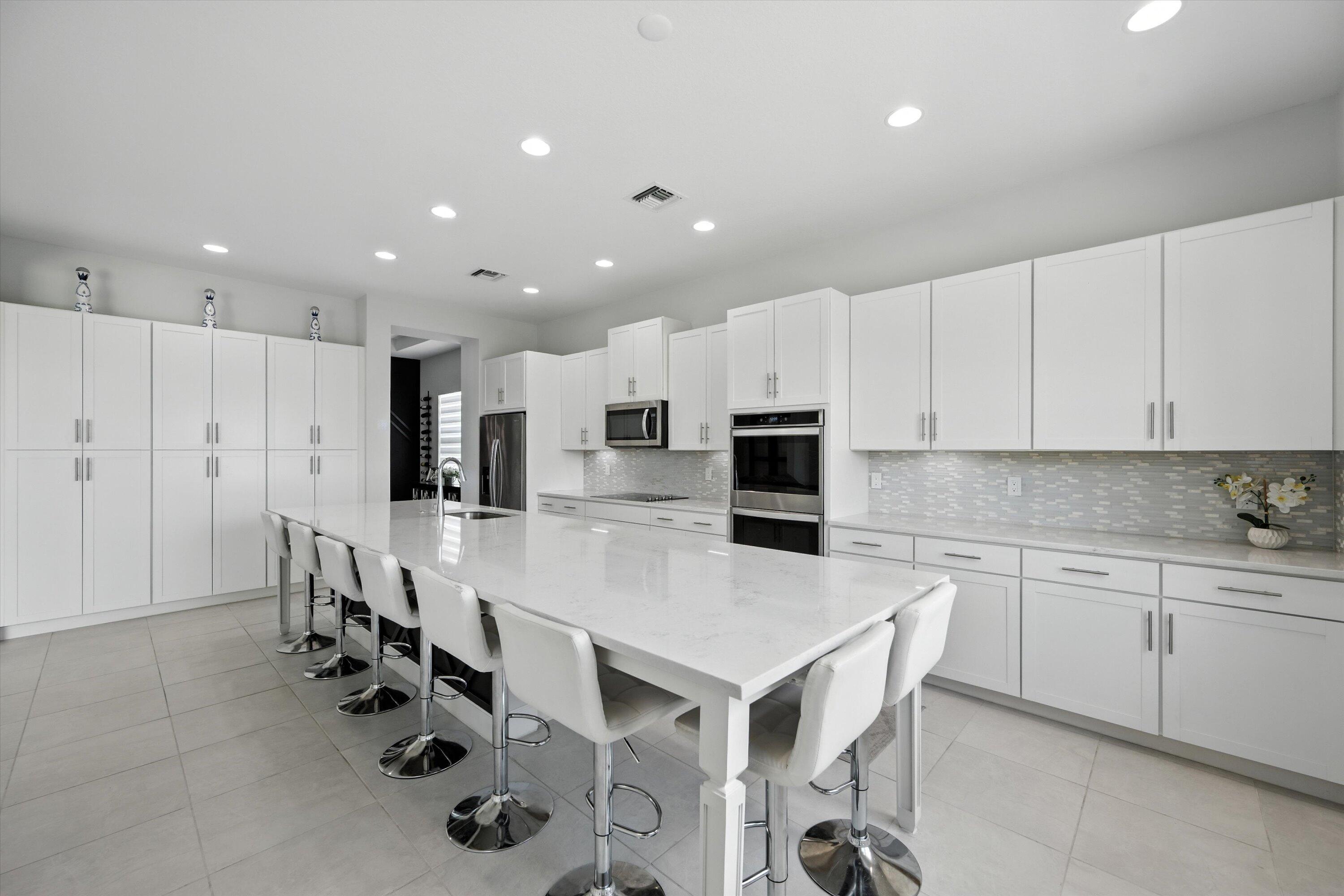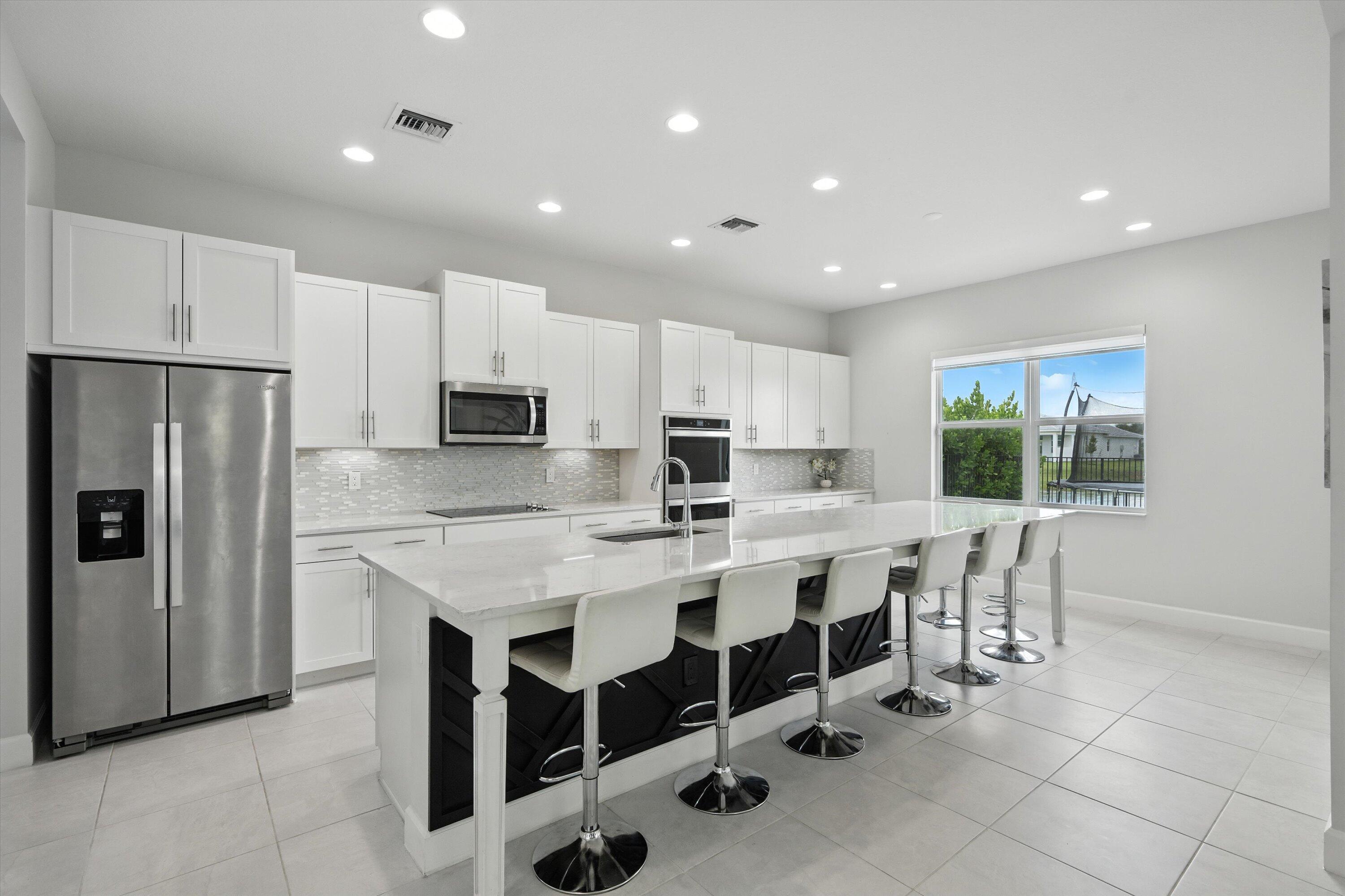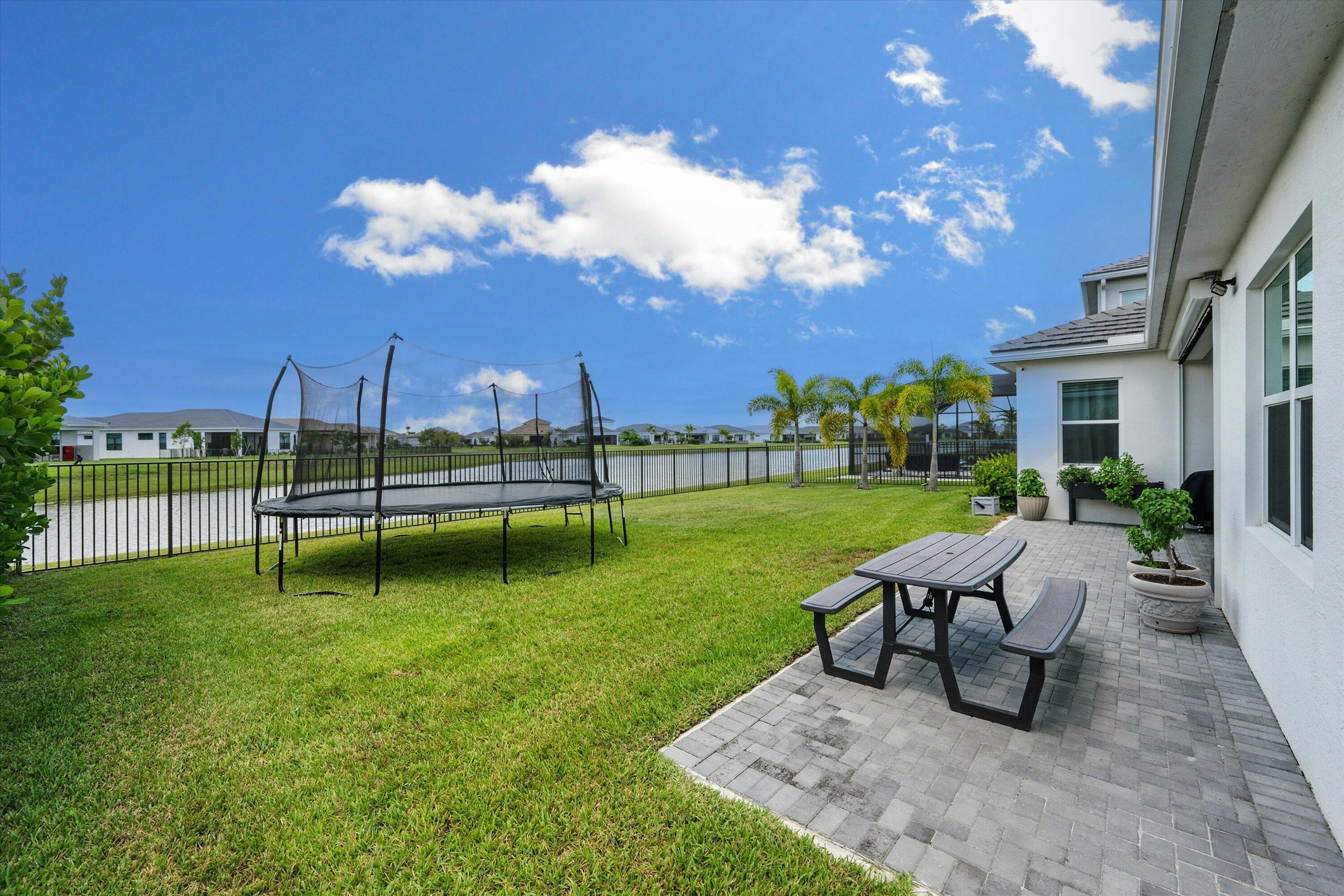 Welcome to this stunning Sandhill model in the desirable Orchards community of Westlake. Offering 3 bedrooms, PLUS a den/office, 3 bathrooms, and a 2-car garage, this home spans 2,410 sq. ft. of thoughtfully designed living space and sits on a beautiful lake view lot. From the moment you arrive, the curb appeal stands out with modern black double doors that open to a bright and inviting interior. White walls and tile flooring flow throughout the main living areas, creating a fresh and airy atmosphere. The living room is filled with natural light thanks to expansive sliding glass doors that frame the picturesque lake views.The gourmet kitchen is a true centerpiece, showcasing white shaker cabinets, an abundance of storage, quartz countertops, a stylish backsplash, stainless steel appliances including double wall ovens, recessed lighting, and a long extended island with seating for up to 10 guests. Just off the kitchen, the formal dining room provides an elegant setting with its spacious design and bold black accent wall. The owner's suite is generously sized with multiple windows that bathe the room in light and features carpet flooring, walk-in closets, and a spa-like bathroom with white shaker cabinetry, granite countertops, dual sinks, and a glass-enclosed shower. The second bedroom is a private ensuite with its own bathroom offering granite counters, white cabinetry, and a shower-tub combination. The third bedroom is conveniently located near a full guest bath, appointed with quartz countertops, white shaker cabinets, and a shower. The home also includes a spacious den/office with upgraded modern double black doors and tile flooring, as well as a laundry room with Whirlpool appliances. Outdoor living is equally impressive with a covered lanai featuring a motorized screen enclosure, extended paver patio, and a fenced backyard with ample space for a pool all while enjoying serene lake views. With full impact windows throughout, this home combines style, comfort, and peace of mind in one perfect package.