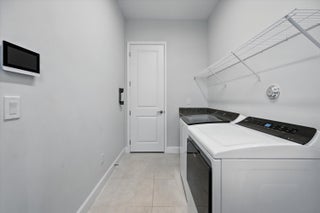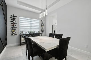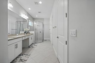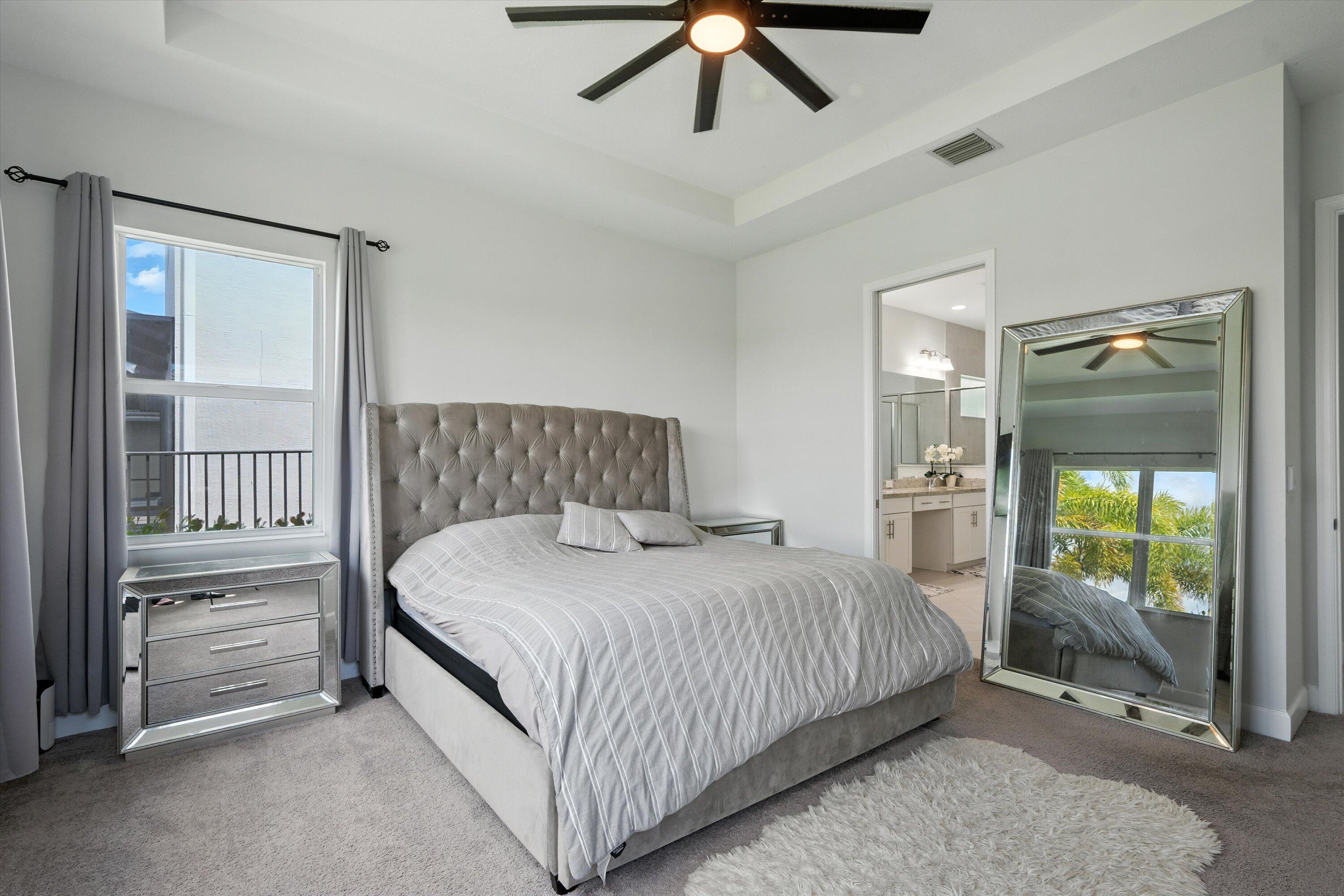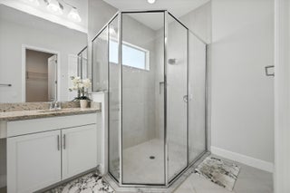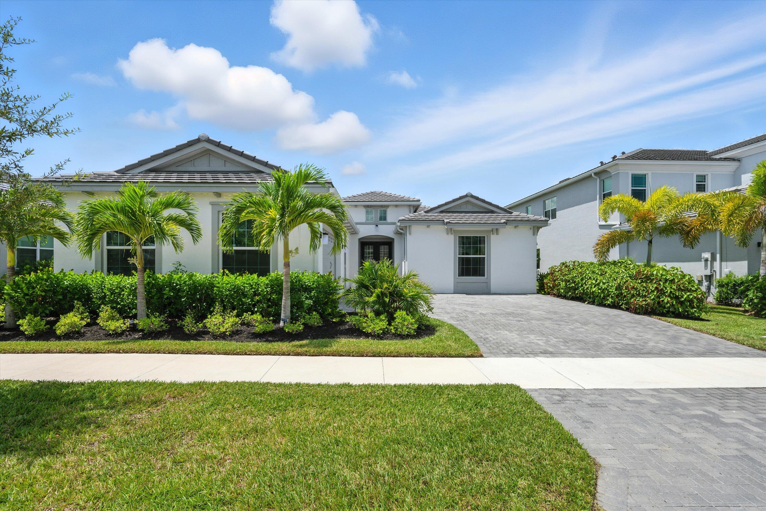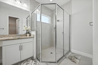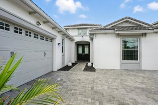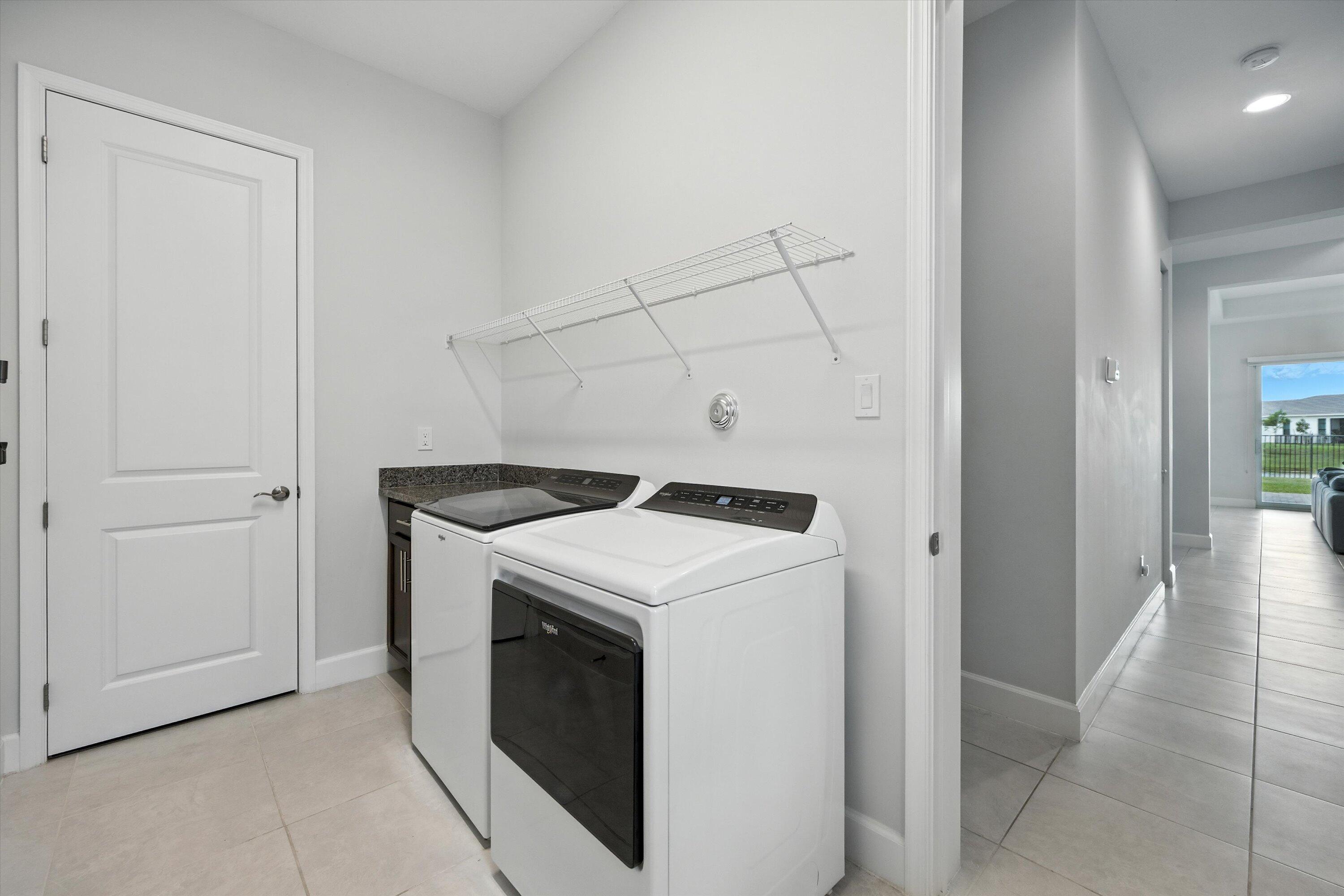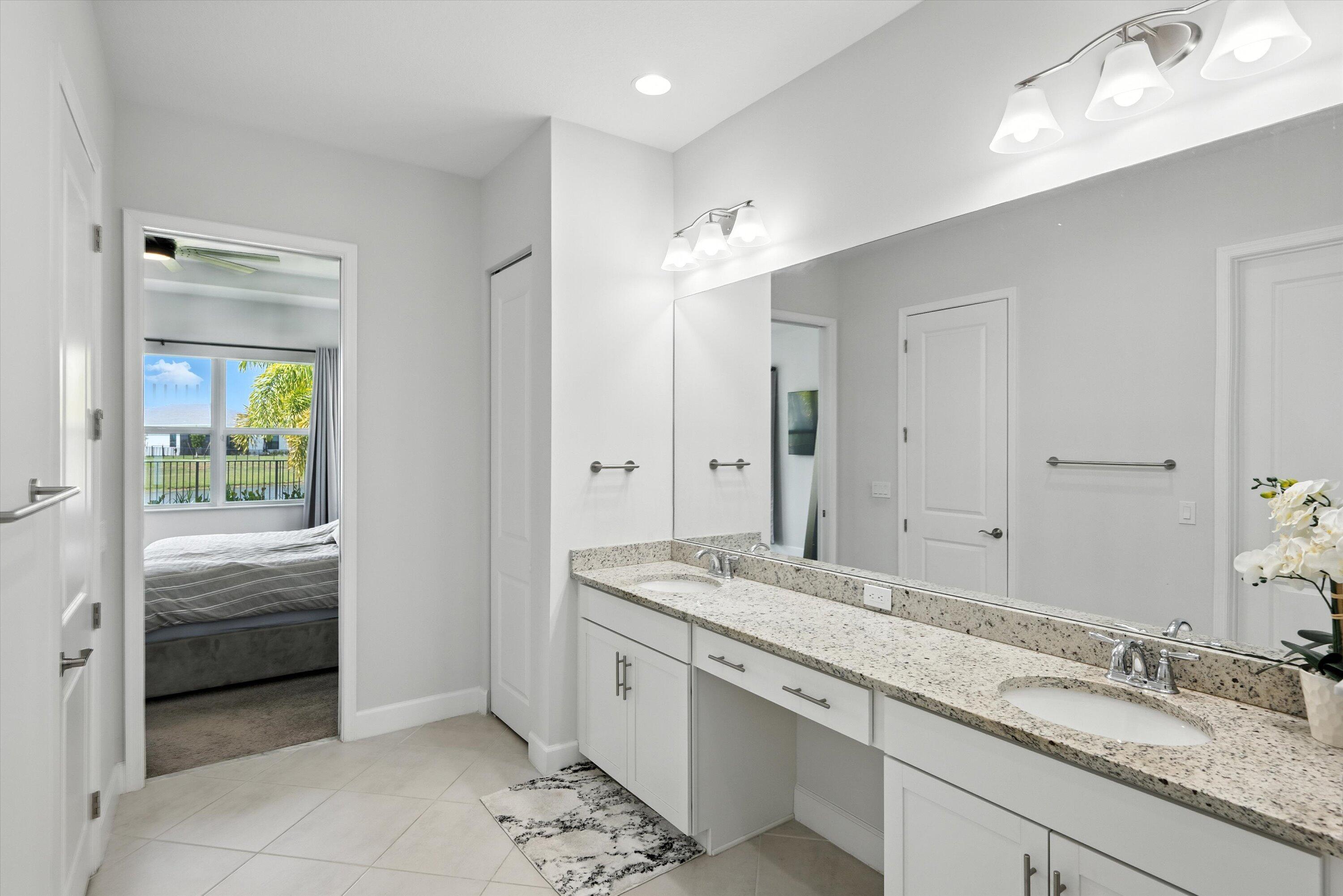 Welcome to this stunning Sandhill model in the desirable Orchards community of Westlake. Offering 3 bedrooms, PLUS a den/office, 3 bathrooms, and a 2-car garage, this home spans 2,410 sq. ft. of thoughtfully designed living space and sits on a beautiful lake view lot. From the moment you arrive, the curb appeal stands out with modern black double doors that open to a bright and inviting interior. White walls and tile flooring flow throughout the main living areas, creating a fresh and airy atmosphere. The living room is filled with natural light thanks to expansive sliding glass doors that frame the picturesque lake views.The gourmet kitchen is a true centerpiece, showcasing white shaker cabinets, an abundance of storage, quartz countertops, a stylish backsplash, stainless steel appliances including double wall ovens, recessed lighting, and a long extended island with seating for up to 10 guests. Just off the kitchen, the formal dining room provides an elegant setting with its spacious design and bold black accent wall. The owner's suite is generously sized with multiple windows that bathe the room in light and features carpet flooring, walk-in closets, and a spa-like bathroom with white shaker cabinetry, granite countertops, dual sinks, and a glass-enclosed shower. The second bedroom is a private ensuite with its own bathroom offering granite counters, white cabinetry, and a shower-tub combination. The third bedroom is conveniently located near a full guest bath, appointed with quartz countertops, white shaker cabinets, and a shower. The home also includes a spacious den/office with upgraded modern double black doors and tile flooring, as well as a laundry room with Whirlpool appliances. Outdoor living is equally impressive with a covered lanai featuring a motorized screen enclosure, extended paver patio, and a fenced backyard with ample space for a pool all while enjoying serene lake views. With full impact windows throughout, this home combines style, comfort, and peace of mind in one perfect package.