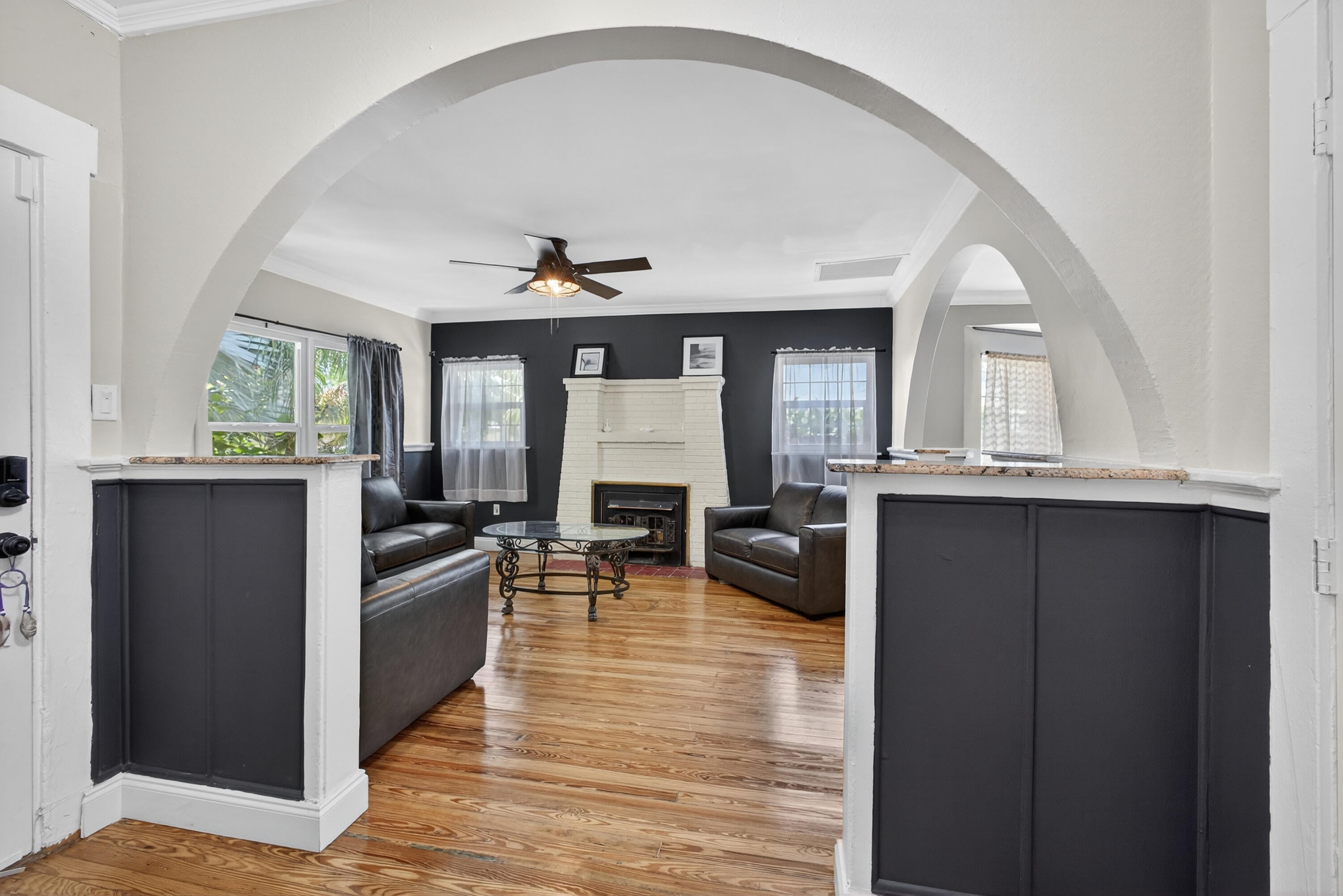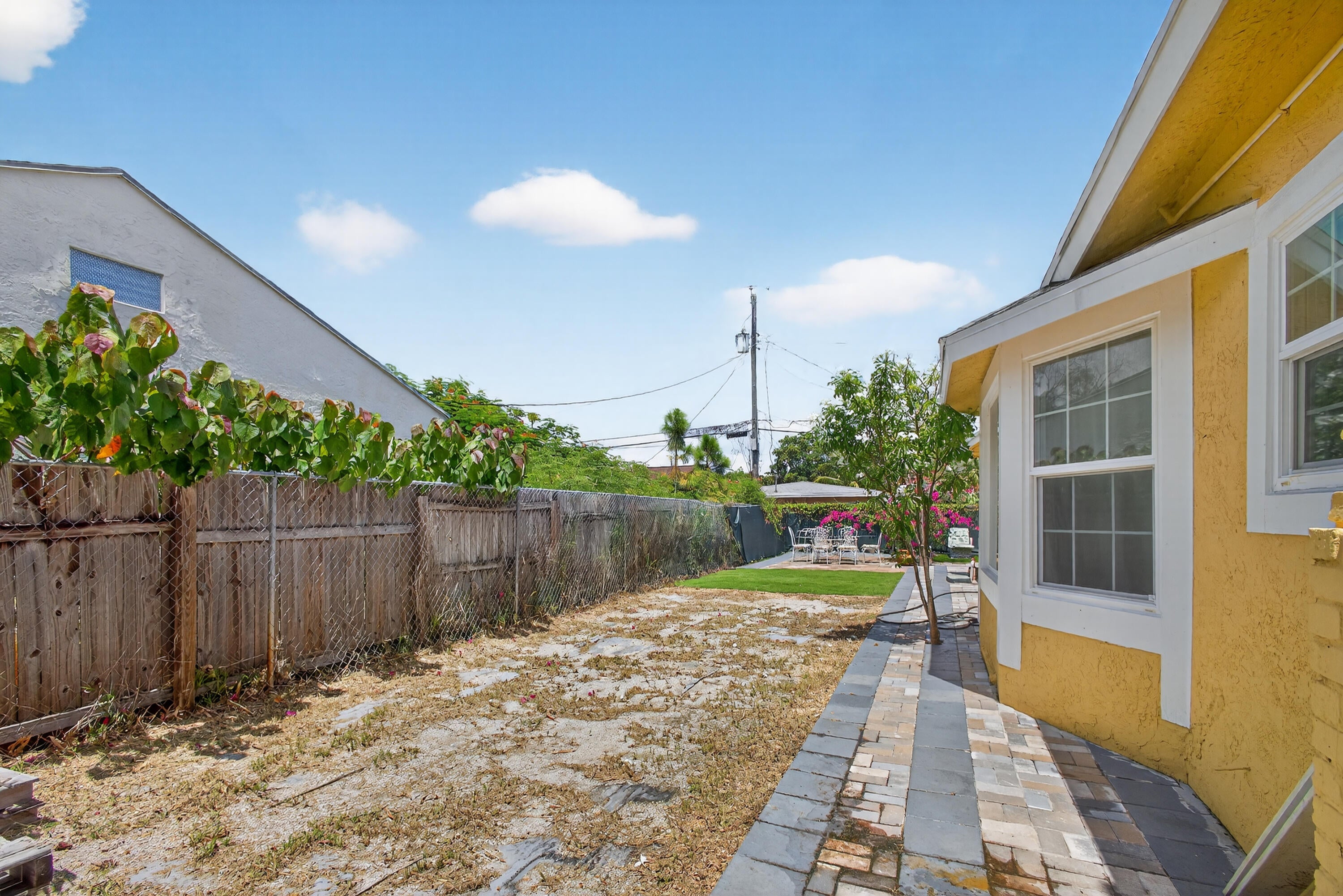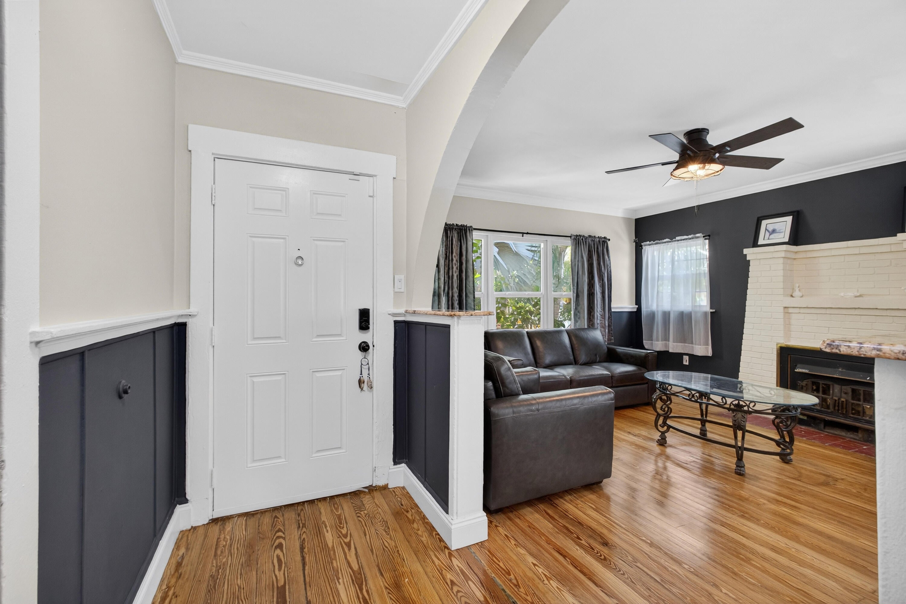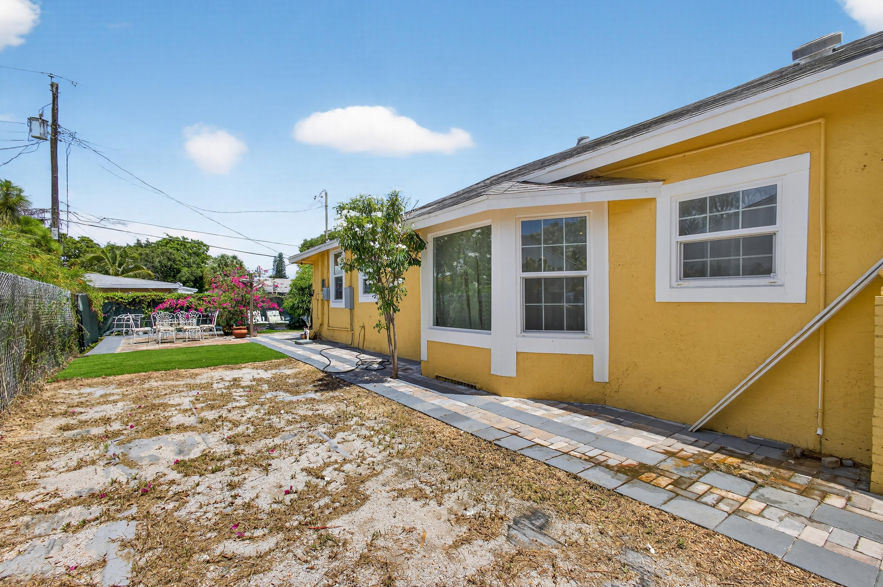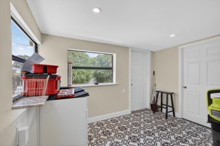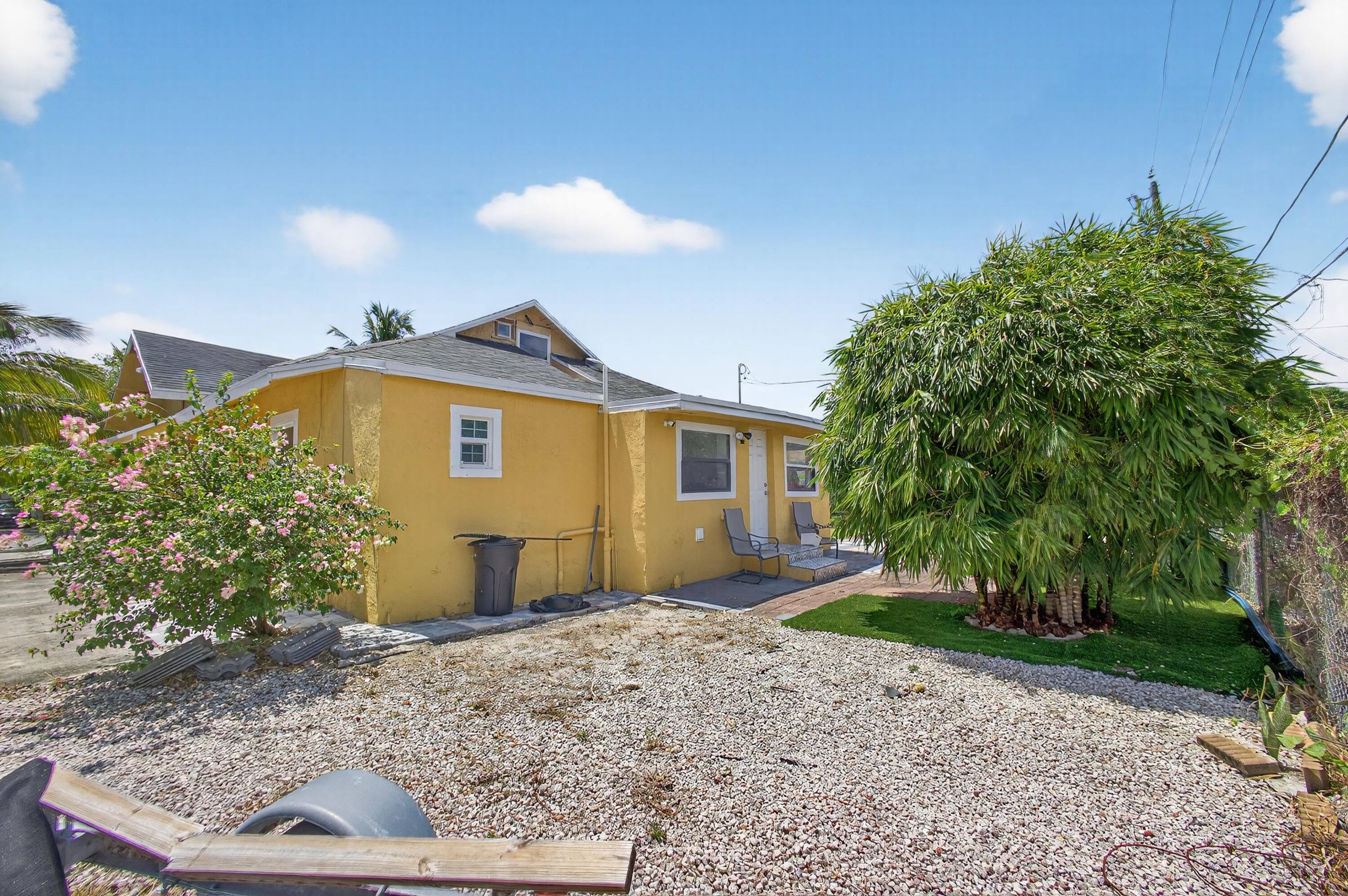 This charming home is a 3bed/3bath with numerous updates including impact windows, restored wood floors, all new kitchen, lighting, new bathrooms plus much more. Tropical landscape leads you into a cozy front porch, then a welcoming foyer, on to the spacious living room that boasts a beautiful fireplace and archway into the dining area with bay windows, then on to the gourmet kitchen and a huge utility room. The main bedroom is on the 1st floor with an en-suite bathroom, bedroom 2 is also an en-suite and has a private entrance, perfect for an in-law suite or income studio, bedroom 3 is upstairs with a huge walk-in closet. The yard is an outdoor oasis with multiple lounging areas, paver patios, artificial turf and fully fenced with lots of parking. Close to beaches and PBI airport. Hurry!