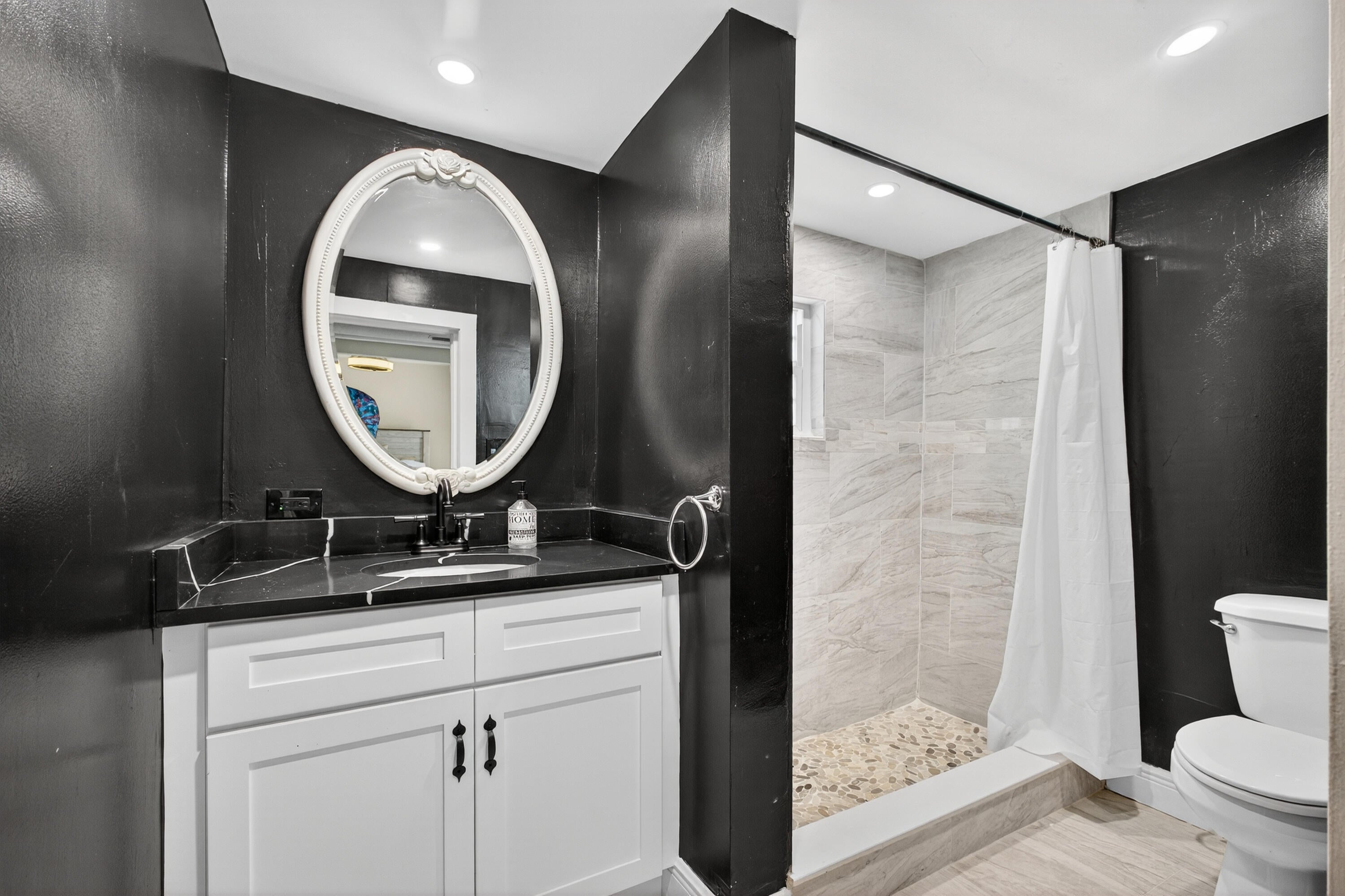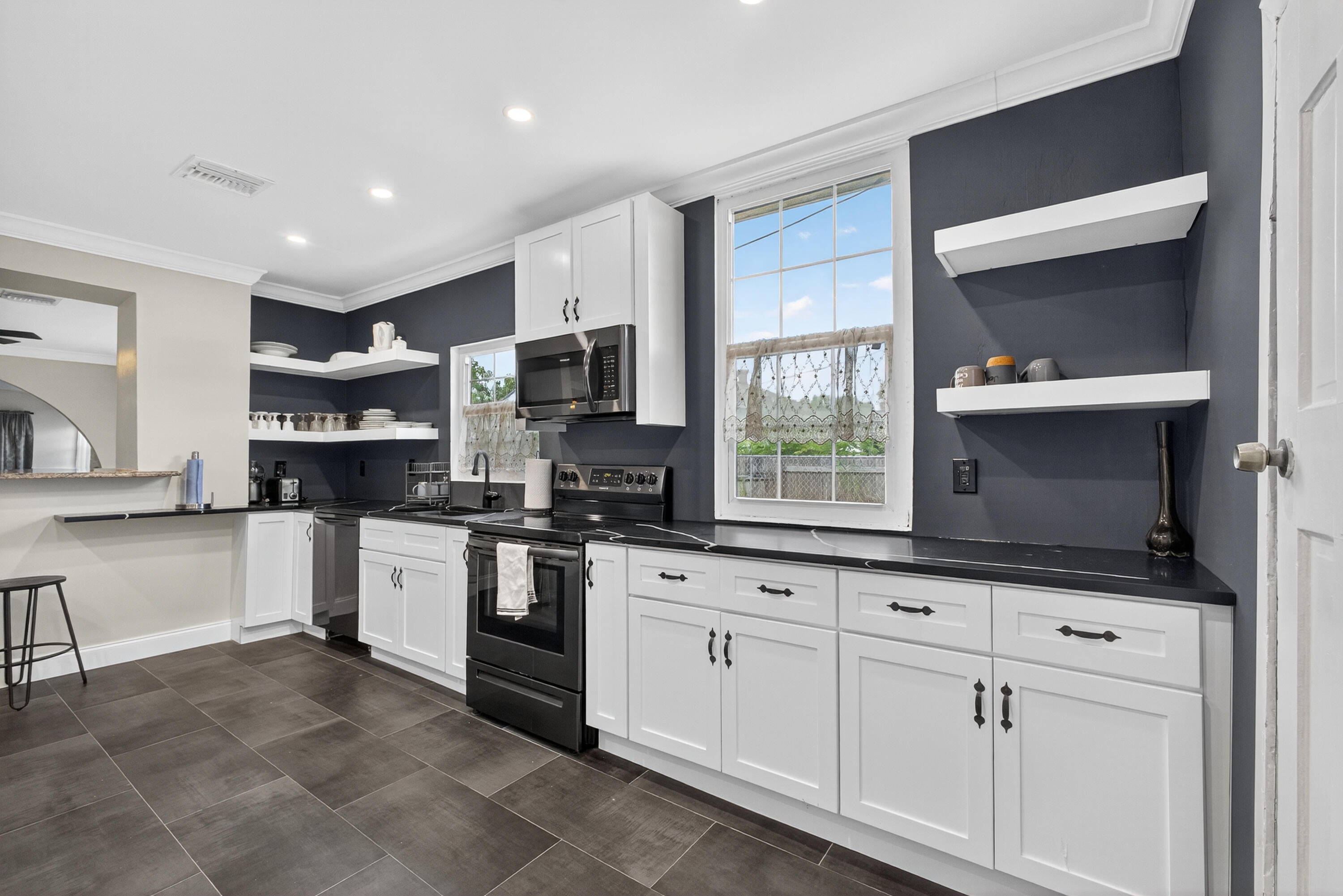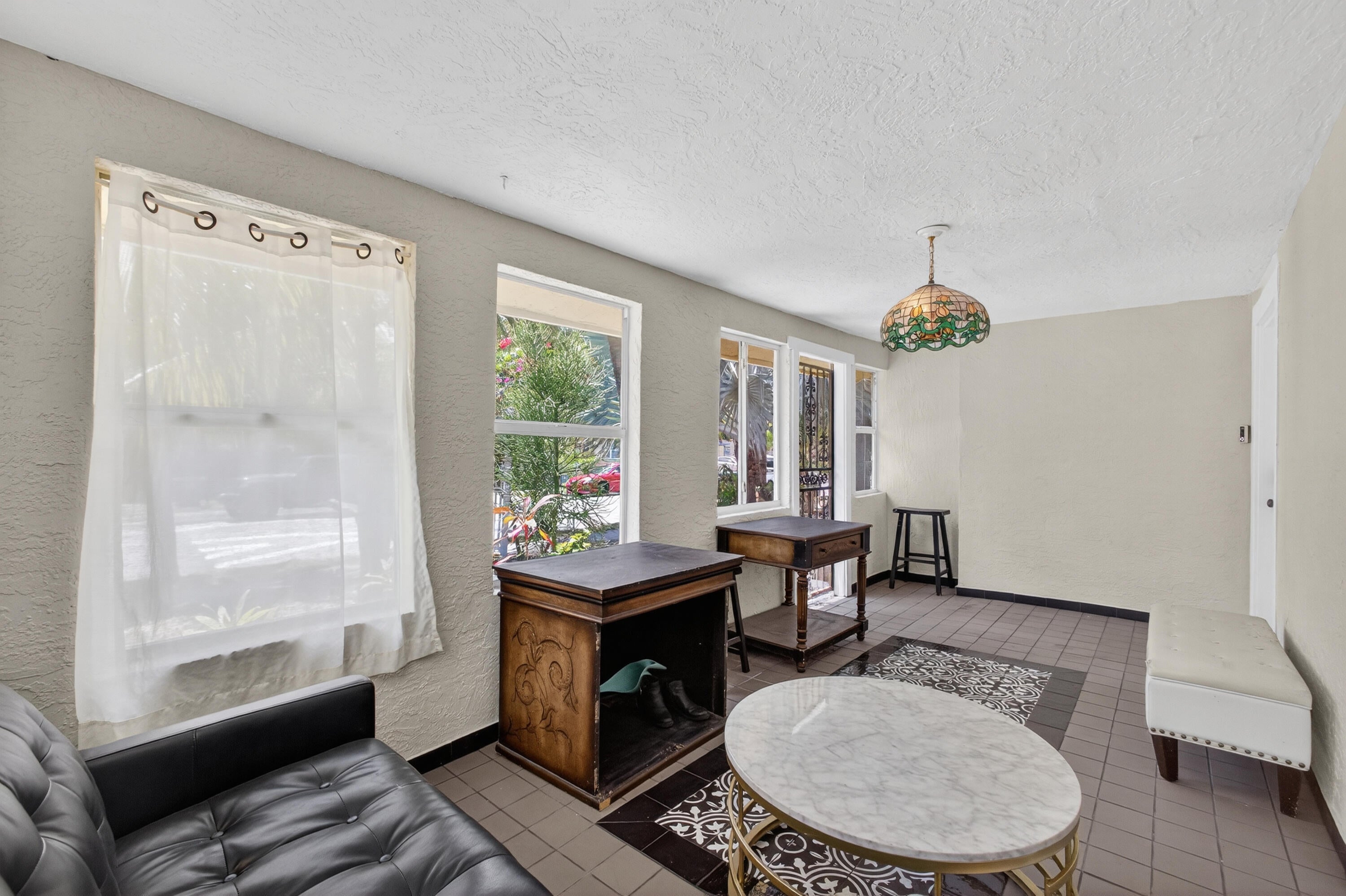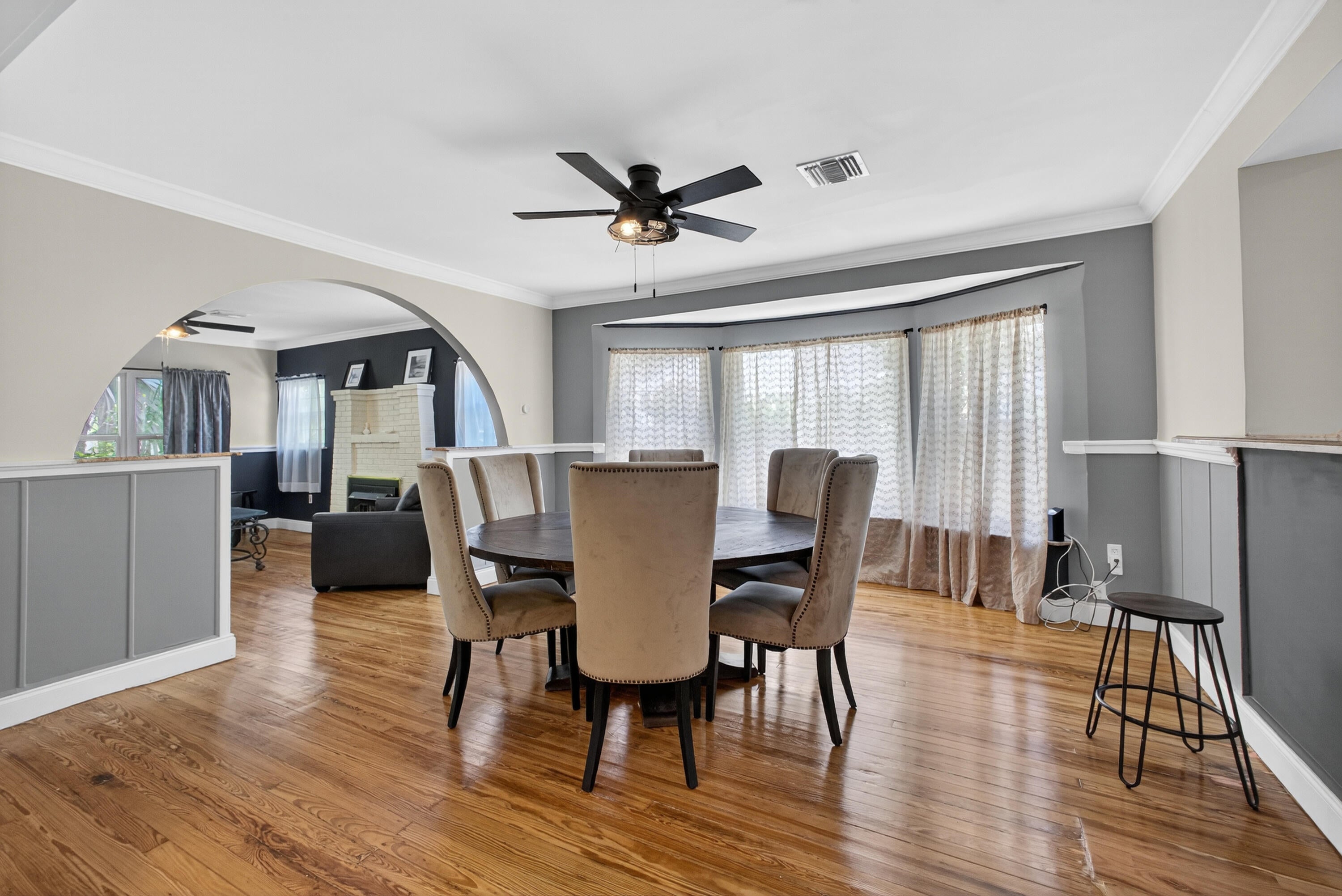 This charming home is a 3bed/3bath with numerous updates including impact windows, restored wood floors, all new kitchen, lighting, new bathrooms plus much more. Tropical landscape leads you into a cozy front porch, then a welcoming foyer, on to the spacious living room that boasts a beautiful fireplace and archway into the dining area with bay windows, then on to the gourmet kitchen and a huge utility room. The main bedroom is on the 1st floor with an en-suite bathroom, bedroom 2 is also an en-suite and has a private entrance, perfect for an in-law suite or income studio, bedroom 3 is upstairs with a huge walk-in closet. The yard is an outdoor oasis with multiple lounging areas, paver patios, artificial turf and fully fenced with lots of parking. Close to beaches and PBI airport. Hurry!