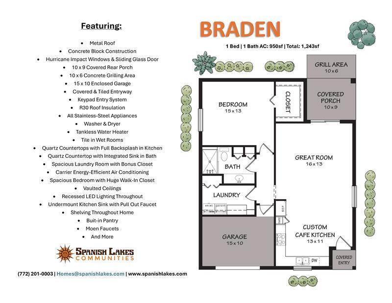 Welcome to easy, elegant 55+ living in our innovative & beautifully designed 1-bedroom Braden model. Featuring concrete block construction, quartz countertops, impact windows, & a metal roof- this home offers both style & durability for those seeking to downsize without compromising value and quality. Enjoy an open-concept living area, full-size washer/dryer in a spacious laundry room, an ample kitchen with stainless steel appliances and a well-appointed bedroom, closet and rear covered porch. Other features: All models are built with 3/16th true plywood roof sheathing, hurricane tie straps, R-30 insulation, & hip roof designs ensuring big insurance premium discounts. Our homes are equipped with energy efficient appliances, keypad door locks, & a continuous quartz kitchen backsplash.