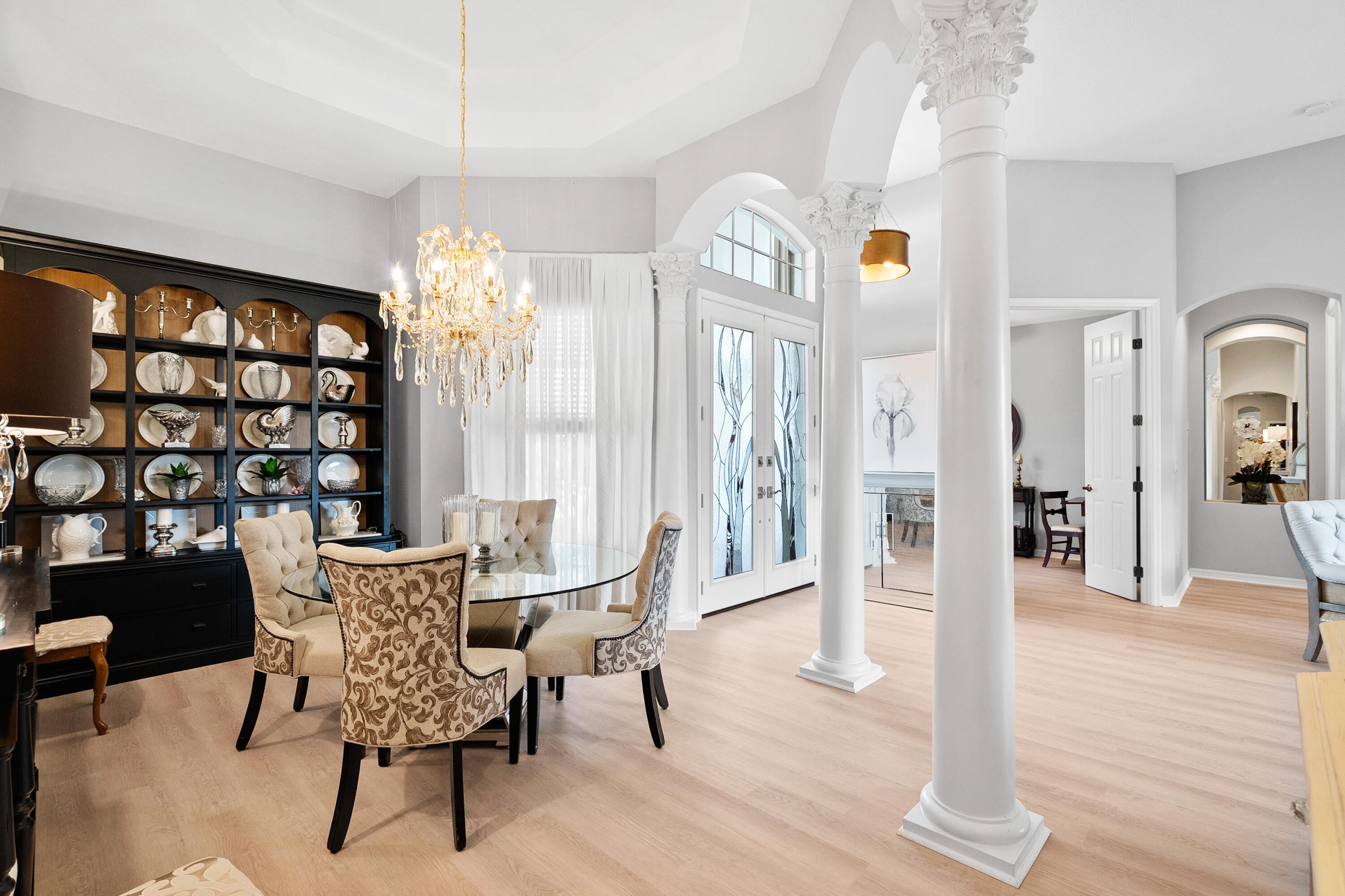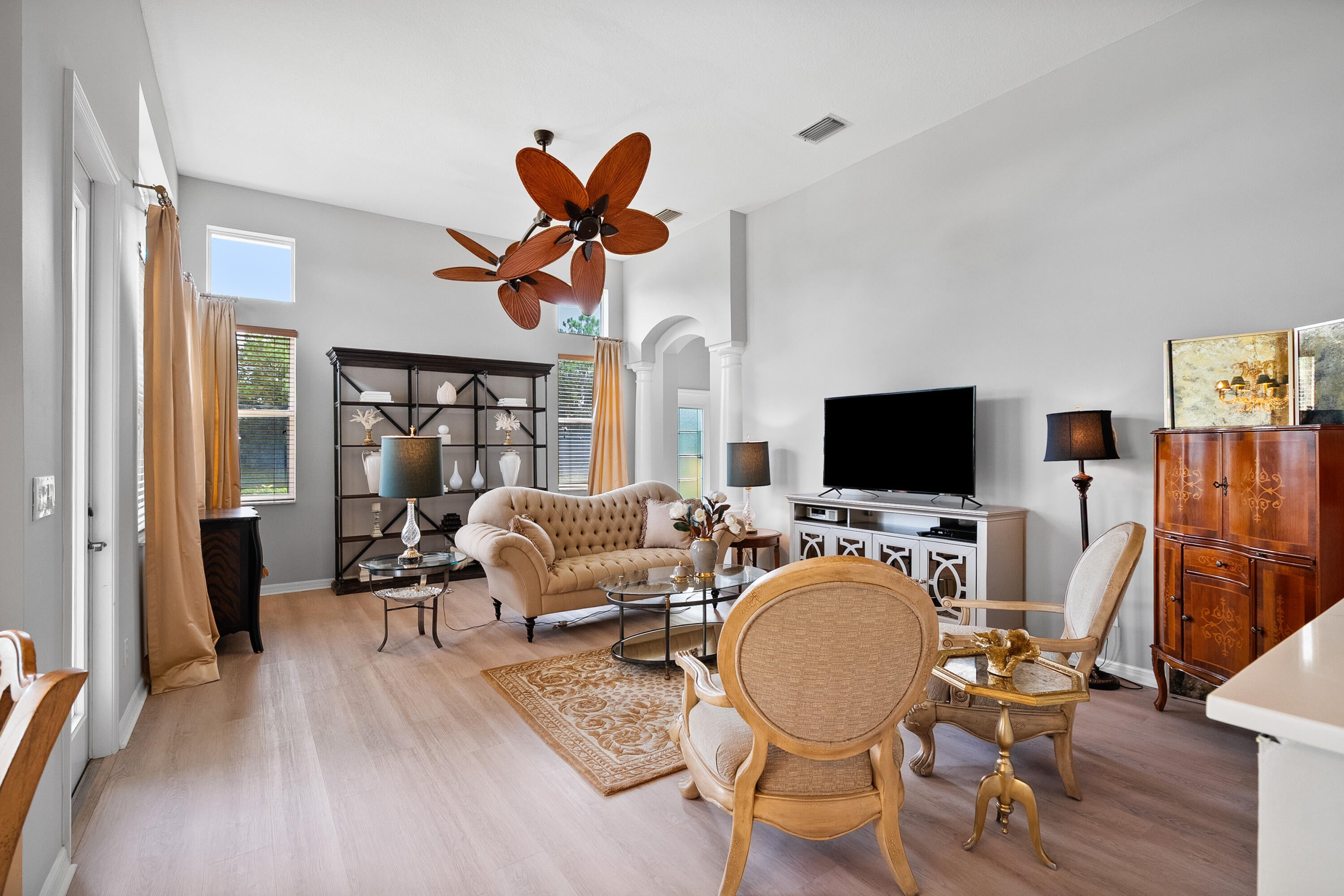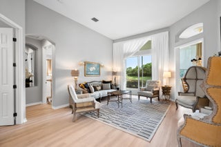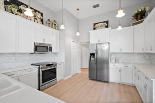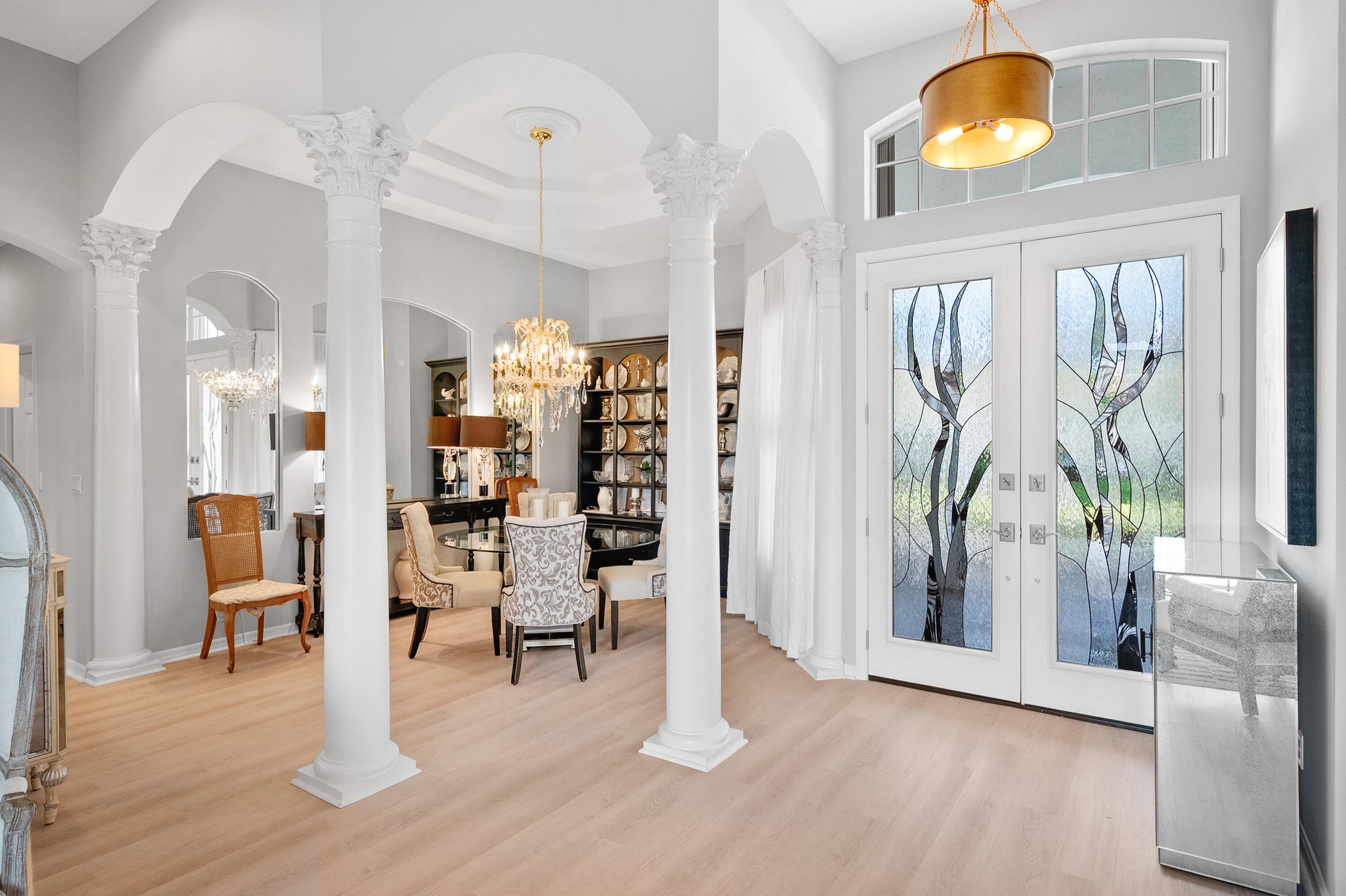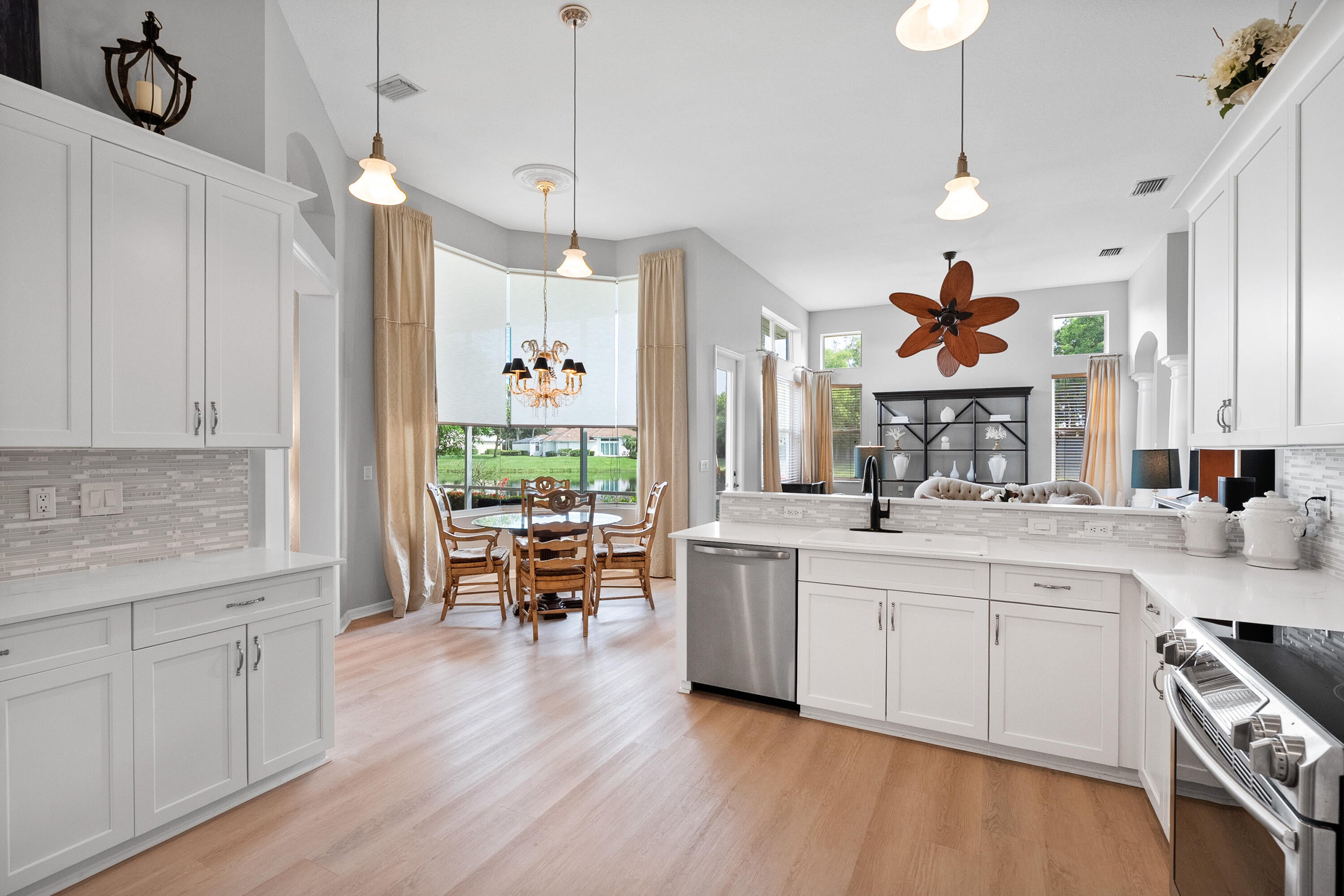 Elegance with modern renovations in this captivating floor Plan. Featuring light, neutral vinyl floors, soaring 12' ceilings in the main living areas, and 10' ceilings throughout the rest of the home, this residence is filled with natural light from abundant windows. Updated kitchen showcases white quartz countertops and stainless steel appliances. Floor plan includes a formal dining room, living room, and family room, plus 4 bedrooms and 3.5 baths. One bedroom is an en suite ideal for a nanny or in-law quarters, while another bath serves as a cabana. Enjoy tranquil lakefront views, beautiful mature landscaping, a 2021 roof, and complete hurricane panels. Community amenities include a clubhouse, pool, tennis, fitness center, and optional golf club with cafe and dining. Membership Optionallive where your play. More features are a Large Laundry Room, Spacious 3 Car Garage, 2 Zone A/C units, Paver Driveway and double door entry. New Flat tile roof.