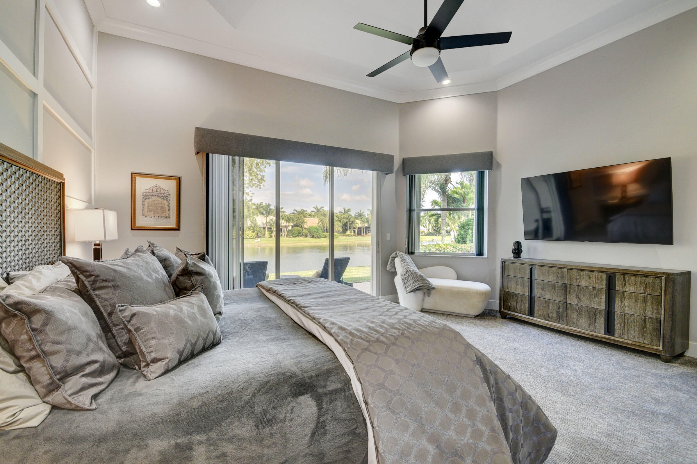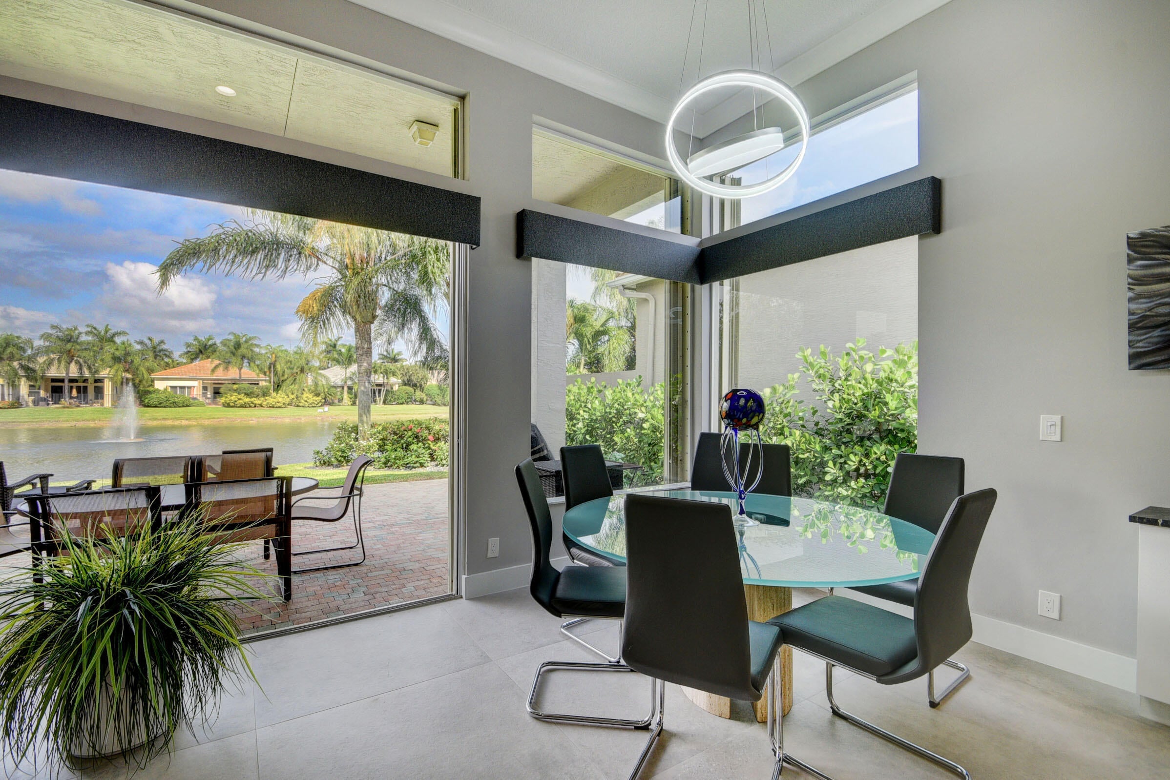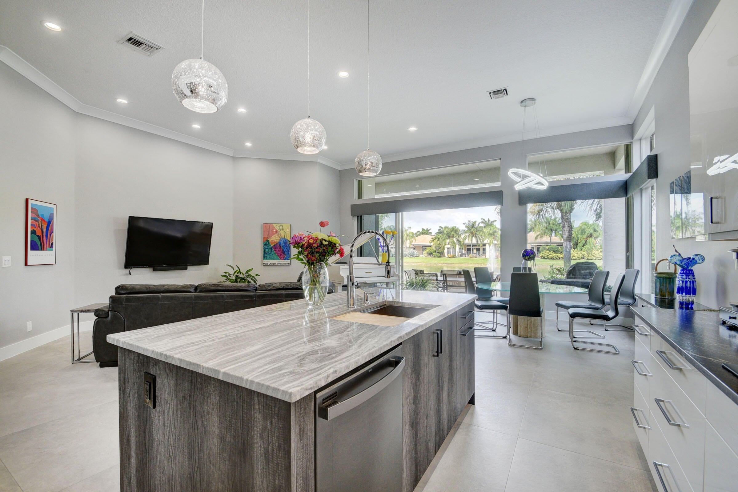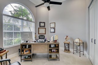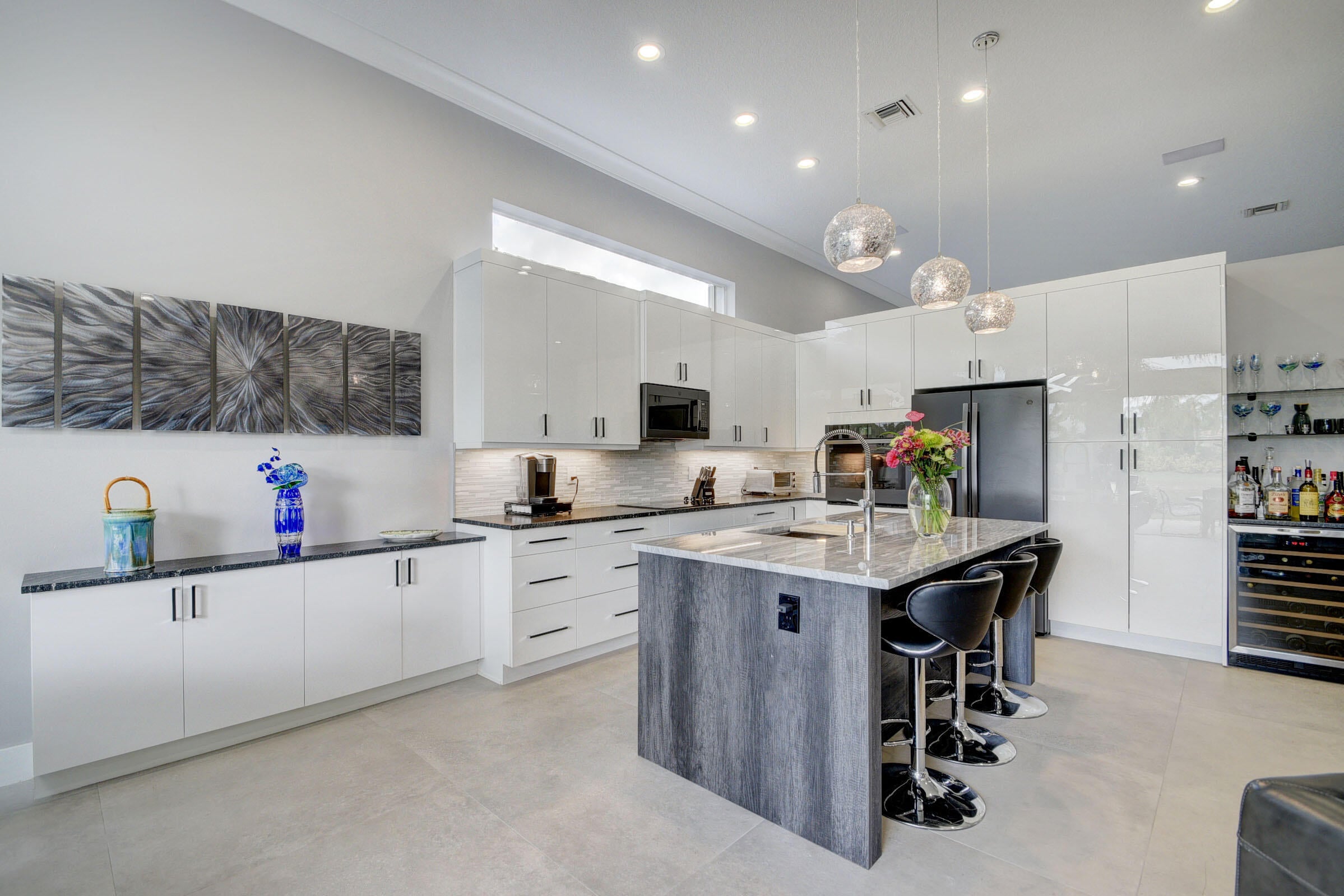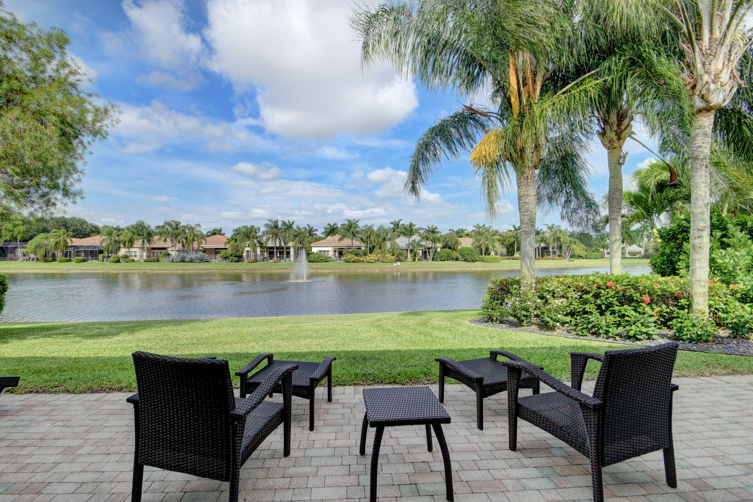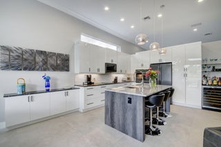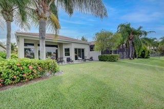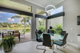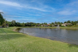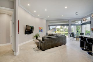 Renovated with every detail in mind, this 4-bedroom, 4-bathroom waterfront home offers a contemporary yet warm design. Oversized 3.25' x 3.25' tile floors, new baseboards, crown moldings, door frames and moldings. Open kitchen, 42-inch cabinetry, quartz countertops, tiled backsplash, raised oven, wine cooler, large island with bar seating Soft-close cabinets and drawers throughout. Flexible floor plan with unique converted DR to office and a media-style living room. The primary suite showcases a custom wood accent wall with fountain & lake views. The bath boasts dual oversized vanities with heated mirrors and an expanded glass-enclosed rain shower with wall and ceiling fixtures. Each guest room has its own updated en-suite bath with raised cabinetry and frameless glass doors.Traveling to the clubhouse by golf cart is one of the fun features of the community. This residence goes through the nature preserve under Lake Worth to the clubhouse. Wycliffe is a member of the Audobon Society with 250 speciaes of birds to enjoy. There are more activities than one could participate in the day. The fitness center classes are included in the membership. Tennis, golf, pickleball, bocce and dinner dances throughout, lectures, Trivia Night Dinners all year. Come Home to Wycliffe! You'll be glad you did.
