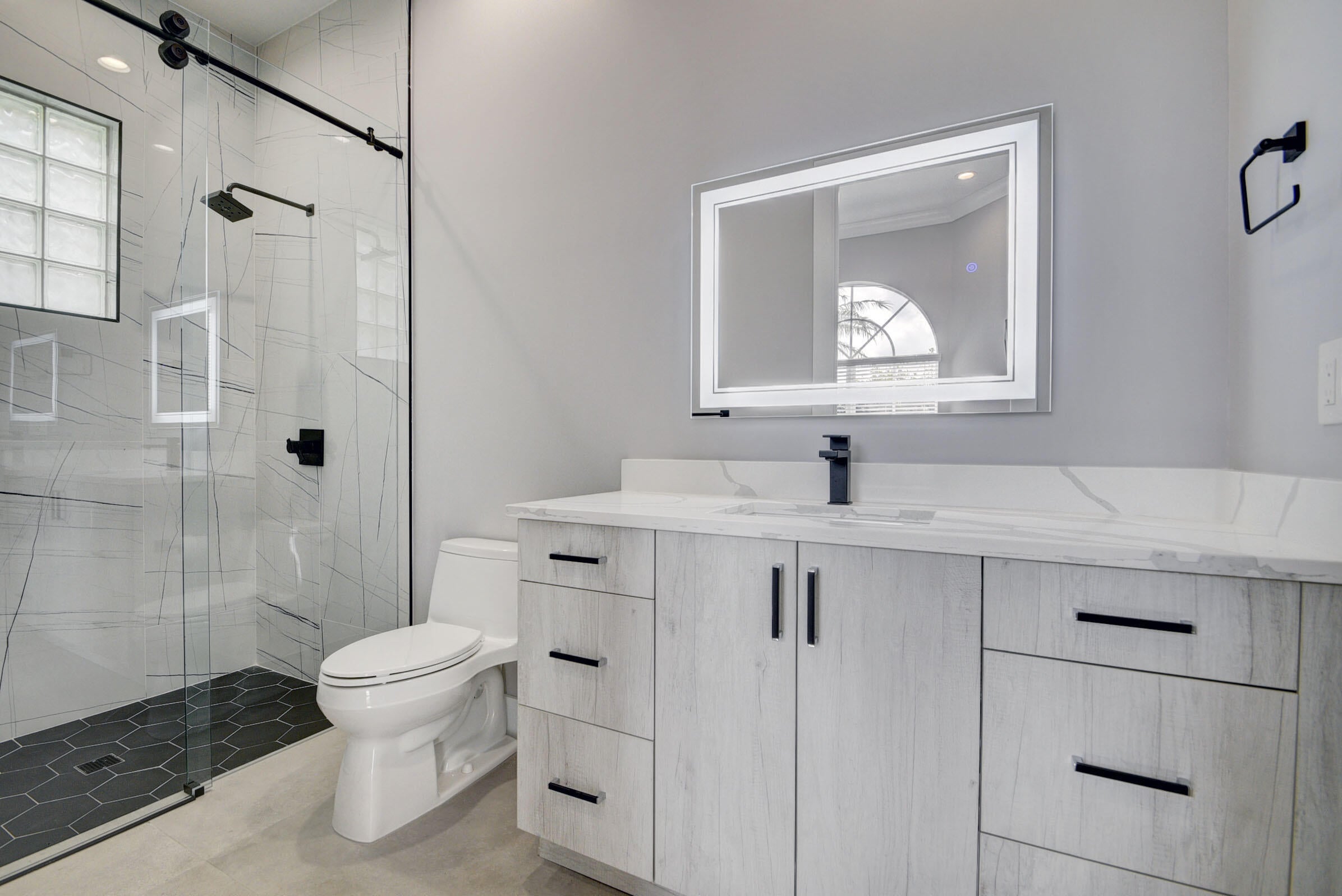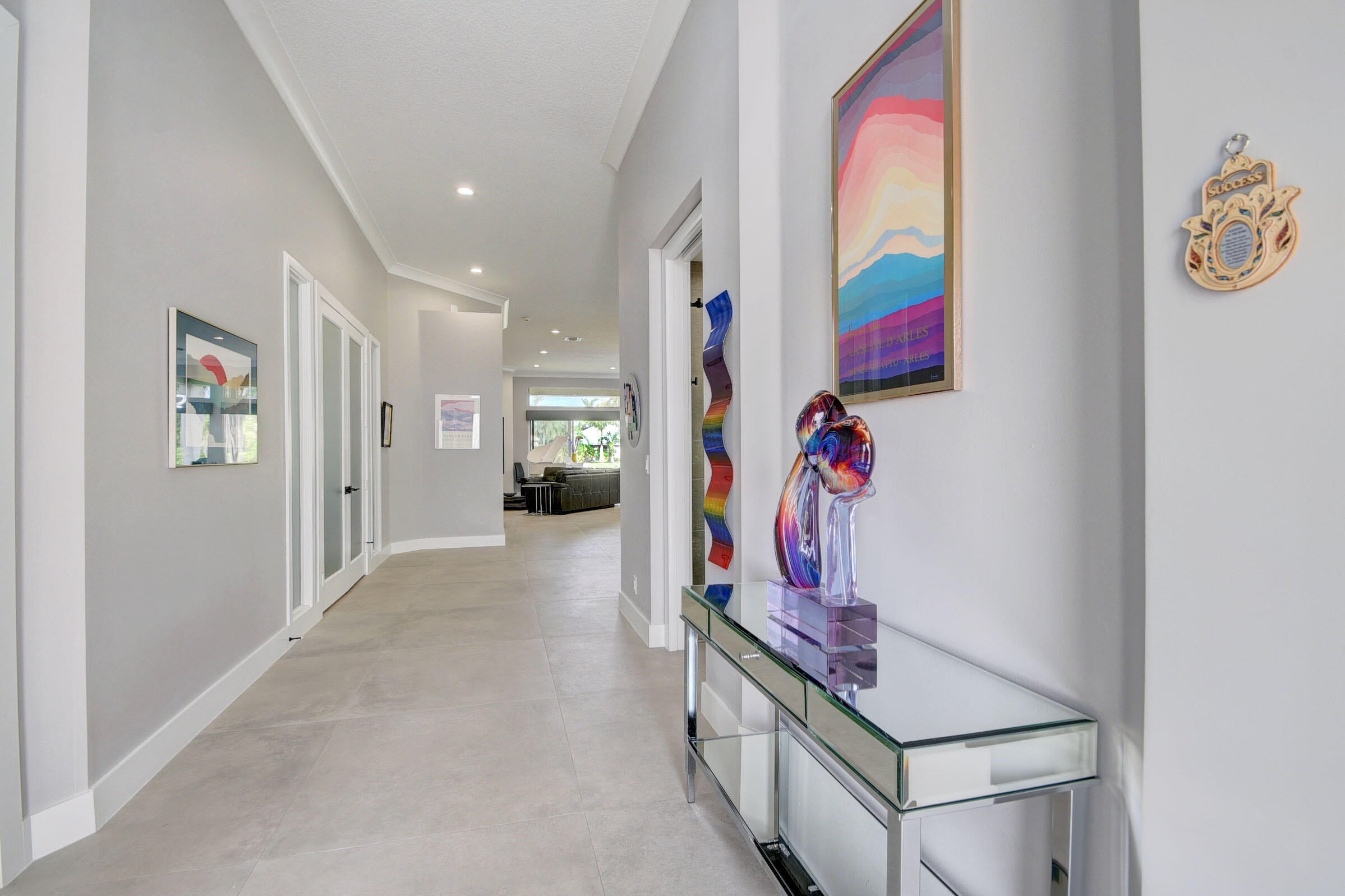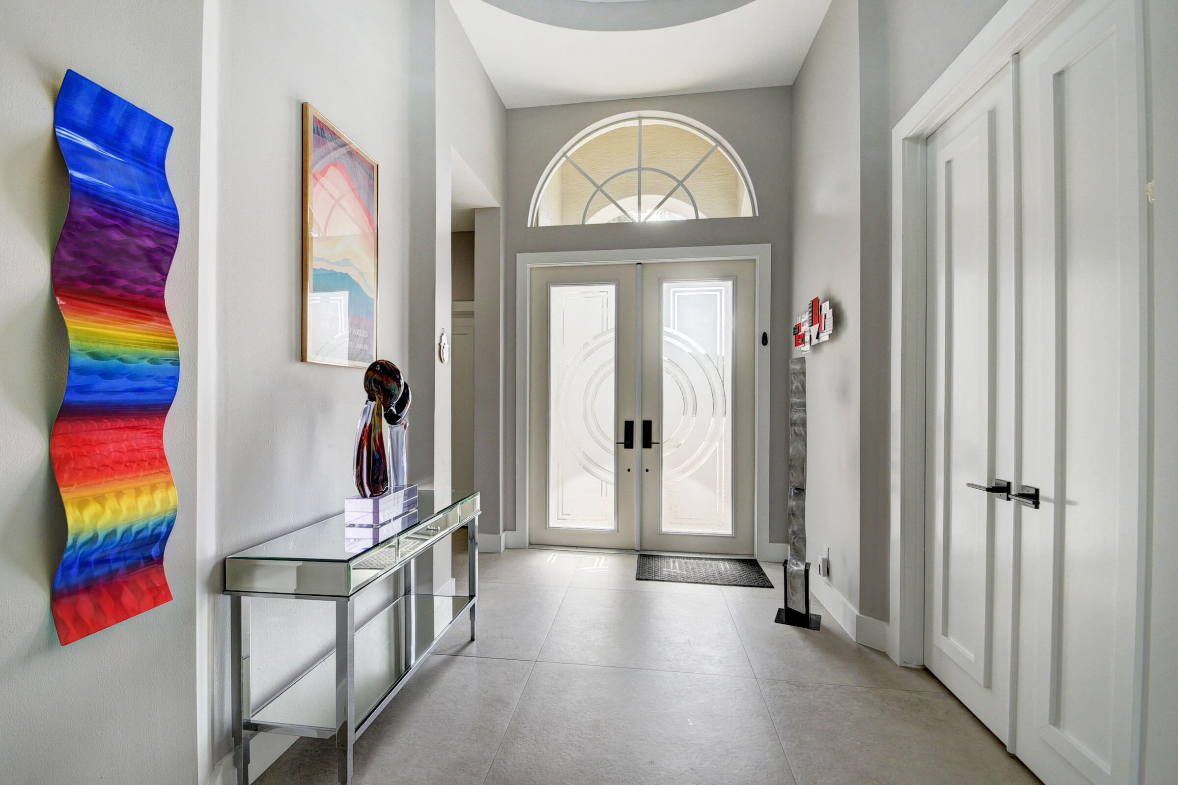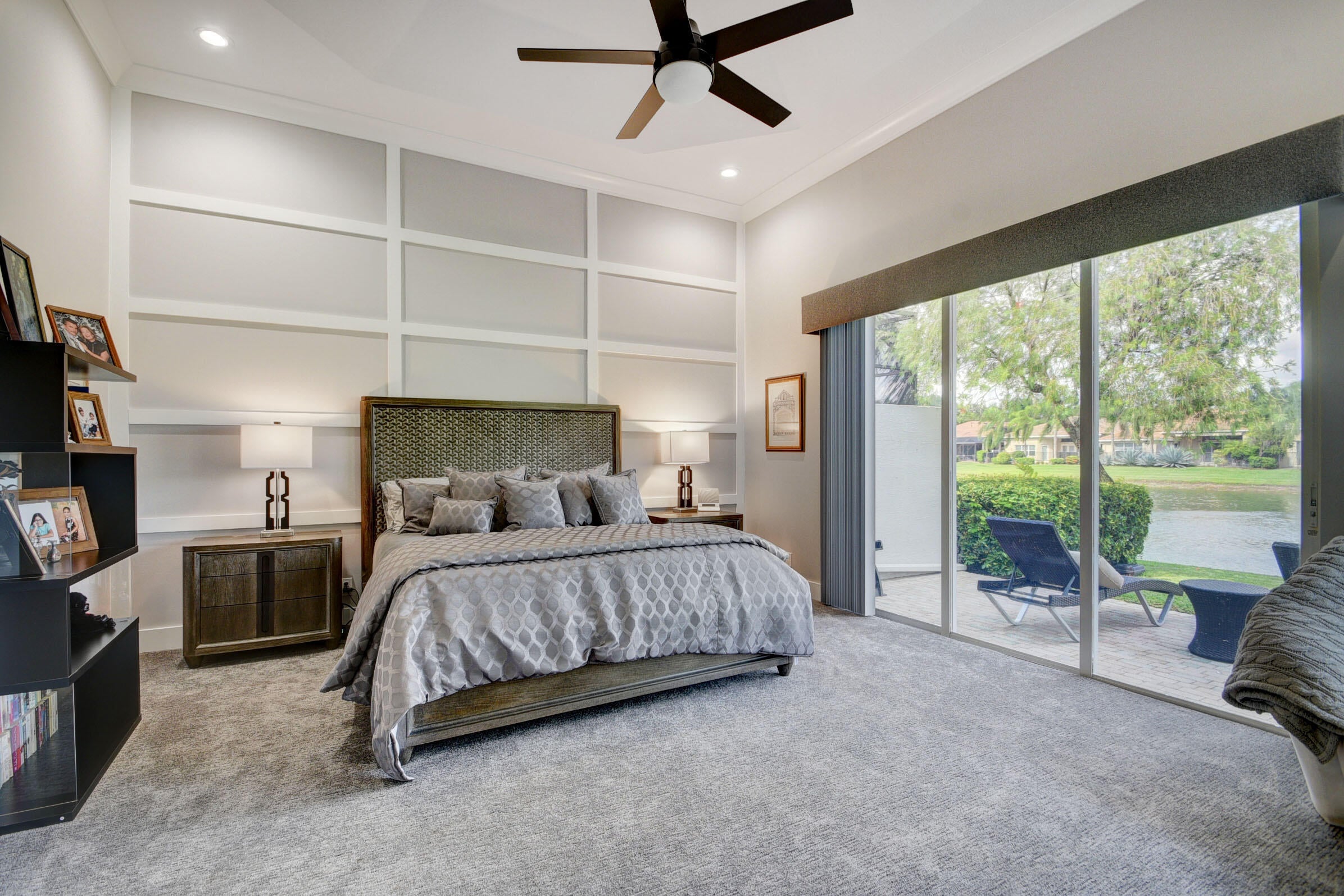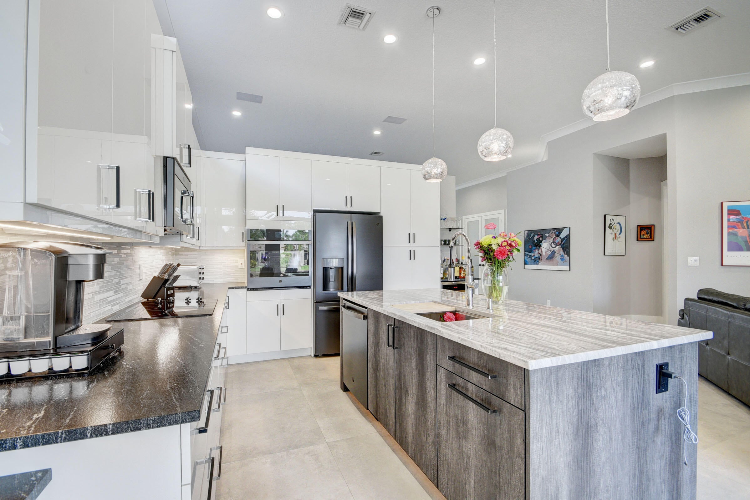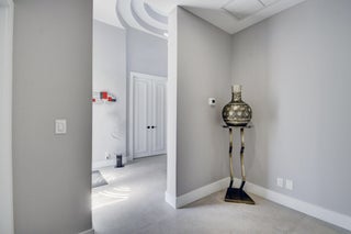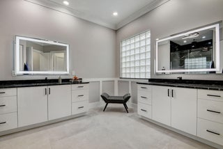 Renovated with every detail in mind, this 4-bedroom, 4-bathroom waterfront home offers a contemporary yet warm design. Oversized 3.25' x 3.25' tile floors, new baseboards, crown moldings, door frames and moldings. Open kitchen, 42-inch cabinetry, quartz countertops, tiled backsplash, raised oven, wine cooler, large island with bar seating Soft-close cabinets and drawers throughout. Flexible floor plan with unique converted DR to office and a media-style living room. The primary suite showcases a custom wood accent wall with fountain & lake views. The bath boasts dual oversized vanities with heated mirrors and an expanded glass-enclosed rain shower with wall and ceiling fixtures. Each guest room has its own updated en-suite bath with raised cabinetry and frameless glass doors.Traveling to the clubhouse by golf cart is one of the fun features of the community. This residence goes through the nature preserve under Lake Worth to the clubhouse. Wycliffe is a member of the Audobon Society with 250 speciaes of birds to enjoy. There are more activities than one could participate in the day. The fitness center classes are included in the membership. Tennis, golf, pickleball, bocce and dinner dances throughout, lectures, Trivia Night Dinners all year. Come Home to Wycliffe! You'll be glad you did.