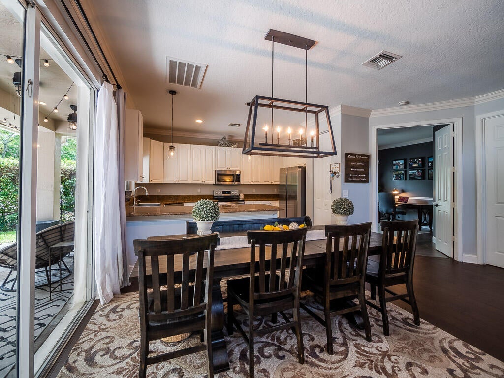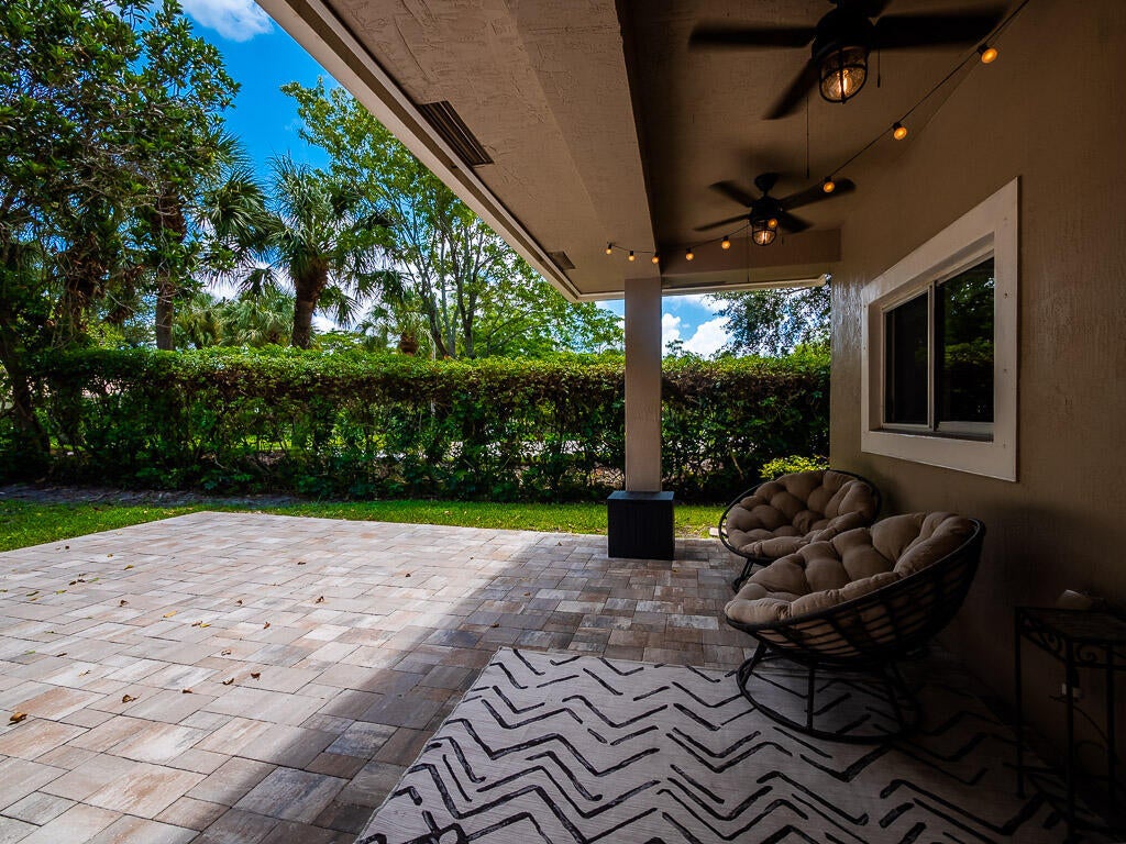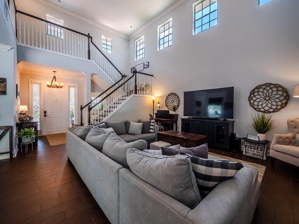 Two Story, 4 Bedroom, 2.5 Bathroom plus loft, 2 Car Garage Home situated on a spacious corner lot, in the 24 hr manned gated community of River Bridge. This home offers a complete set of hurricane panels, making storm prep a breeze. Inside, the interior aesthetic is defined by wood-look tile floors that seamlessly traverse the living spaces. Crown molding, great lighting, high ceilings and neutral colors make this living space fresh and airy. The stairway is the focus point of the living area. Featuring vinyl stair treads and flooring on the upper level contribute to both elegance and ease of maintenance. The updated kitchen features granite countertops, white cabinetry, pantry, and stainless steel appliances.On the ground level, you will also find one guest bedroom and the elegant master bedroom, with crown molding accents, tray ceiling, and a walk-in closet with built-in storage solutions. The master bathroom is relaxing, boasting a double sink vanity, a luxurious soaking tub, walk-in shower, discreet privacy toilet and direct access to the patio (also serving as a cabana bathroom). Upstairs, a versatile loft area offers possibilities for relaxation and productivity, while the Jack and Jill full bathroom efficiently serves the adjacent bedrooms. Outdoor amenities include an open patio, a paved deck for entertainment, and a nice sized side yard. Situated within an active all-age community, this property affords access to an array of amenities. Rent includes cable and internet services, along with front lawn maintenance. This home will not last, so schedule your showing today!
