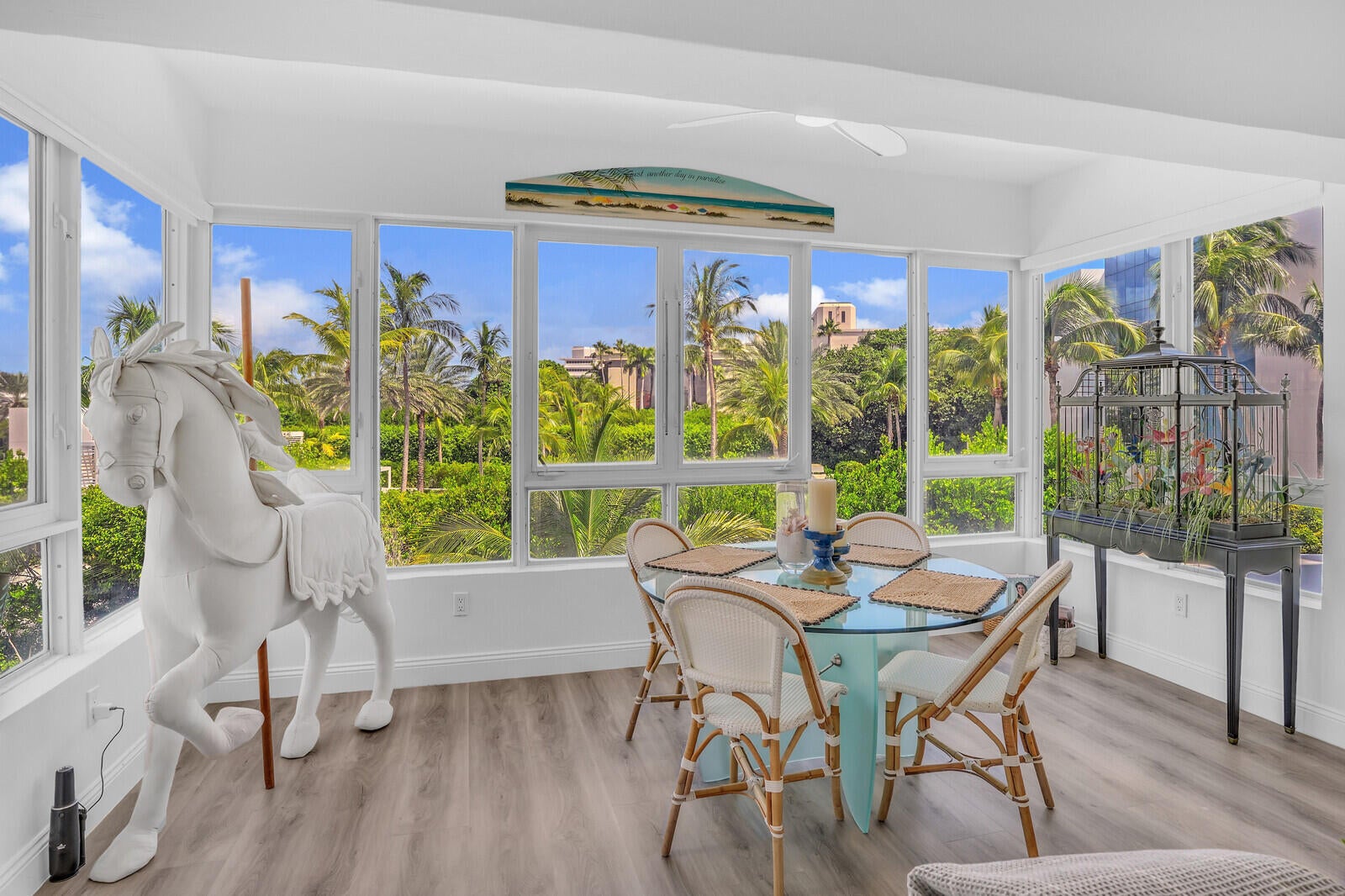 Experience modern coastal living at its finest with this completely updated seasonal rental located at 2850 South Ocean Boulevard in Palm Beach, FL. This charming 2-bedroom, 2-bathroom condominium offers 1,044 square feet of sophisticated living space nestled right on the beach.Step inside and be greeted by an open floor plan, accentuated by plantation shutters that provide both style and privacy. The unit boasts a seamless blend of living, dining, and kitchen areas, perfect for entertaining or relaxing. Enjoy the convenience of in-unit laundry with a washer and dryer, a rare feature in this building.Residents have access to a suite of desirable amenities designed for a luxurious lifestyle. Take a refreshing dip in the pool, maintain your fitness routine at the gym, or unwindin the common media/recreation room. Additional conveniences include an elevator, air conditioning, and a bike room for the active lifestyle enthusiast. Please note, pets are not permitted in this midrise community. The prime location places you moments away from five-star dining and upscale shopping, enhancing your everyday experience with the elegance of Palm Beach living. This property encapsulates the perfect blend of luxury and comfort, ideal for those seeking a refined coastal retreat.