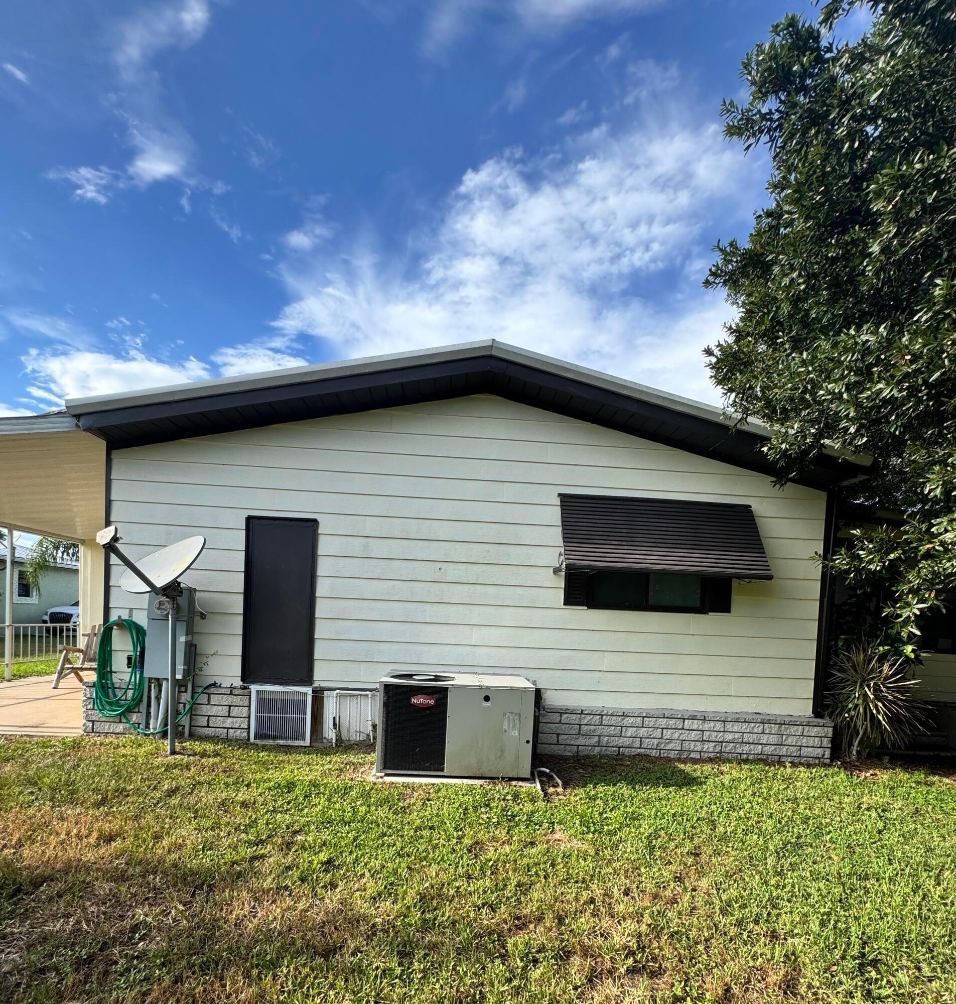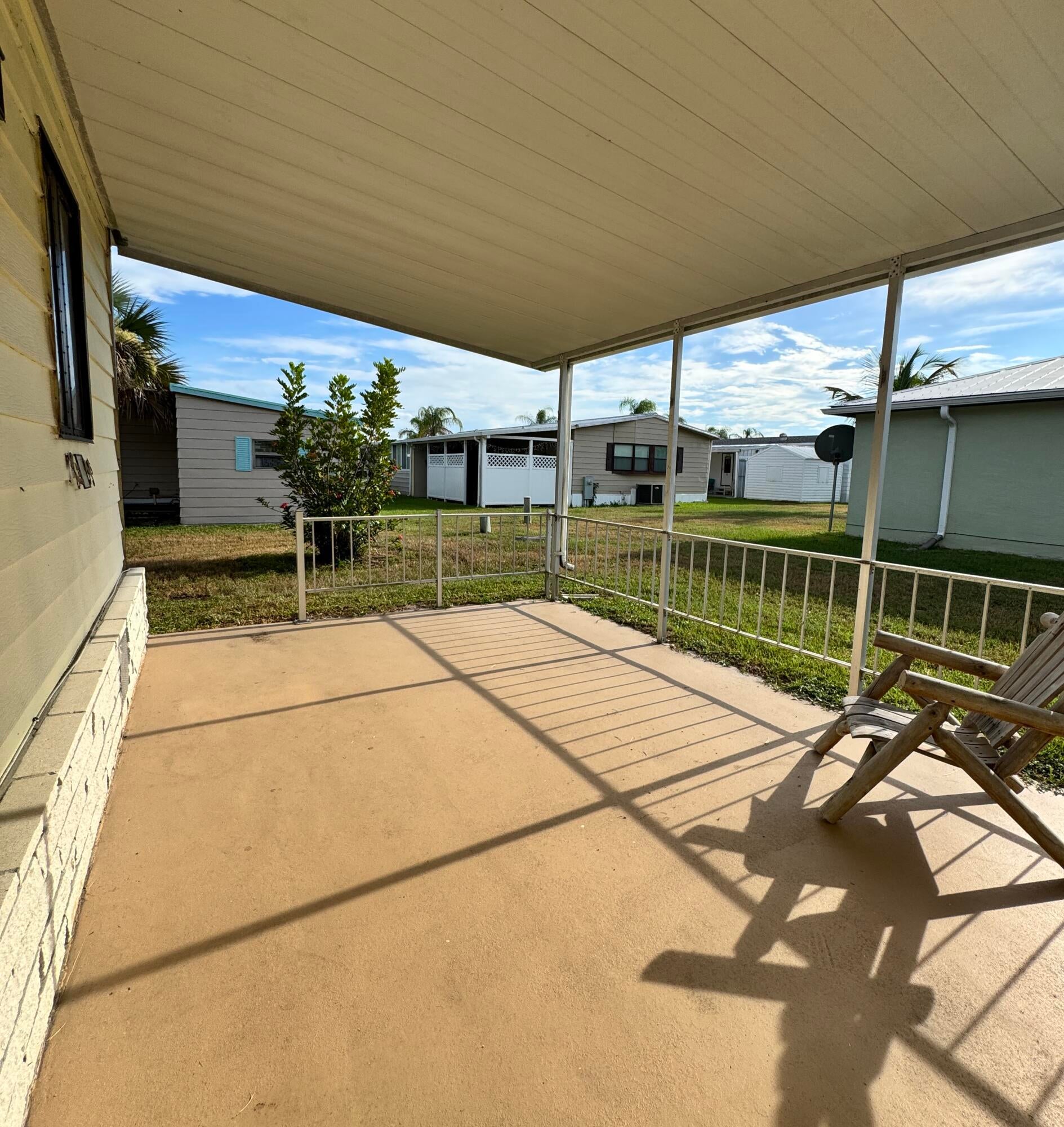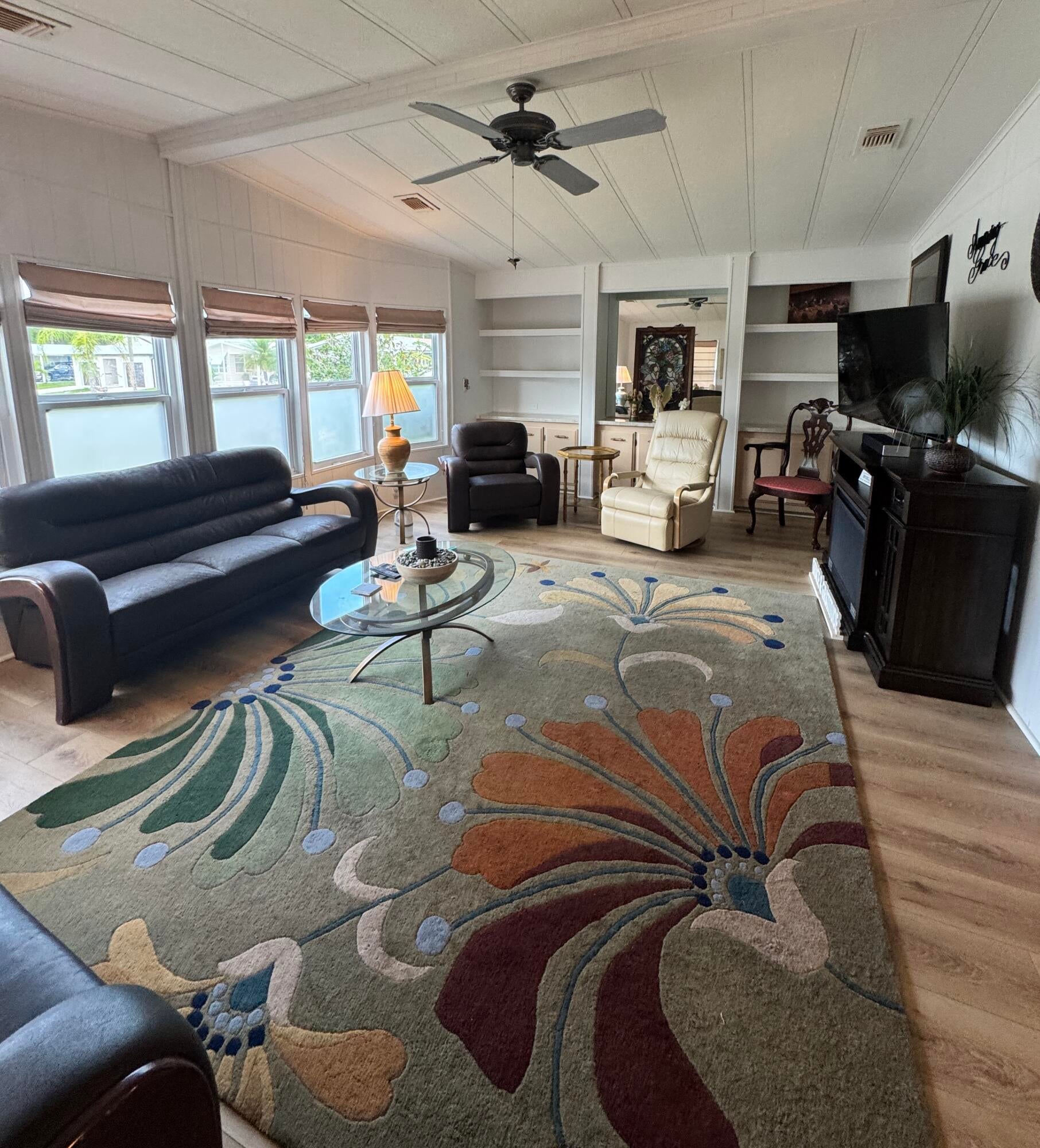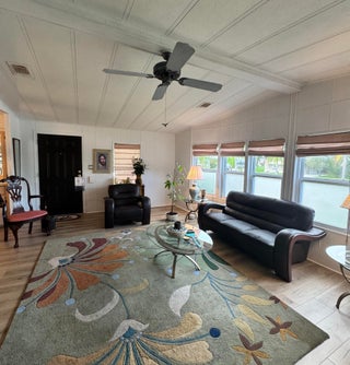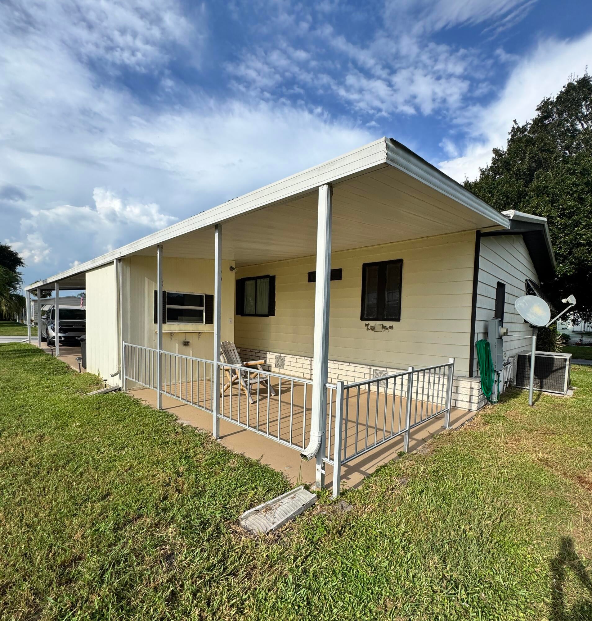Lovely 2-bedroom 2-bath home in the desirable Spanish Lakes Country Club Village 55 plus community. Home sits on a corner lot on a quiet cal da sac. The house has an open kitchen with an island and bar with extra seating. The dining room has built-in shelves for added storage. The living room has built-in shelves as well. Laundry is inside the home--a large Florida room with ceramic tile and wrap-around windows: laminate flooring, no carpet. Lawn care and trash removal are included in the lot rent. The property features two pools, tennis, pickleball, bocceball, and shuffleboard. clubhouse and much more.