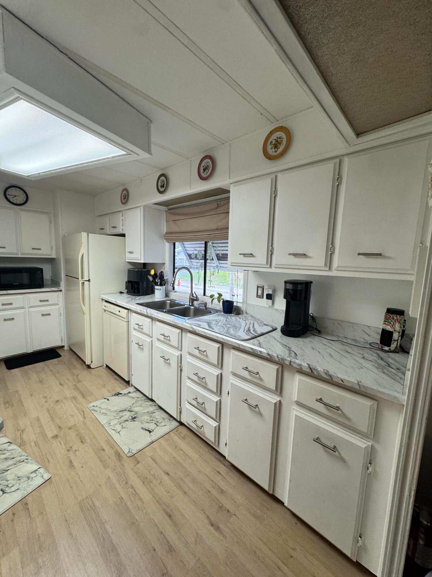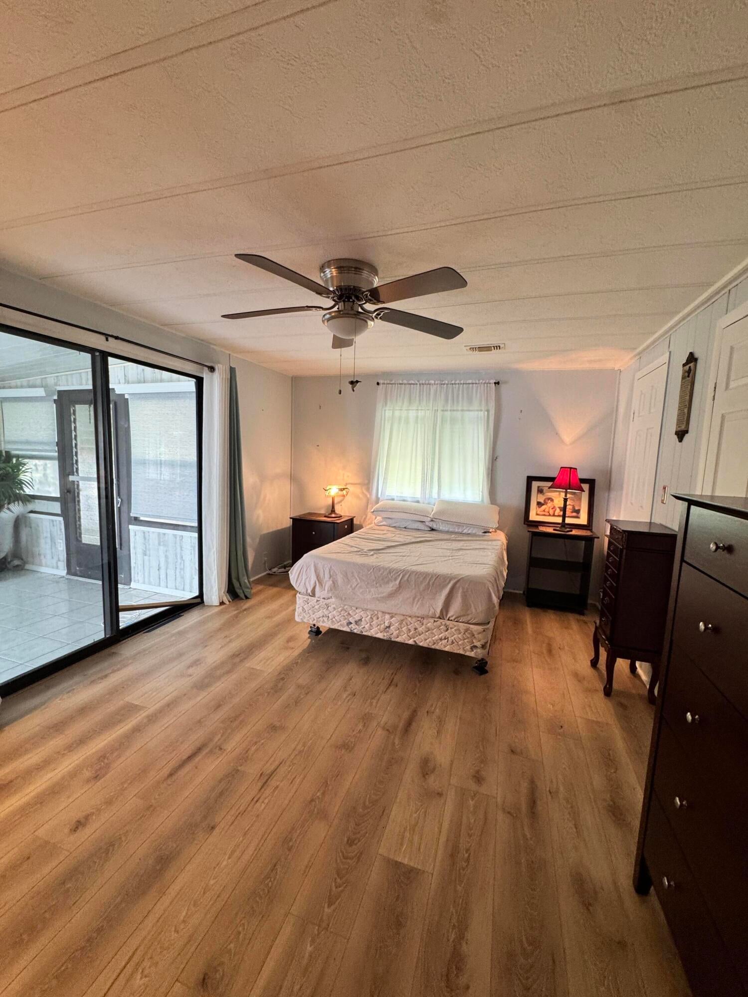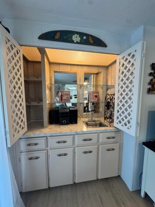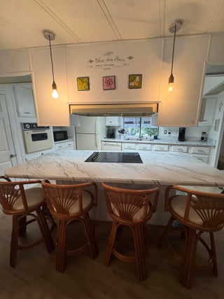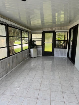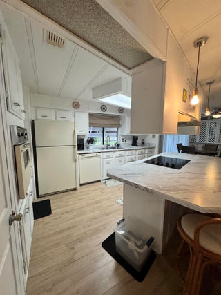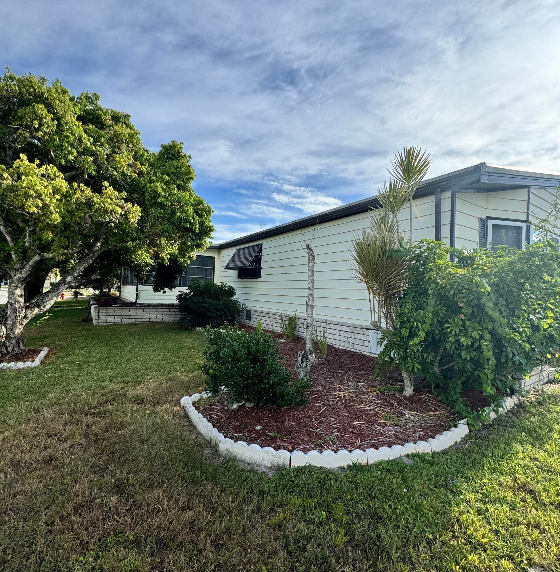 Lovely 2-bedroom 2-bath home in the desirable Spanish Lakes Country Club Village 55 plus community. Home sits on a corner lot on a quiet cal da sac. The house has an open kitchen with an island and bar with extra seating. The dining room has built-in shelves for added storage. The living room has built-in shelves as well. Laundry is inside the home--a large Florida room with ceramic tile and wrap-around windows: laminate flooring, no carpet. Lawn care and trash removal are included in the lot rent. The property features two pools, tennis, pickleball, bocceball, and shuffleboard. clubhouse and much more.