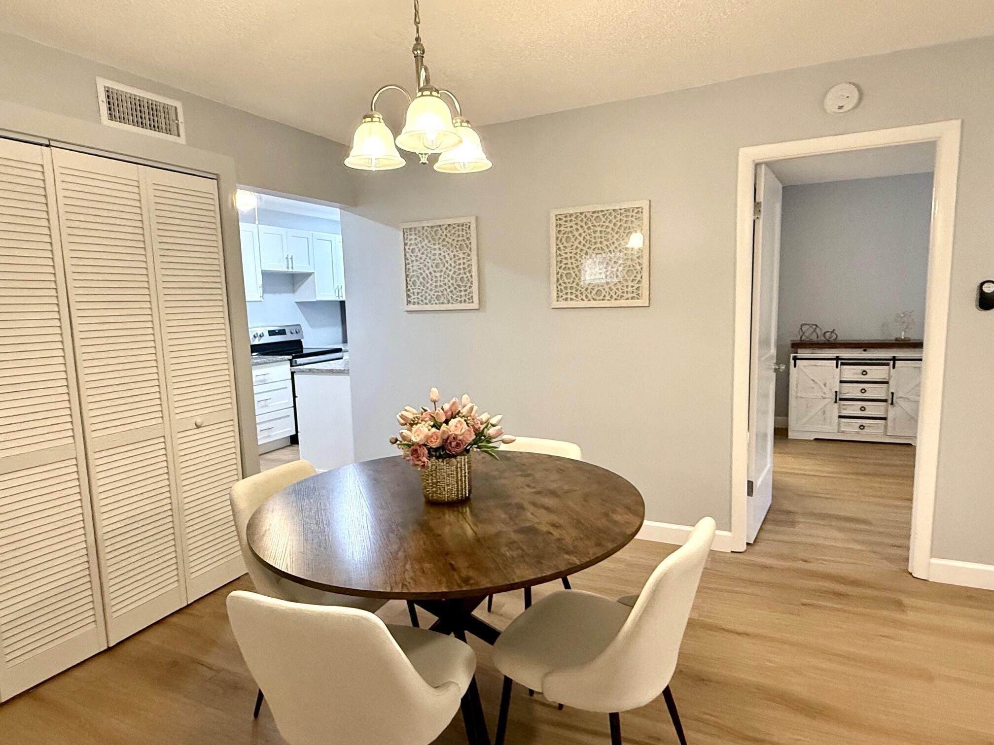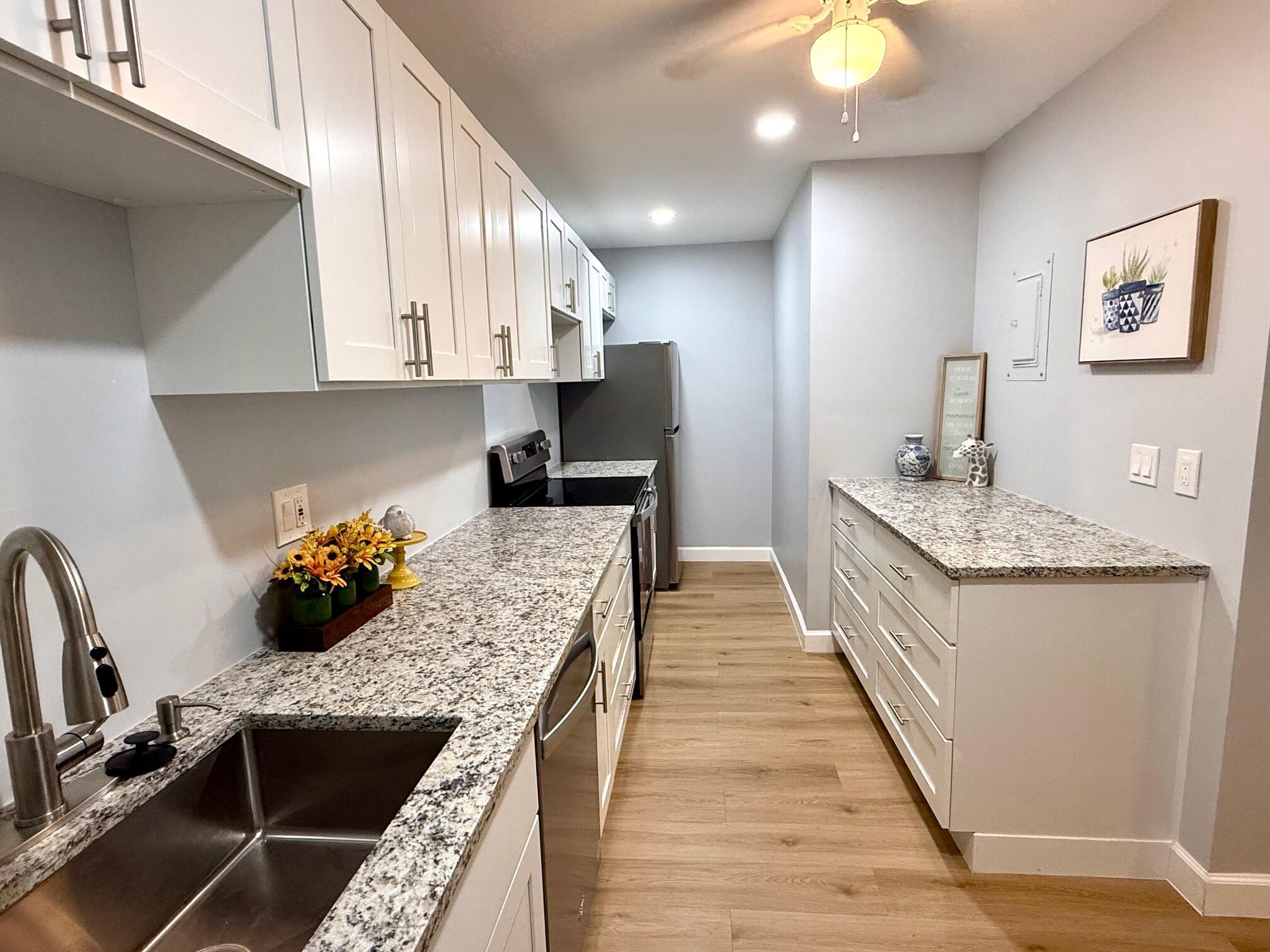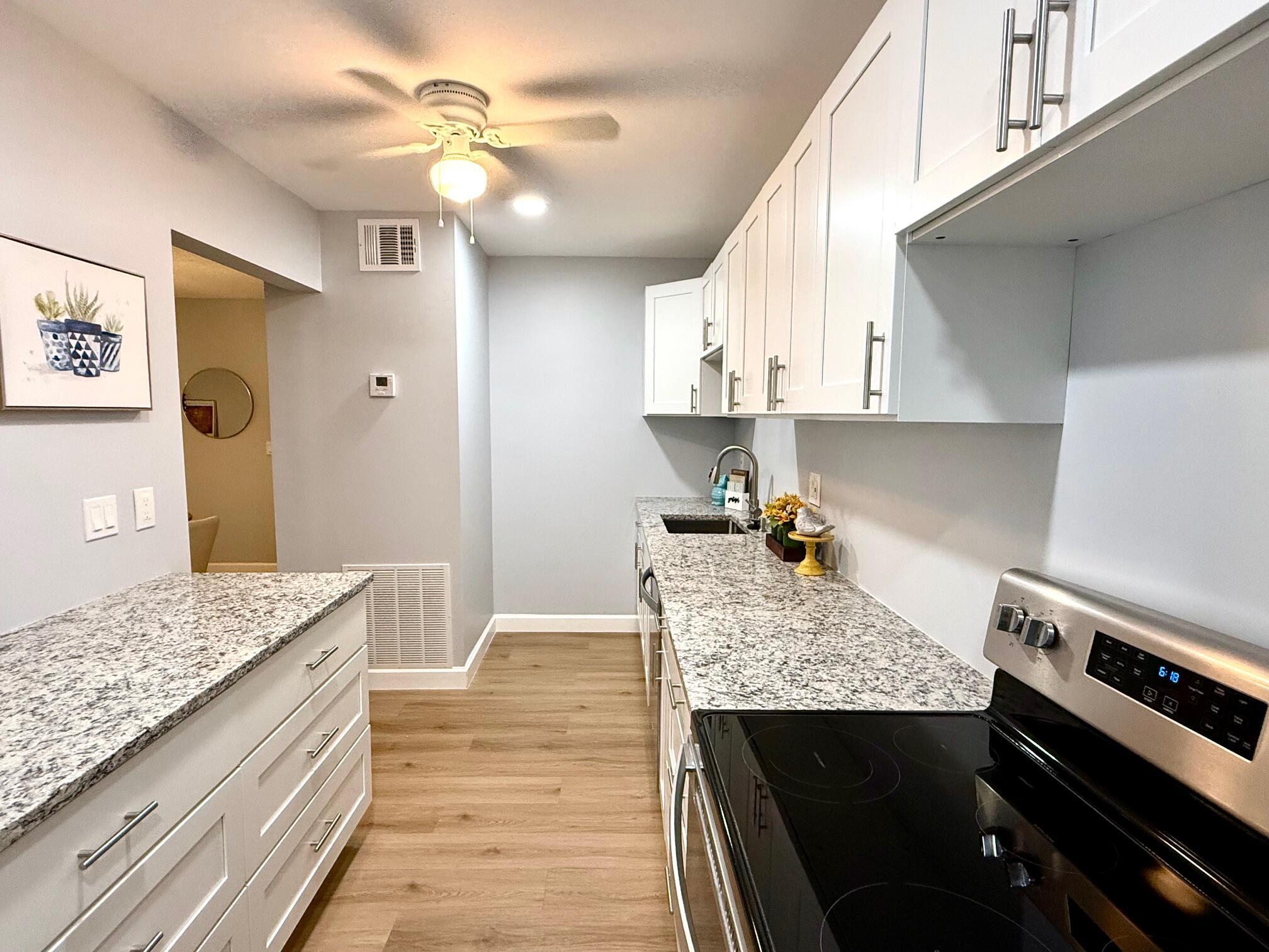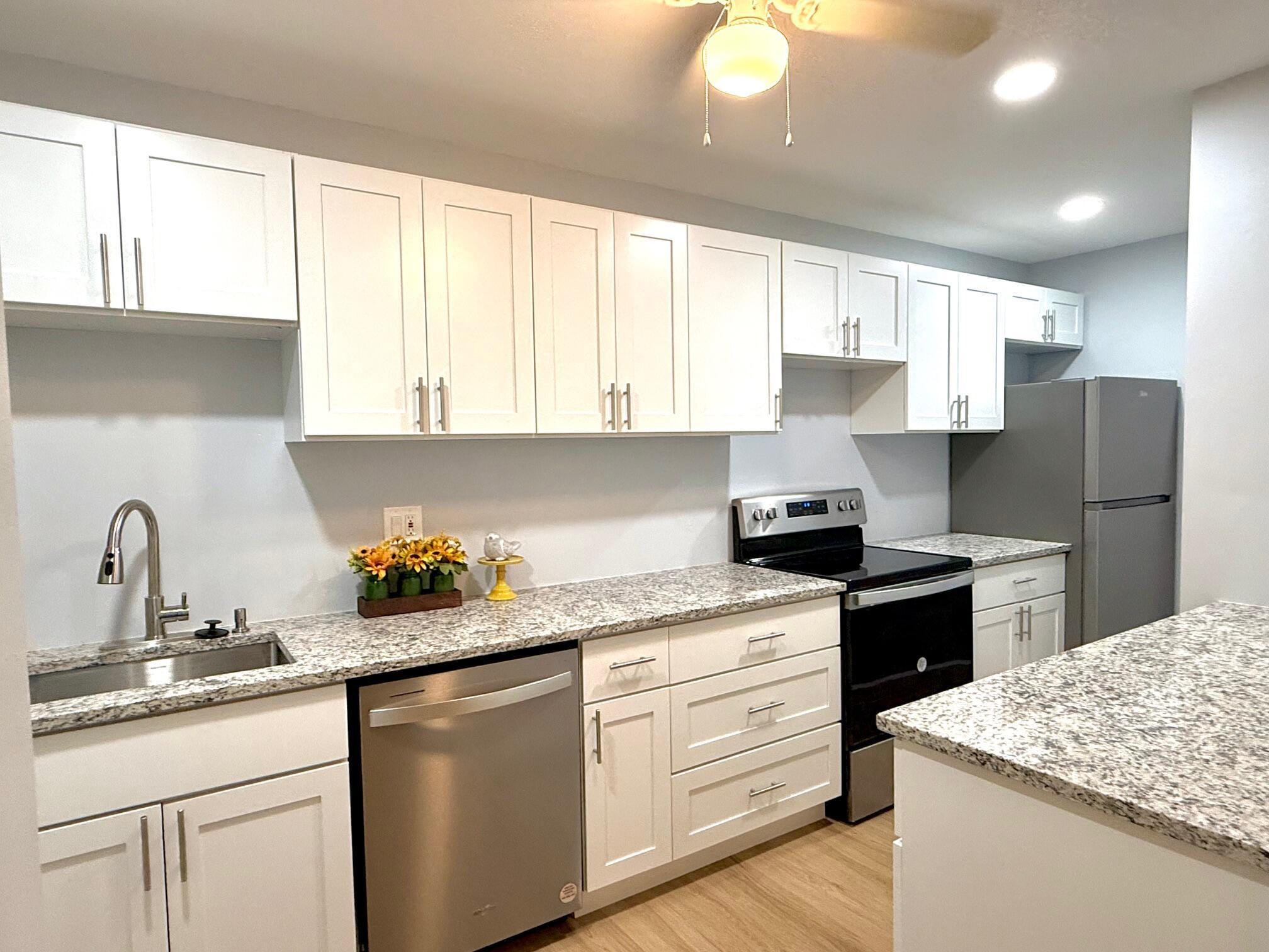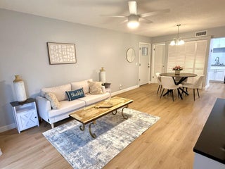 Welcome to this fully updated first-floor 1BR/2BA condo, perfectly situated in one of the best locations in Golden Lakes. Enjoy a tranquil water view from every room. This private corner unit has no homes across from it - just relax on your private patio and watch the birds.This move-in ready condo features a spacious bedroom with a large walk-in closet, an expanded brand-new kitchen with soft-close cabinets, new appliances, new washer & dryer. The home is enhanced with new luxury waterproof vinyl flooring throughout, recessed lighting, and new fans in every room. Both bathrooms have been tastefully renovated. Can be sold furnished or unfurnished. Comes with an extra storage room just walking distance. Additional updates include A/C (2018) and a new water heater.The low HOA fee covers cable & internet, water, building insurance, lawn care, pest control, a 24-hour guard gate, several pools, performance center, billiards, courtesy bus service, and much more. No Capital Contributions to Phase A!