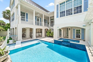 Coastal Elegance in the heart of Juno Beach. Discover a one-of-a-kind architectural masterpiece just one block from the sparkling Atlantic Ocean. Nestled in the heart of Juno Beach, this custom-built estate overlooks picturesque Pelican Lake and Ocean Drive, offering sweeping ocean views, radiant sunrises, and the soothing embrace of gentle sea breezes. Designed to capture the essence of Key West living, this home blends timeless coastal charm with modern luxury. Step onto the expansive 11' wide porches, perfect for enjoying the tropical surroundings. Additional home features include hurricane impact windows and doors for peace of mind, a private elevator, and exquisite details such as Heart Pine Brazilian wood flooring and custom millwork throughout. The gourmet kitchen boasts Viking and Sub-Zero appliances, while the stunning bar area with built-in wine storage invites effortless entertaining. Cozy up by one of the two fireplaces, or retreat to the spacious primary suite, complete with a serene sitting area and luxurious en-suite primary bath. Outdoors, the heated saltwater pool and spa are complemented by a fully equipped outdoor kitchen and living area, perfect for enjoying the Florida lifestyle year-round. With a 3-car garage and proximity to the Juno Pier, Seminole Golf Club, and some of Palm Beach County's most pristine beaches, this home is the epitome of refined coastal living. Experience the charm, elegance, and vibrancy of this Key West-inspired treasure in the heart of Juno Beach.