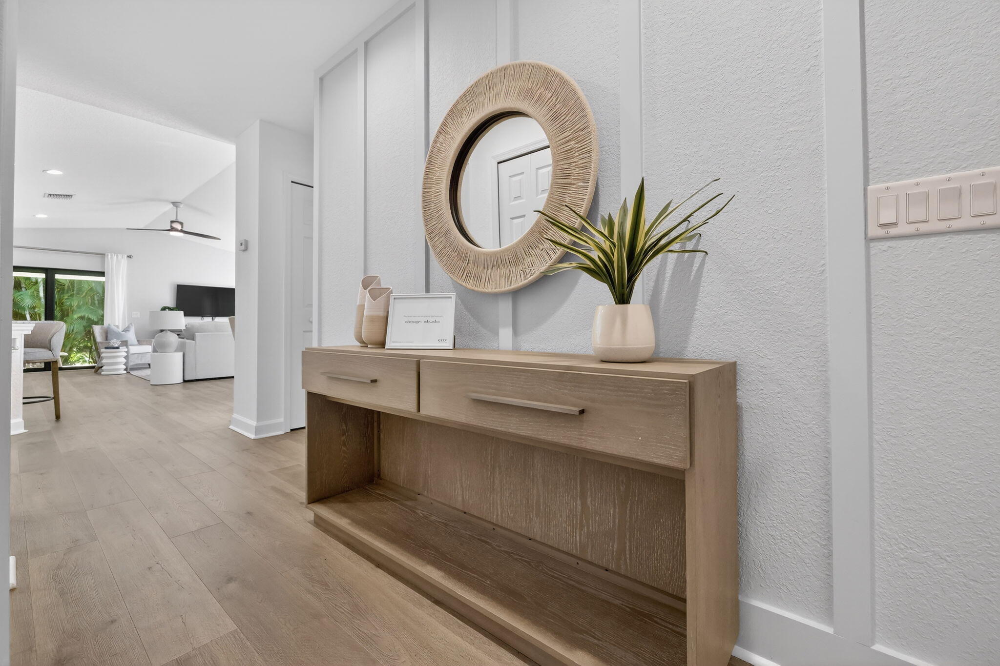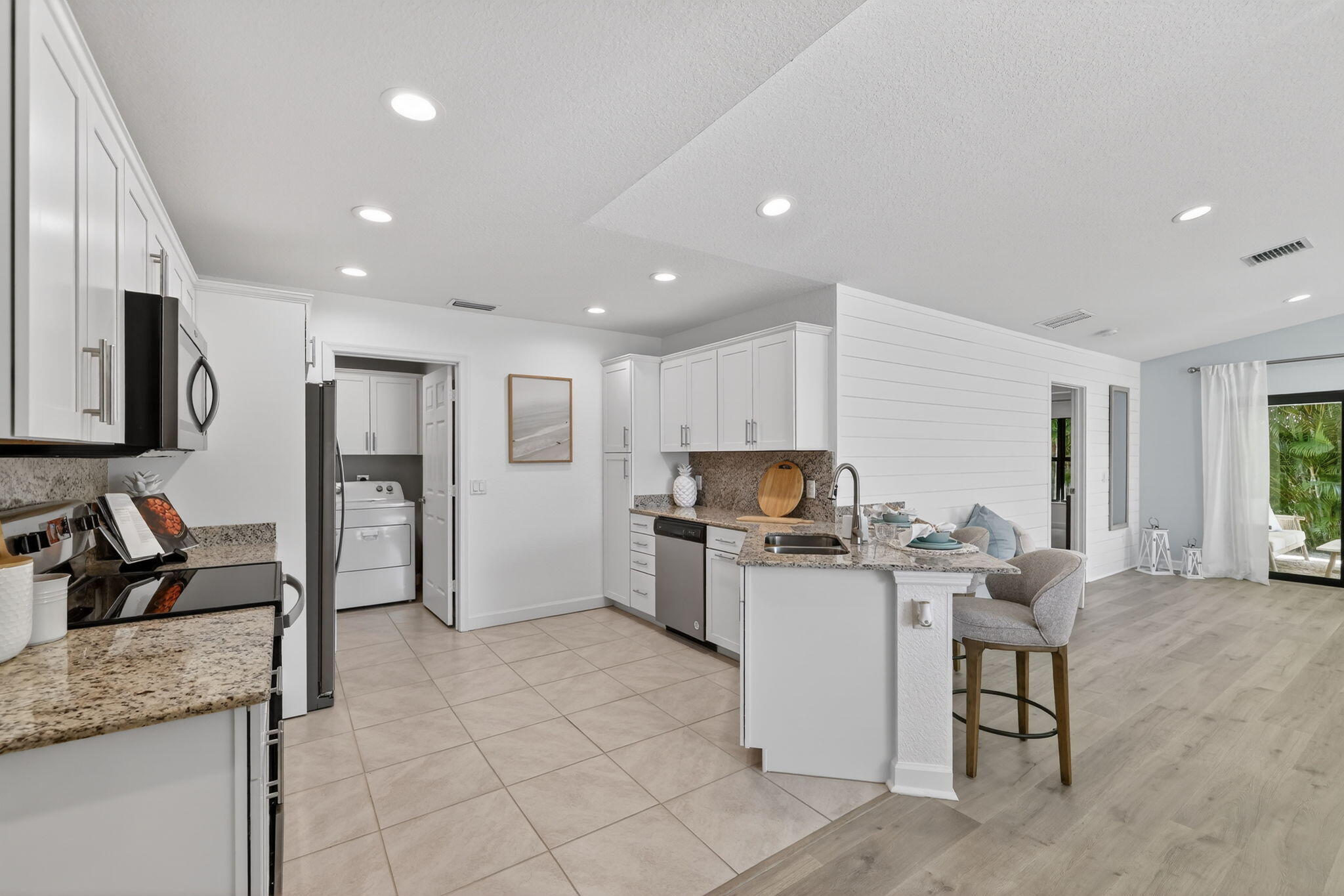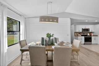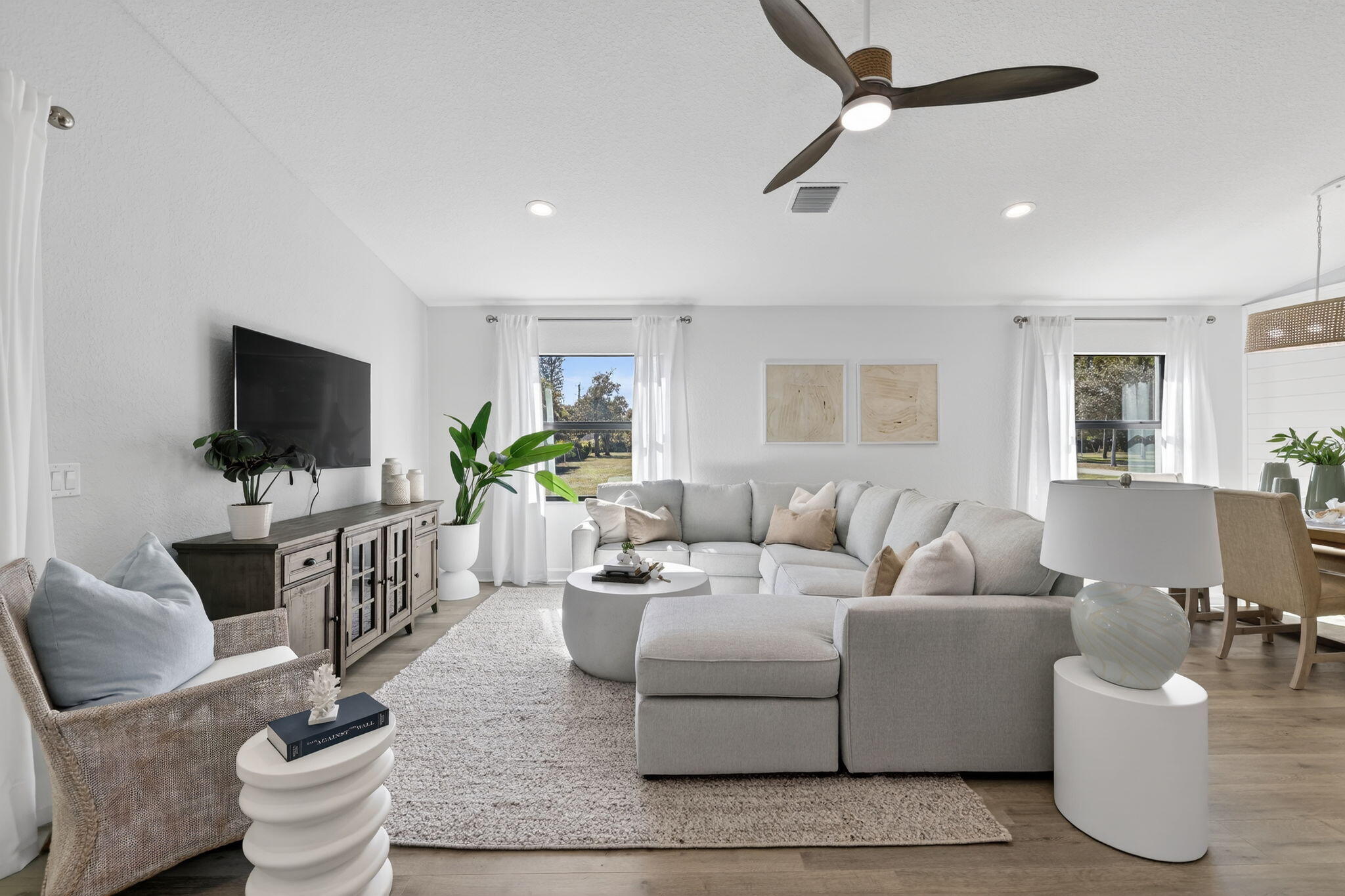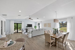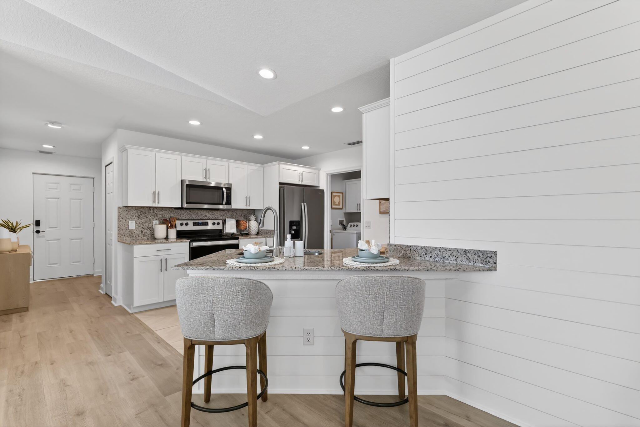 Discover true Florida living in the 2-bedroom, 2-bath Carlton model featuring a spacious layout, soaring vaulted ceilings, a covered front porch, and attached garage. Built with solid concrete block, this home boasts quartz counters, stainless steel appliances, and elegant finishes. The split-bedroom design ensures privacy while the open living area flows perfectly for entertaining. This move-in-ready home was built with 3/16th true plywood roof sheathing, hurricane tie straps, R-30 insulation, and hip roof designs ensuring big insurance premium discounts. Our homes also come equipped with energy efficient appliances, keypad door locks, a continuous quartz kitchen backsplash, plus durable and stylish 36-inch wood cabinets with a built-in pantry. Fixed Monthly Maintenance: $599/mo.