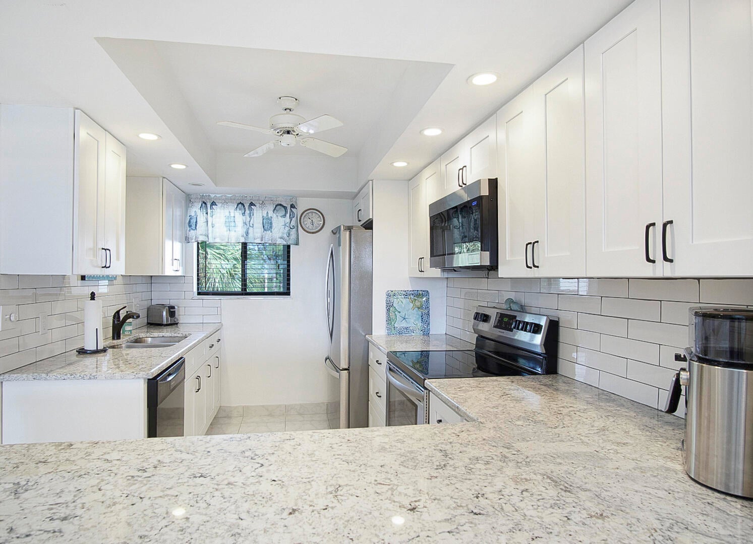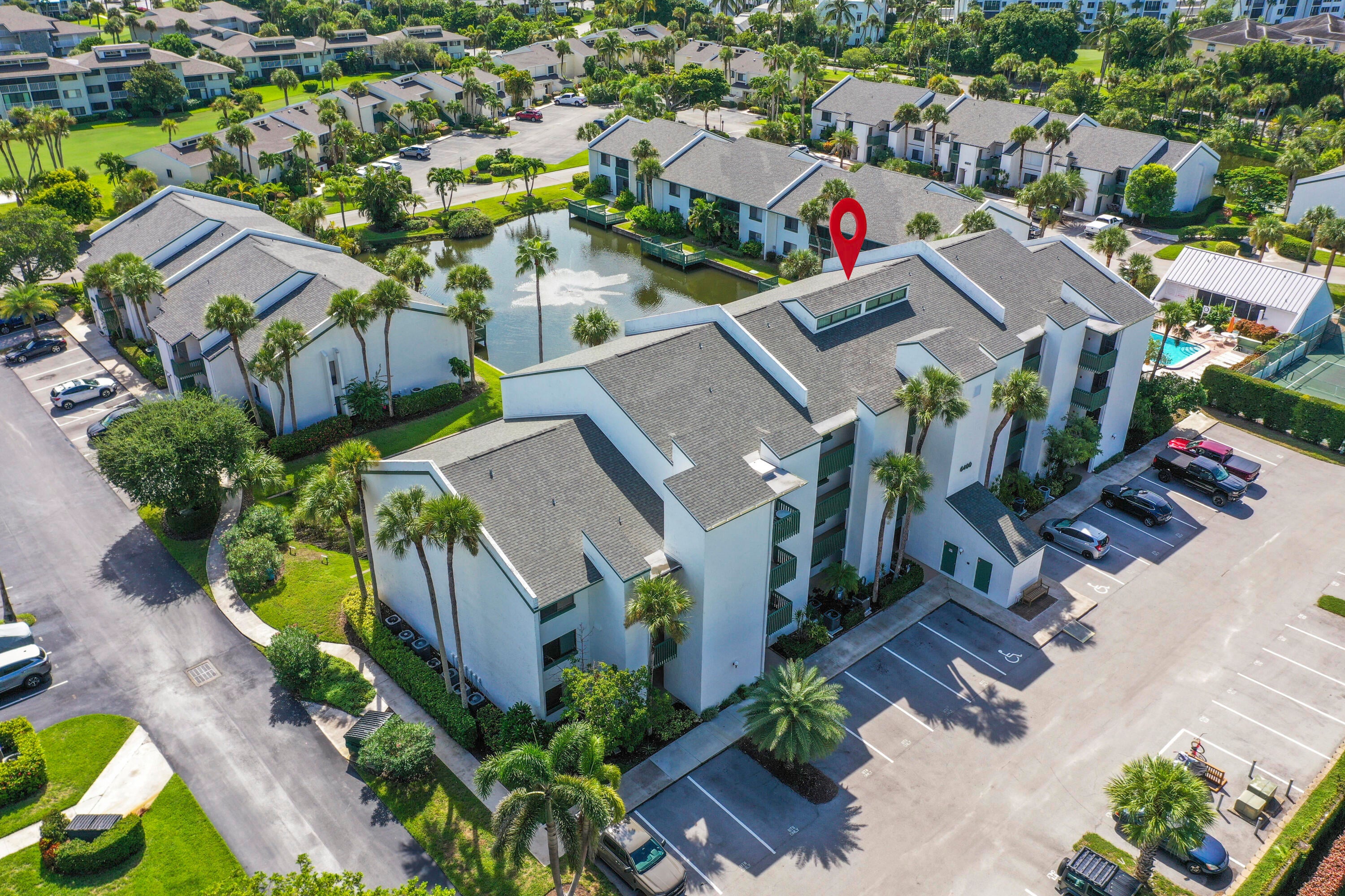 Gorgeous 4th floor 2 bed/2 bath unit features a beautiful quiet view from lanai overlooking the pond with slight ocean view. Turnkey top floor condo features vaulted ceilings, polished tile floors, freshly repainted, plenty of space and with great rental potential. New roofs in 2022, new HWH in 2023, new full size washer/dryer 2023, new refrigerator and TV 2023. Smart lock and thermostat also installed so you can keep track of the condo when not home. Enjoy beautiful Ocean Village and the many amenities it has to offer including 3500 feet of private beach, 9-hole 3 par golf course, bocce ball, shuffle board, pickleball, tennis, multiple pools and hot tubs, new fitness center and clubhouse, NEW restaurant and tiki bar, and NEW resort style main pool for 2025, 24 hour gated community.