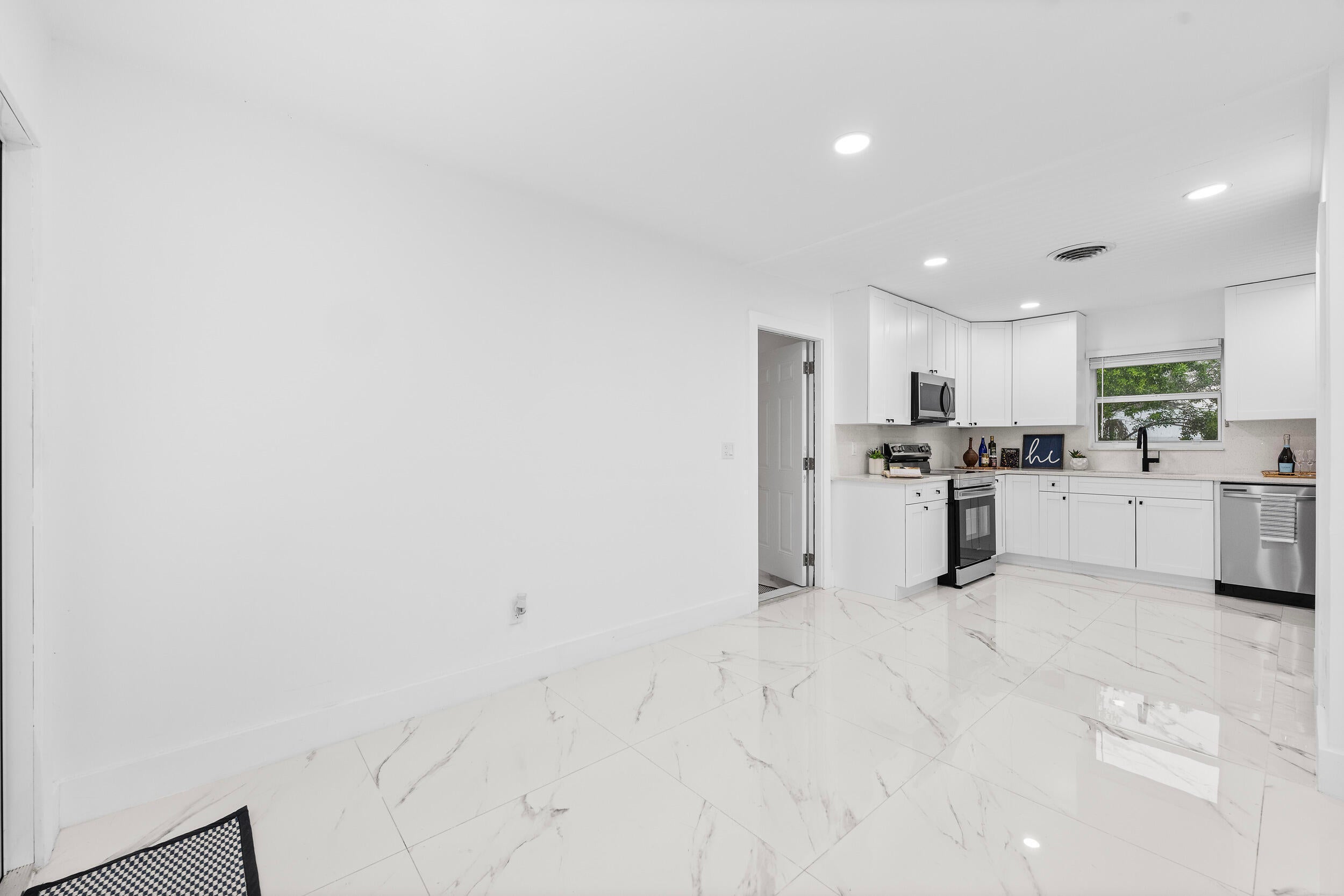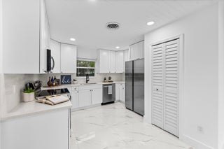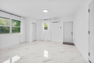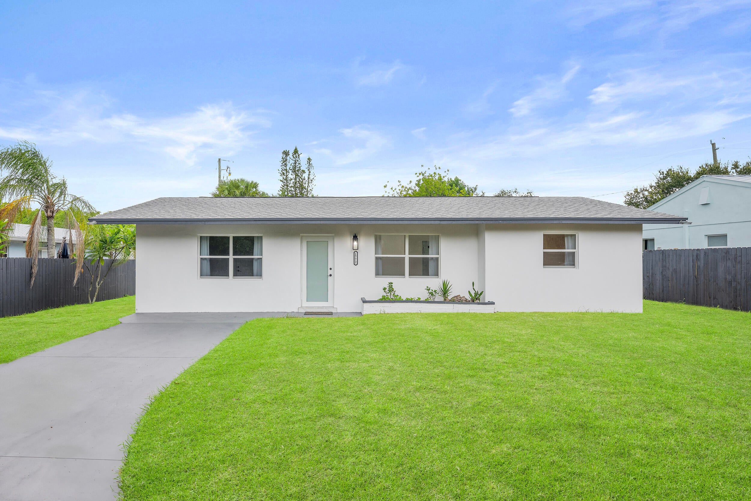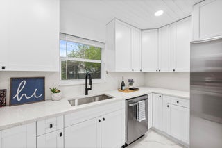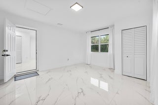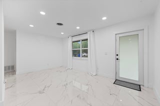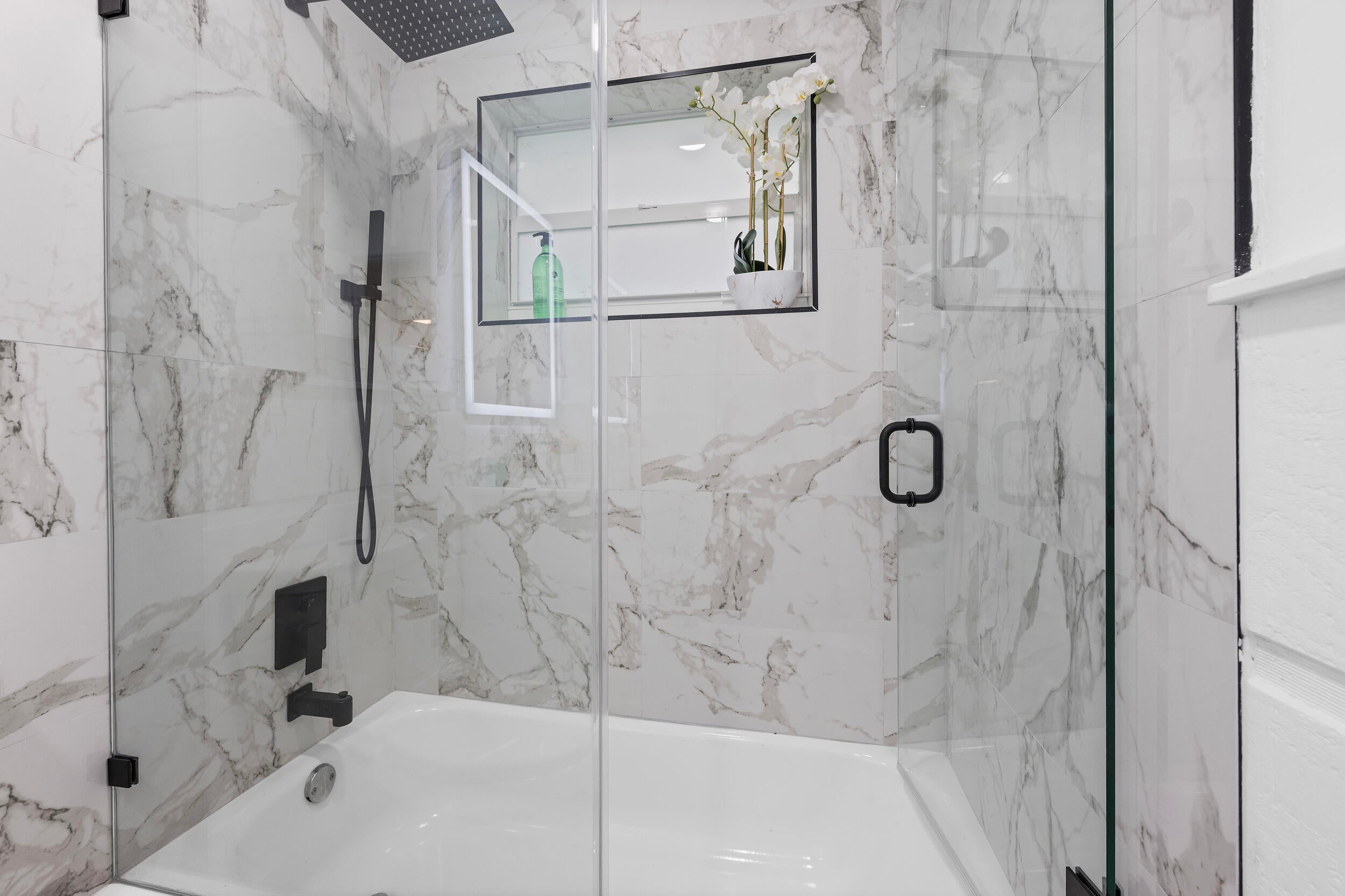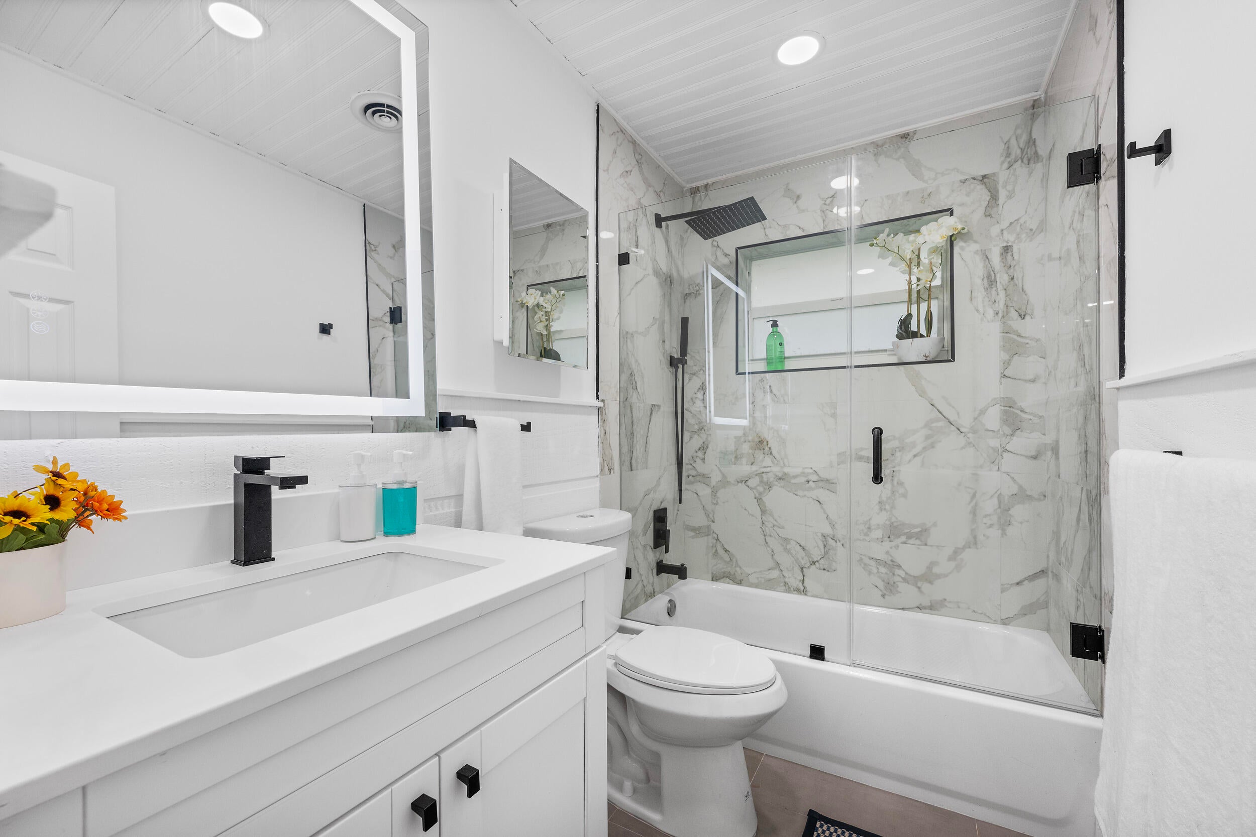 Modern, renovated 3-bedroom, 2-bathroom Jensen Beach home close to the surf with opportunity to rent half as an Accessory-Dwelling Unit (ADU) or Mother-In-Law Quarters! Updated kitchen with custom-wood-soft-close cabinets, ivory-quartz countertops and backsplash and new stainless appliances. Open-concept, 1,106-square-feet, with marble-porcelain-tile and impact-front door providing extra light. Sleek, black accessories include modern lighting, faucets and knobs. Large-main bedroom with private-entrance has en-suite bathroom - black-marble-tile shower with glass door, wooden vanity and lighted mirror. New stainless-stackable washer and dryer. That space has side-entrance door and private door to main house. Could be rented as studio to pay mortgage. Airbnb and mid-term .