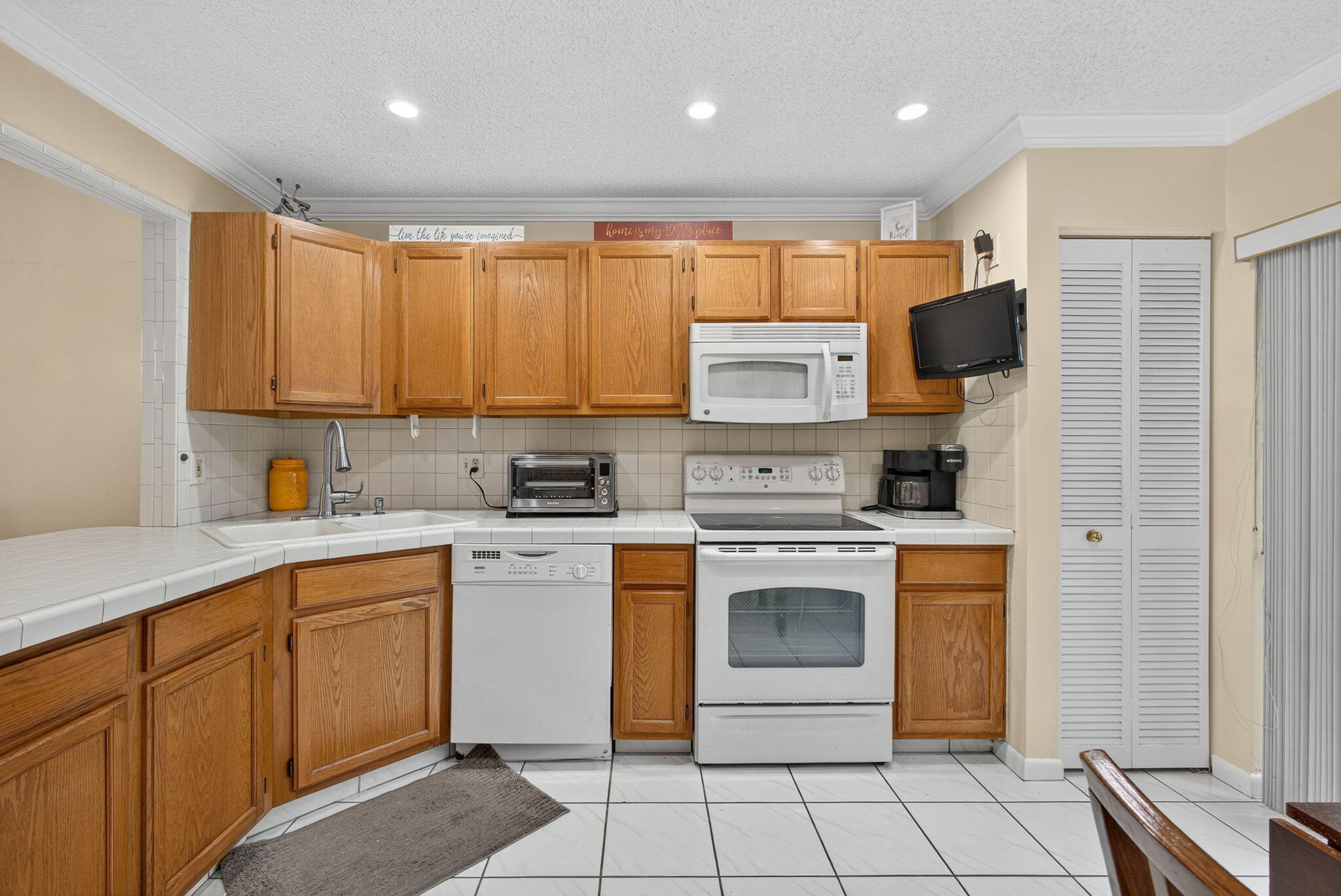 Welcome to The Arbours II, a 55+ community with a pool, clubhouse, and shuffleboard. One pet up to 25 lbs allowed. This 2 bed/2 bath split-floorplan villa features tile throughout, accordion shutters, inside laundry, and an enclosed air-conditioned patio for extra living space. The kitchen is bright with room for a small table and porch access via sliding doors. Vaulted ceilings in the dining/living area create an open feel. Washer/dryer included; furniture negotiable. Two parking spaces outside your door, just 15-20 minutes to the beach, and close to many shopping centers!