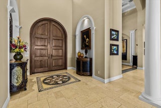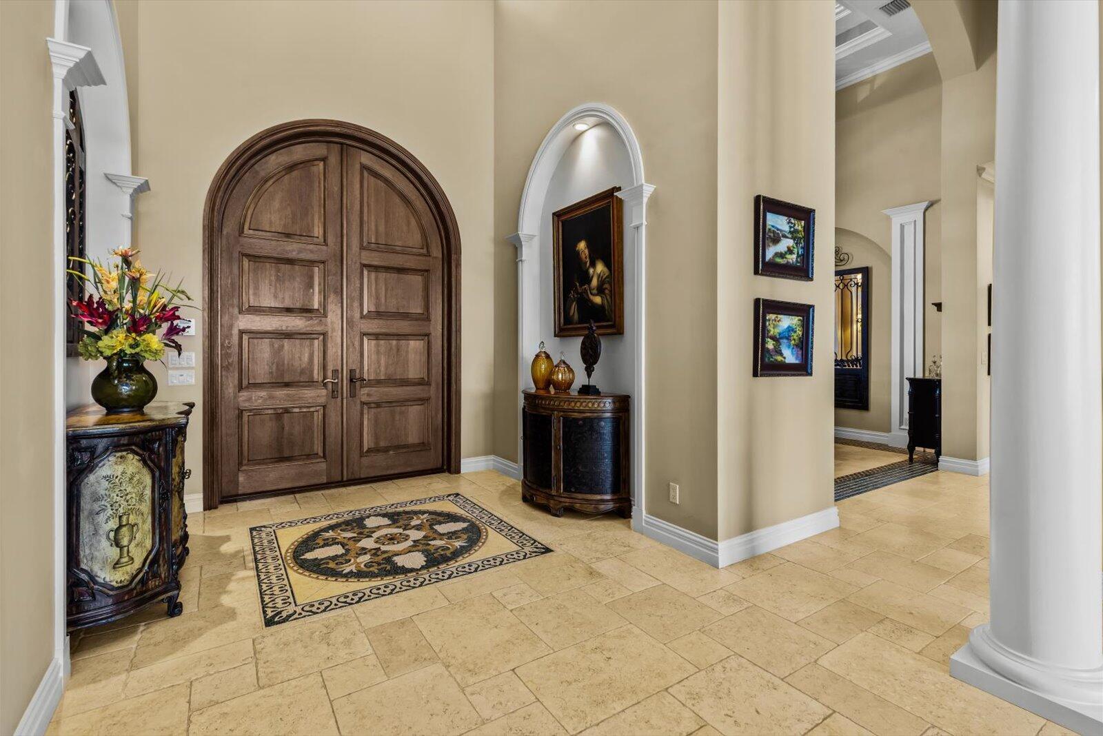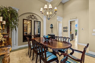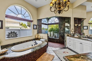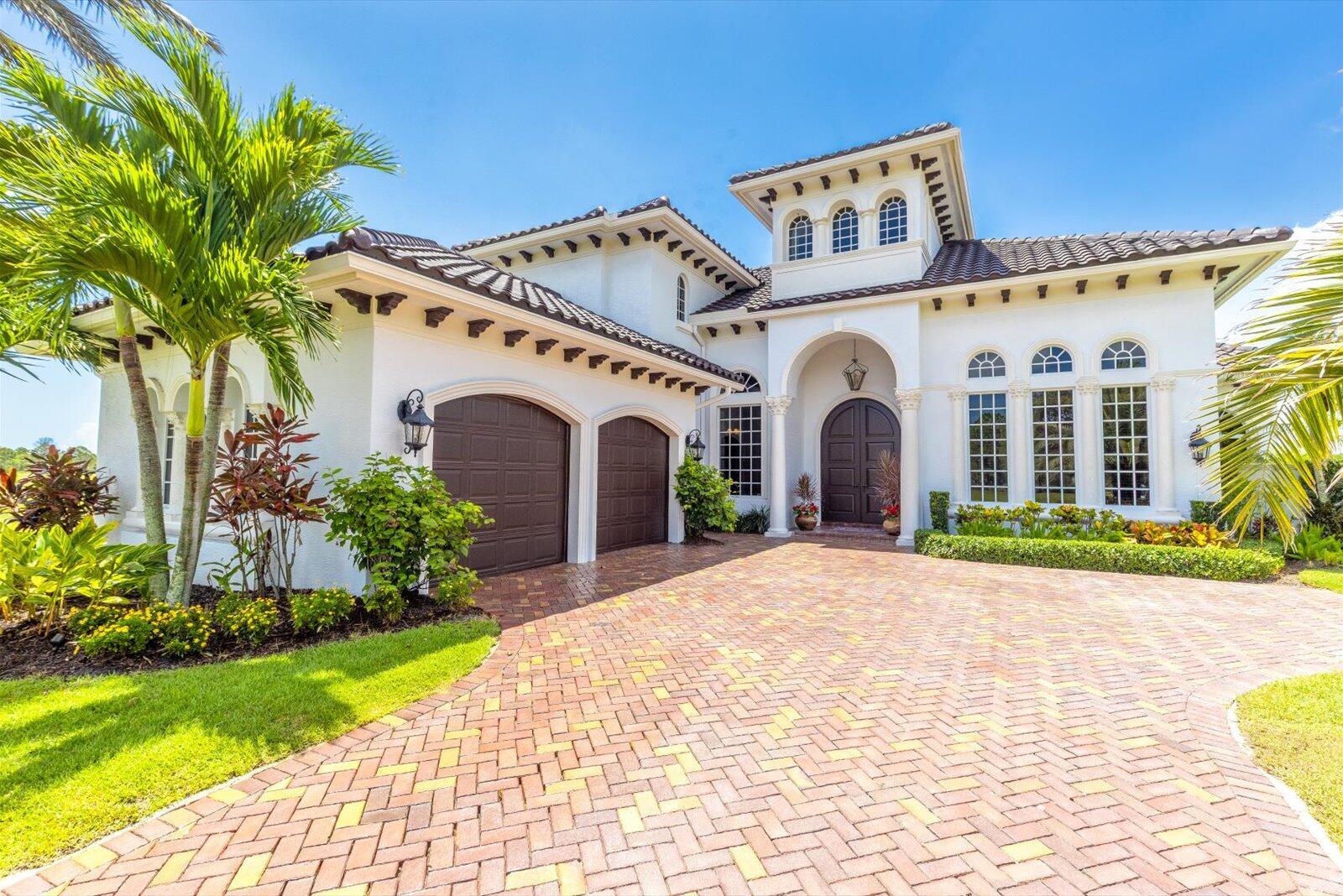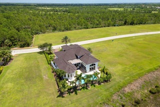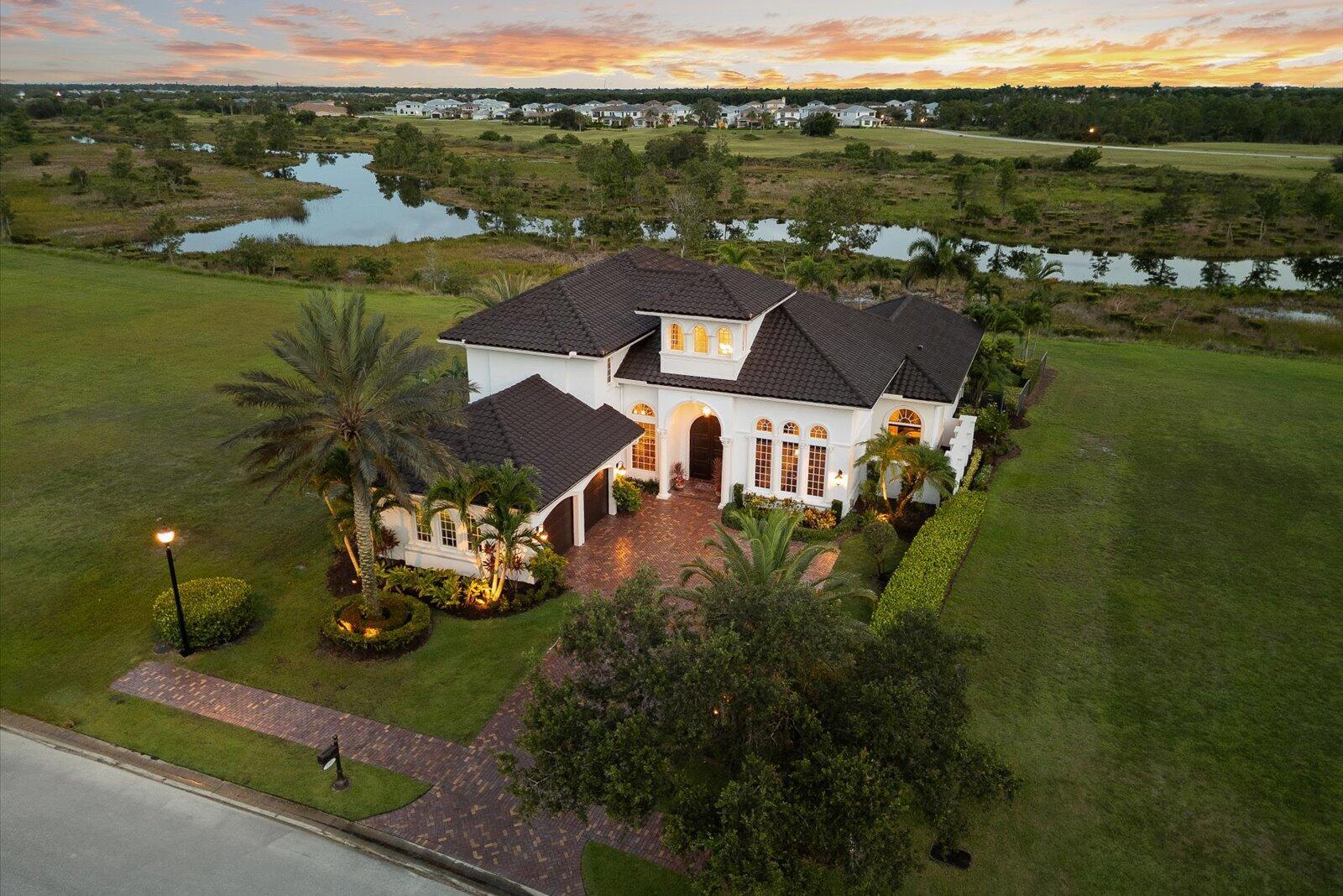 Exquisite Spanish Revival two-story home with long views of flowing freshwater creeks, preserve, & future golf course awaits you. Custom-designed & lovingly built, this home features hand-laid marble floors, 16 ft to 22 ft high ceilings, wide wood molding, a fireplace, a wet bar, & tall transom windows. The kitchen features a chef's island, breakfast bar, & top-quality appliances. The family room has a triple tray ceiling and features sliding storm-proof glass doors that open onto the patio and pool with a spa. The primary bedroom features a tray ceiling, six tall windows with custom arches, and detailed closets. The Primary bath features a spa tub, double vanities, and a roll-in shower that overlooks a walled privacy garden. The 2nd-floor guest suites feature private baths.