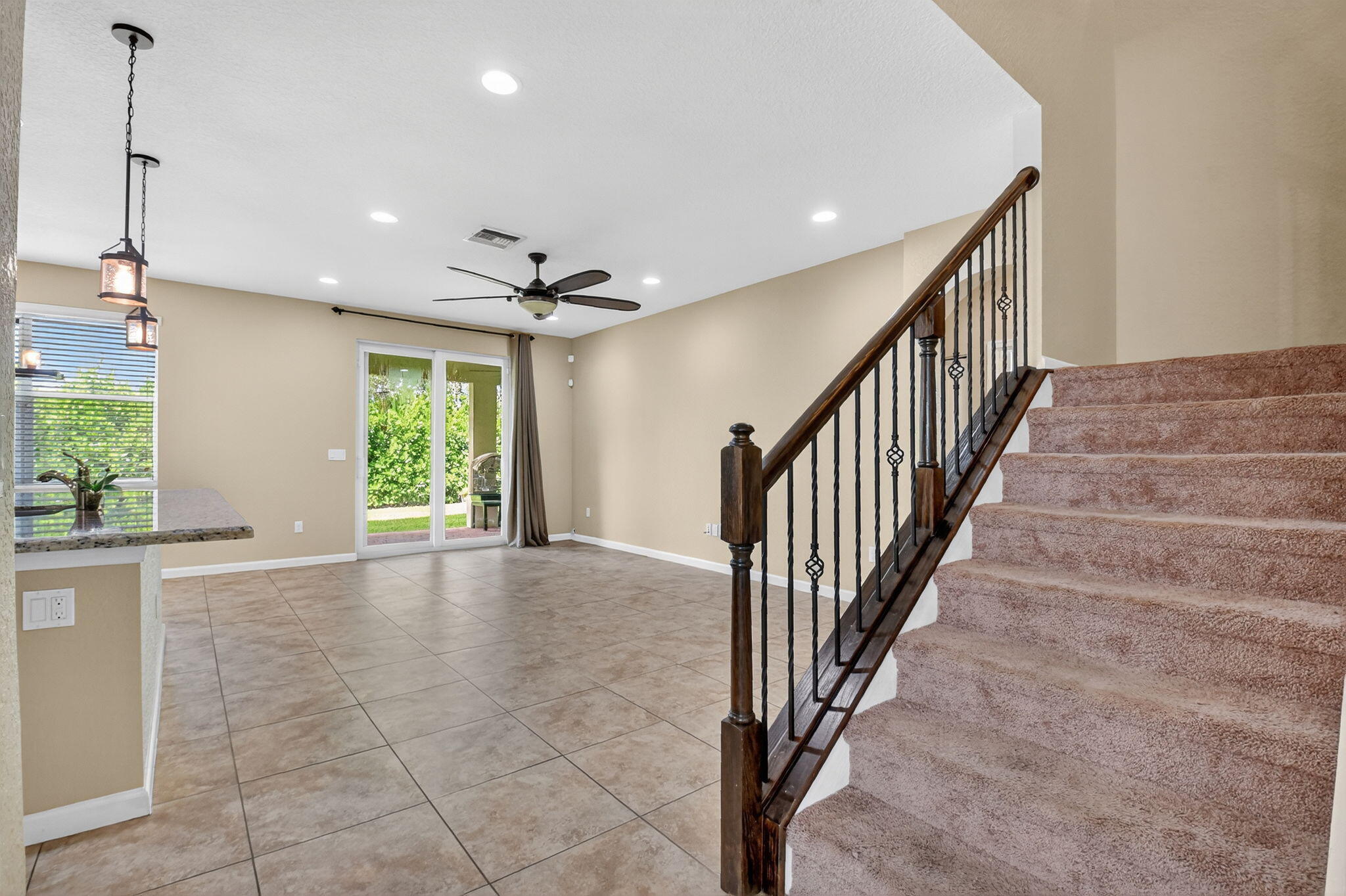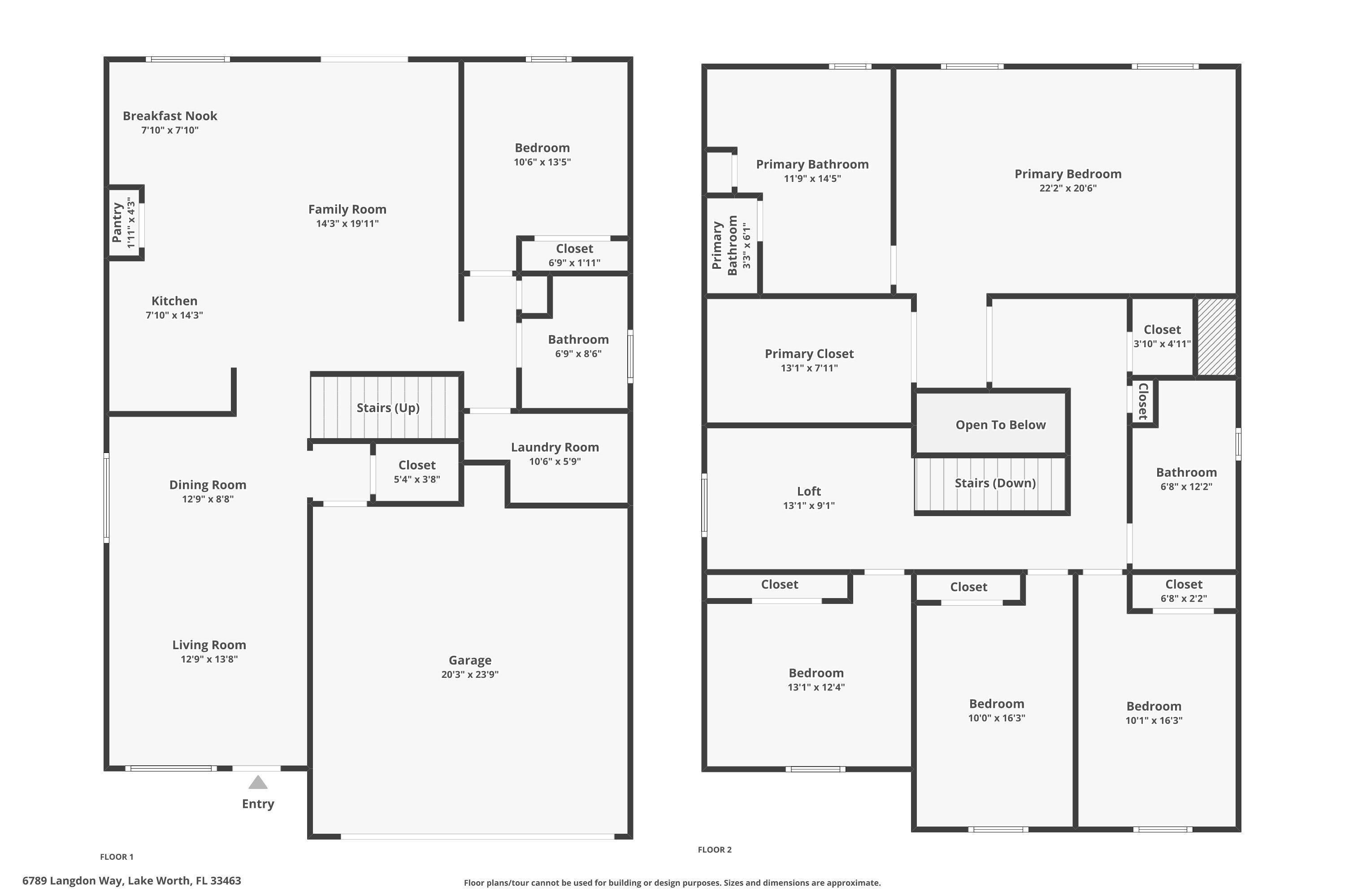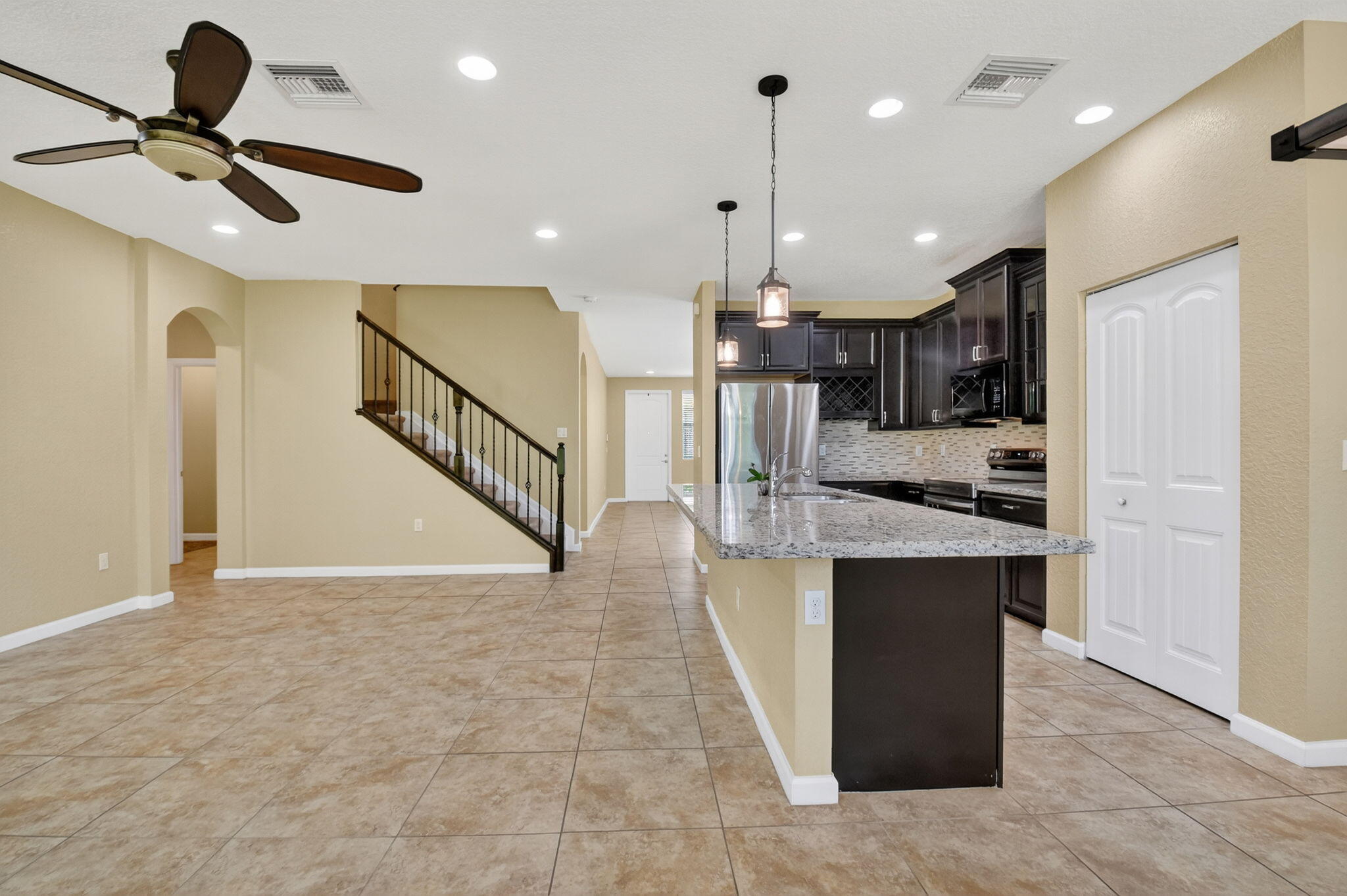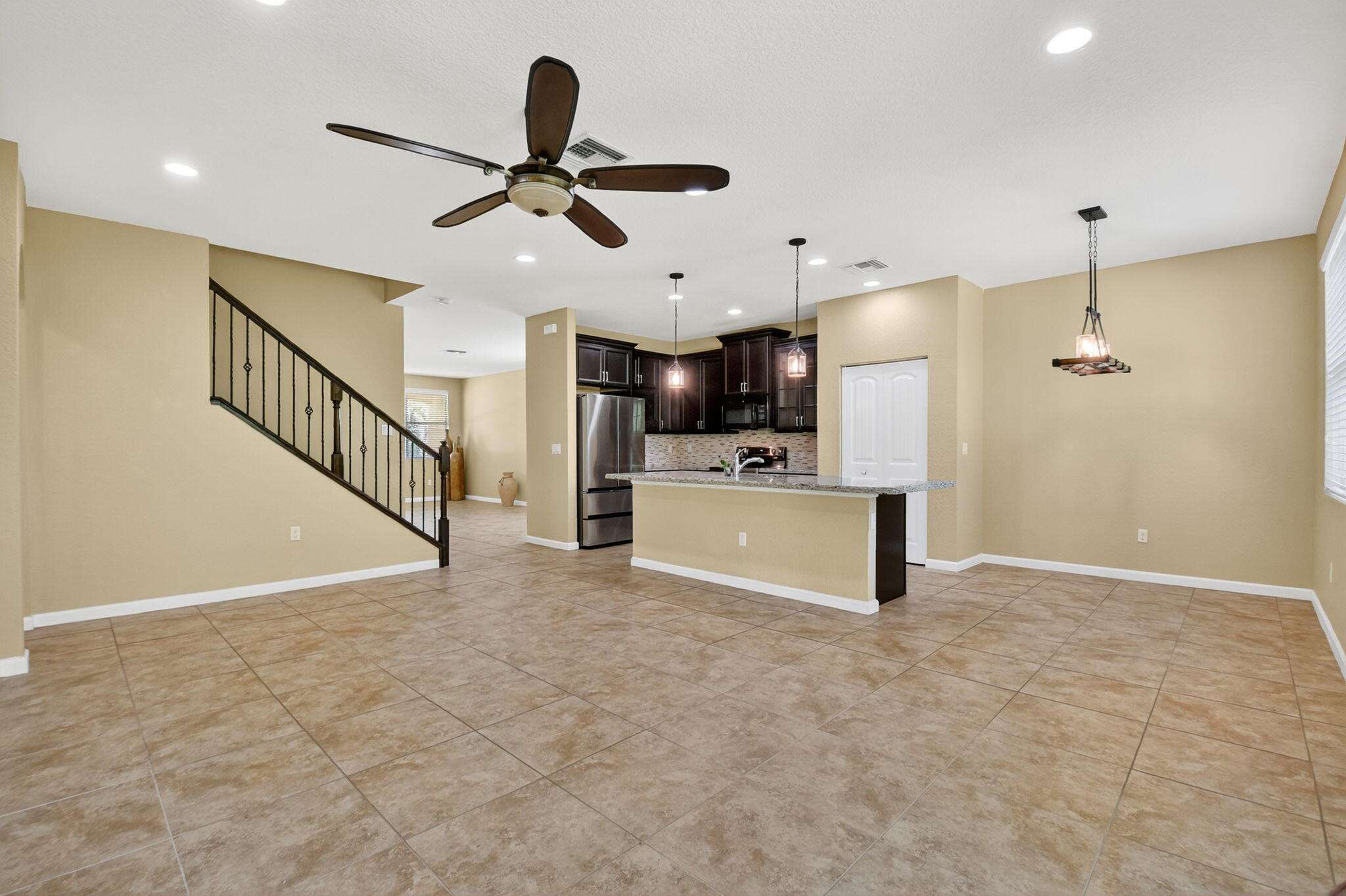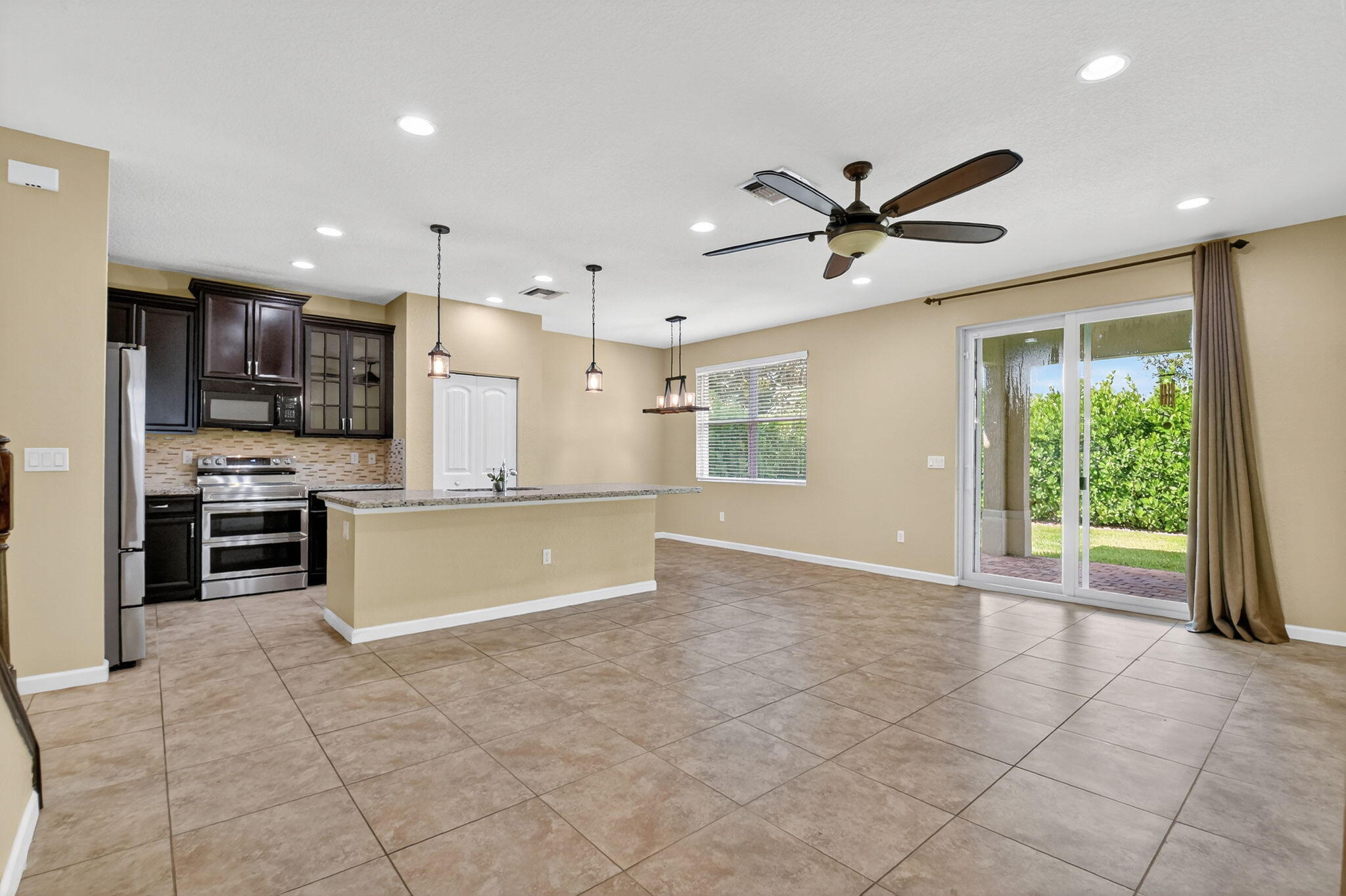 PRICED TO SELL! Beautifully maintained 5 bedroom, 3 bath home with 2,855 living square footage in the desirable Abbington gated community in Lake Worth! Built in 2016, this bright two-story home with two-car garage, boasts the privacy of being one of the northernmost home in the community, on a quiet end street!Enter through the grand living room and dining room space, offering high ceilings and neutral tiled flooring. Ceiling heights and flooring continue in to the spacious family room aside the open gourmet kitchen offering granite countertops, a tiled backsplash, stunning espresso wood cabinetry, large chefs island with sink, stainless steel appliances and a substantially sized breakfast area. Another exceptional property highlight is ...the well-thought out downstairs guest bedroom with full bath accessibility and separate laundry room with NEW Whirlpool washer and dryer with transferable warranty! Enjoy peace of mind with all impact windows, sliders and doors throughout, as well as a home security system. Serene covered paved patio with fan, looks out over large grassy area with mature Calusia privacy hedges. Cast iron and wood handrails lead to a well-designed floor plan on level two with three guest bedrooms, a large guest bath with double sink, a sizable loft area for added optional usage. The grand primary bedroom is a split floorpan design, offering full privacy, as well as a generously oversized closet an impressive primary bath with double sink, separate shower, soaking tub, linen closet and water closet. Stairway and upstairs flooring offers lush carpeting. The Abbington association provides its residents with lawn care, a secured gated entry, a low HOA, a community pool and clubhouse! These homes do not come on the market often! Don't miss this incredible opportunity to secure this stunningly luxurious well-priced home in the coveted Abbington gated community!