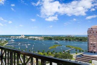 This spacious, sun-filled 2 bedroom, 2 bath with an open floor plan features sweeping views of West PB. The kitchen has ample cabinetry with stone countertops, stainless steel appliances, and a separate laundry. The open kitchen/dining/living room features continuous ceramic tile flooring, high ceilings and access to the large balcony. Both spacious bedrooms have large windows and custom closets. The master bedroom has two walk-in closets and oversized bathroom with dual vanity and a separate tub and shower. One City Plaza residents enjoy 24 hour concierge, valet parking, roof top pool with pool deck steam room & sauna, social room, and well equipped fitness center. Near Brightline Stat