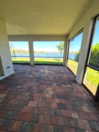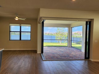 Gorgeous lakefront house built in 2022: 4 bedrooms, 2 bathrooms, large living room and dining area. Fully fenced backyard - perfect for dogs. Wood-like tile and LVP flooring throughout the house (no carpet anywhere!). Impact windows & doors. 2-car garage. Blackout shades in bedrooms. Energy efficient LED lighting throughout the house. Fans in each bedroom and living room. Huge, screened patio with a zero-corner, pocket sliding glass door allows you to enjoy the best lake and fountain view in the community. Laundry room with a sink. Gated community with a spectacular resort-style community pool, fitness center, tennis courts, pickleball courts, and a clubhouse accessible to residents via key fob. Fast HOA approval. Must see it to appreciate it!