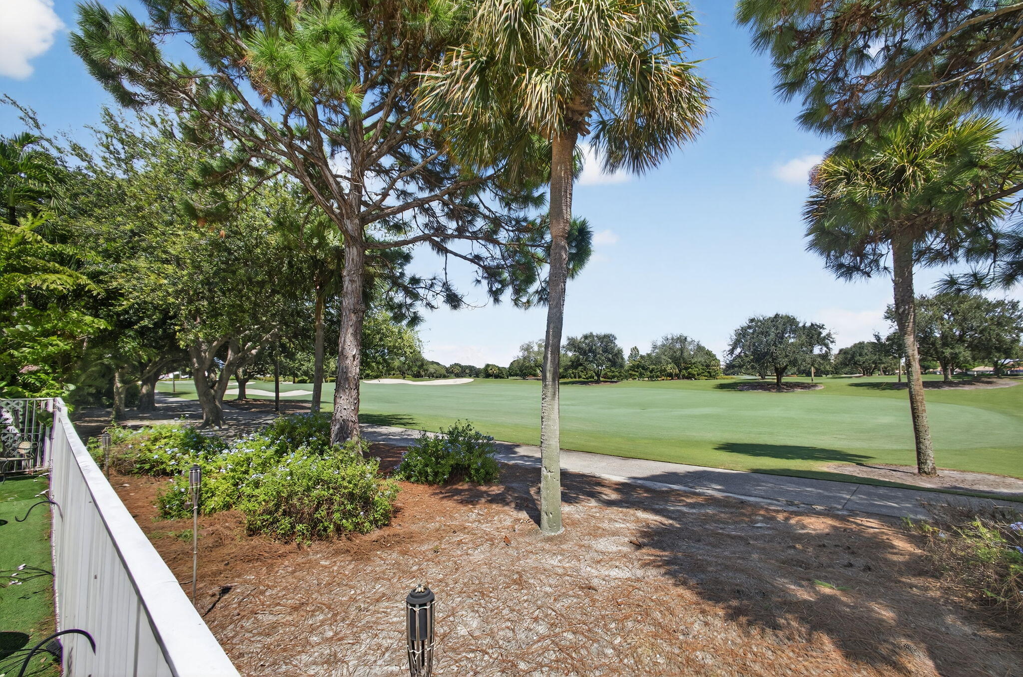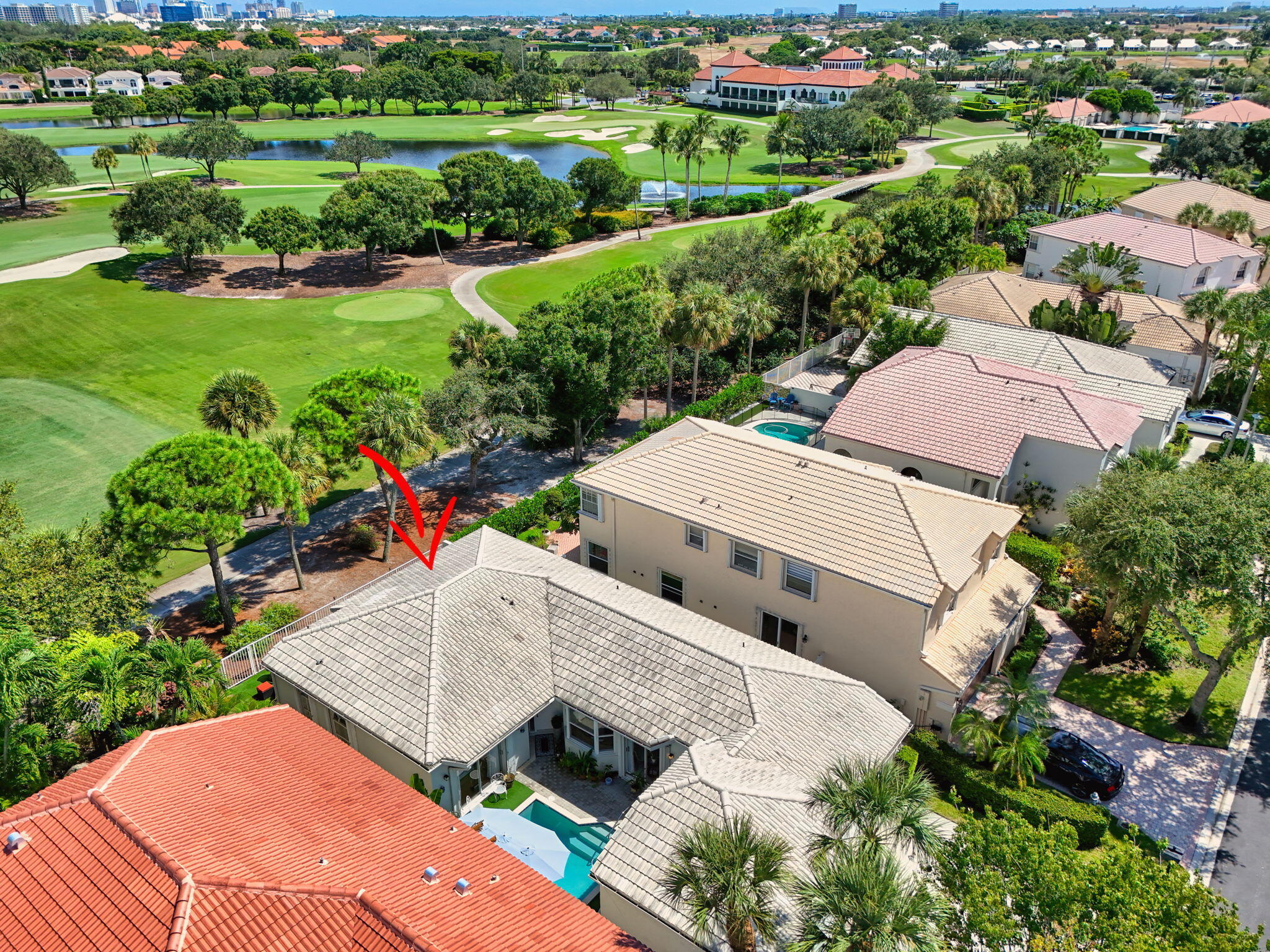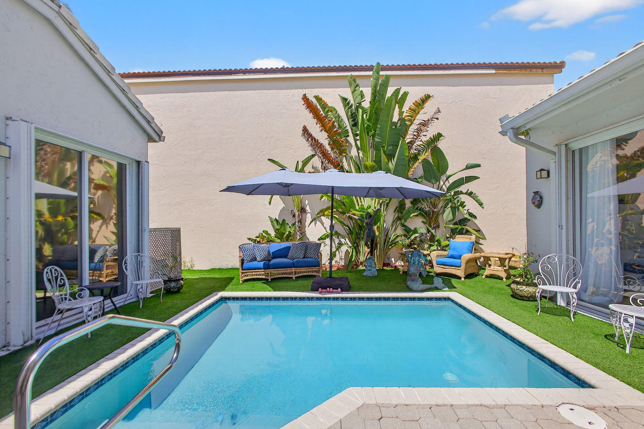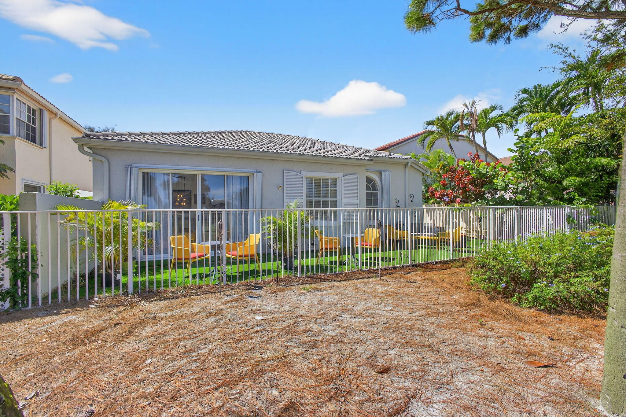 Rarely available single-story courtyard home perfectly situated on a private golf course lot! Experience the best of South Florida living with this distinctive floor plan, where the heart of the home opens to a private courtyard and sparkling pool surrounded by lush tropical landscaping. Start your mornings with coffee overlooking the tranquil fairways or unwind poolside in total privacy. The main residence boasts 2 bedrooms and 2 bathrooms, filled with natural light and highlighted by wood and tile flooring (no carpet!) The open airy design seamlessly blends indoor comfort with picturesque golf course views, creating a home that is both inviting and unique. The kitchen has been tastefully updated with plenty of cabinetry, Corian countertops,and an oversized stainless steel Kitchen Aid refrigerator - ideal for everyday cooking or hosting family and friends. A cozy breakfast nook with bay window, light-filled dining area, and spacious living room with sliders to the outdoor patio make the home feel open and welcoming. The primary suite is a relaxing retreat with 2 closets, direct access to the pool and a large bathroom featuring dual vanities, a Roman tub and separate shower. A comfortable guest bedroom and updated bath with a frameless glass tile shower complete the main home's generous living space. The charming guest house offers a private retreat with 1 bedroom, 1 full bath, its own entrance, and sliders leading to the pool - perfect for in-laws, teens, guests, or even a home office. The peaceful back and side yards are finished with low-maintenance artificial grass and provide plenty of room for seating and entertaining. All of this comes fully fenced and ideally positioned along the 1st hole of the Lakes Course at Bear Lakes Country Club, offering serene views and a rare opportunity to own such a distinctive layout. This unique courtyard floor plan rarely comes on the market - don't miss your chance to call it come! Live in one of the Palm Beaches most amazing golf course communities without having to pay a mandatory membership. LOW HOA fees include access to 2 community pools, well-maintained tennis facilities, racquetball courts, volleyball, basketball, playgrounds, and miles of beautiful, landscaped roads with wide sidewalks for biking & jogging. Conveniently located to all the BEST that West Palm Beach has to offer! Only minutes from main highways, restaurants & shops, beaches, Palm Beach Airport, City Place, Clematis Street, the new Outlet Mall, the Kravis Center for the Performing Arts and more!