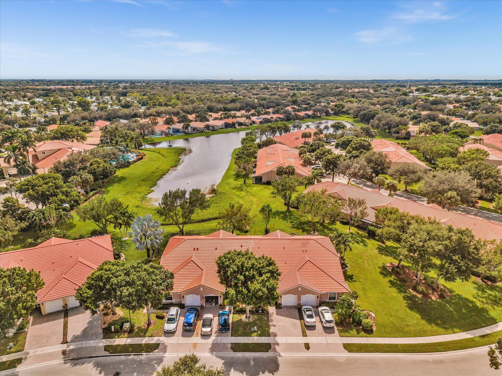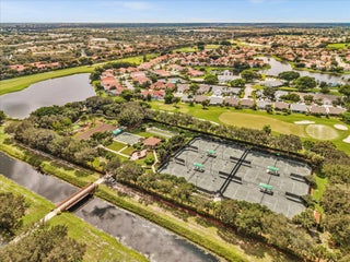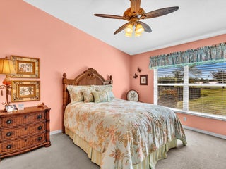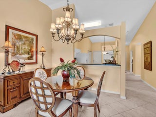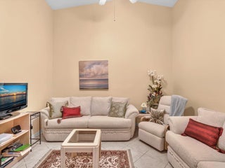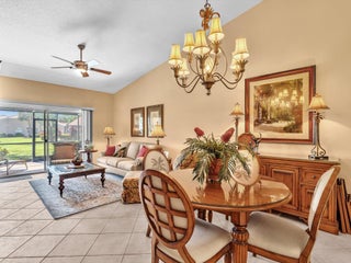 Lake-view Milan model villa with 2 bedrooms, 2 baths, den, and screened/roofed expanded patio. Spacious 1,396 A/C sq ft (1,735 total) plus one-car garage and covered entry. Vaulted ceilings, diagonal tile in main areas, accordion shutters, security system. Kitchen opens to dining/living with ample cabinets, chandelier, and GE washer/dryer. Lightly used by seasonal owner; Tommy Bahama style FURNISHINGS NEGOTIABLE SEPARATELY. Tuscany Bay is a gated 55+ active community with renovated clubhouse, pool/spa, tennis, pickleball, bocce, putting green, exercise trail, and clubs galore. HOA $566 includes cable, internet, alarm monitoring, landscaping, exterior painting and roof cleaning. Pets allowed, leasing after 18 months.