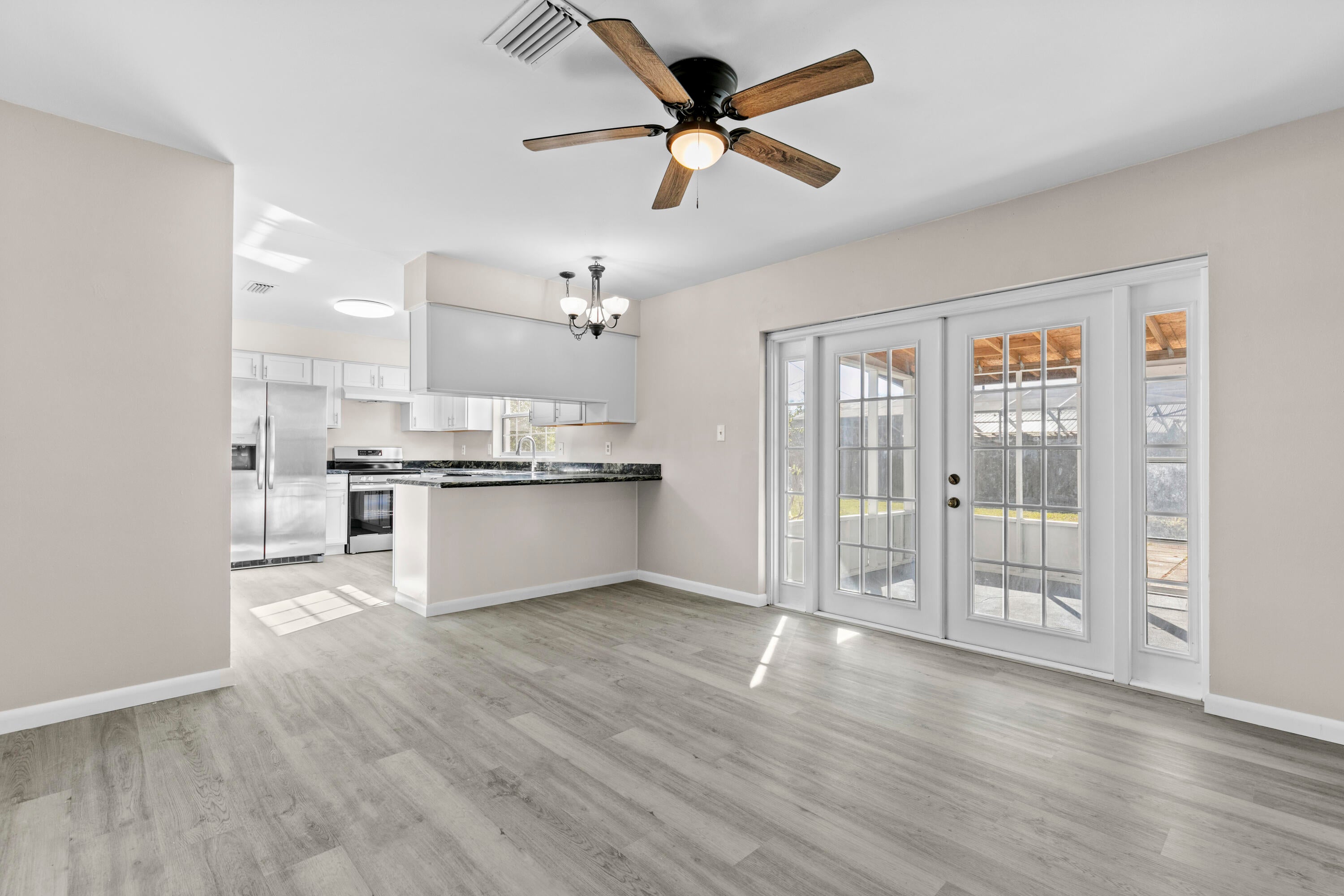 Stunning! Fully upgraded and freshly painted 3 bedrooms 2 bath and den that could easily serve as a fourth bedroom. One story house is located in the heart of Gainesville, just 3 miles from Ben Hill Griffin Stadium! The kitchen has granite countertops with stainless steel appliances and it has a NEW stove and refrigerator 2024. The Guest Bathroom features a shower tub combo and the master bathroom has a walk in shower. Real wood floors throughout the house, and the dining room with French doors to enter the spacious backyard with a screened patio. The home features a convenient carport and a fully fenced backyard, providing plenty of space for outdoor activities and relaxation. A/C, Water Heater, Plumbing and Drain Field Replaced in 2024.NEW ROOF In 2022.