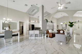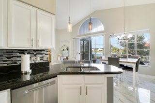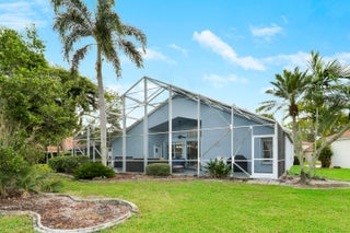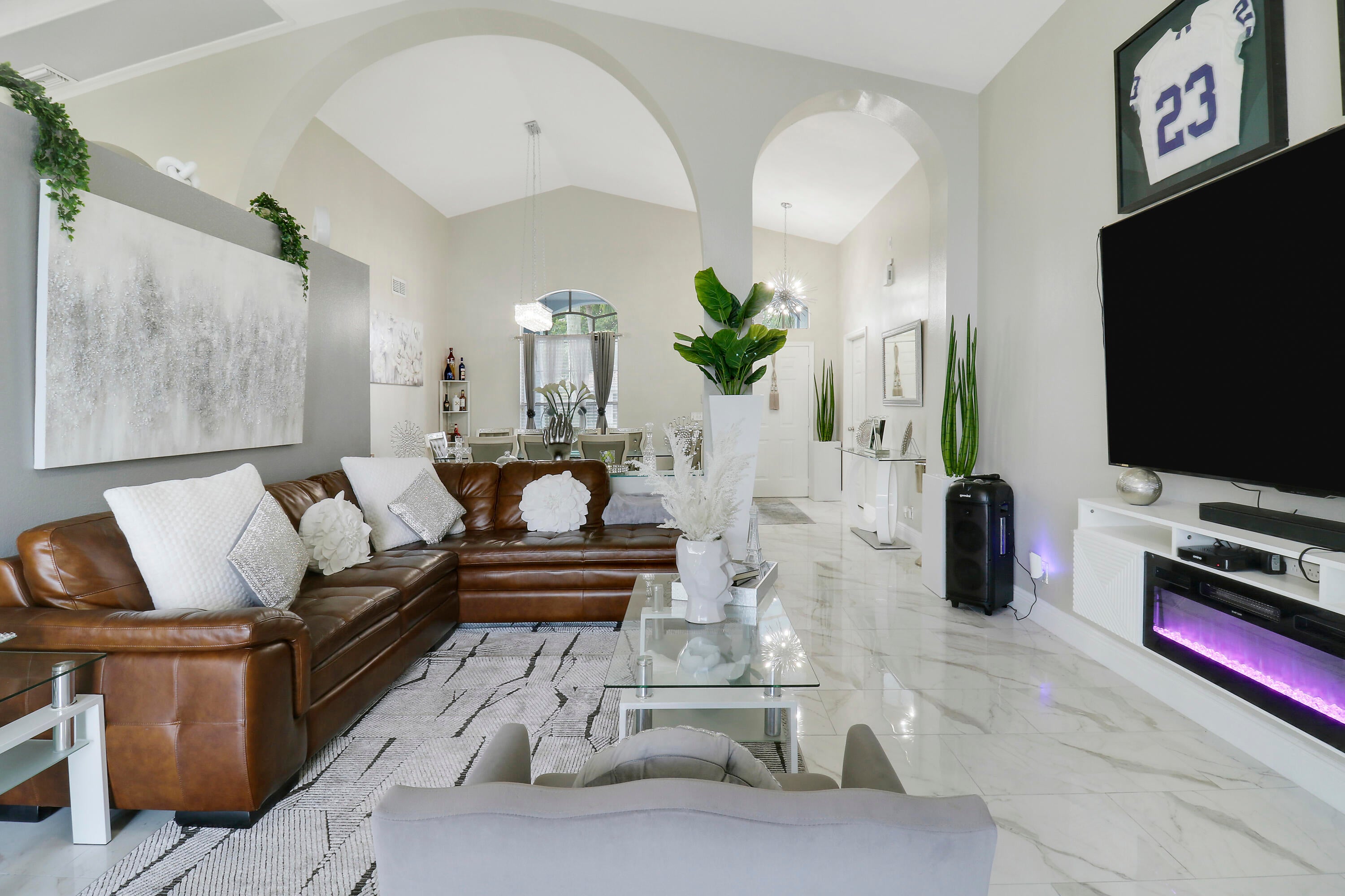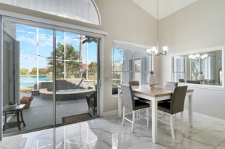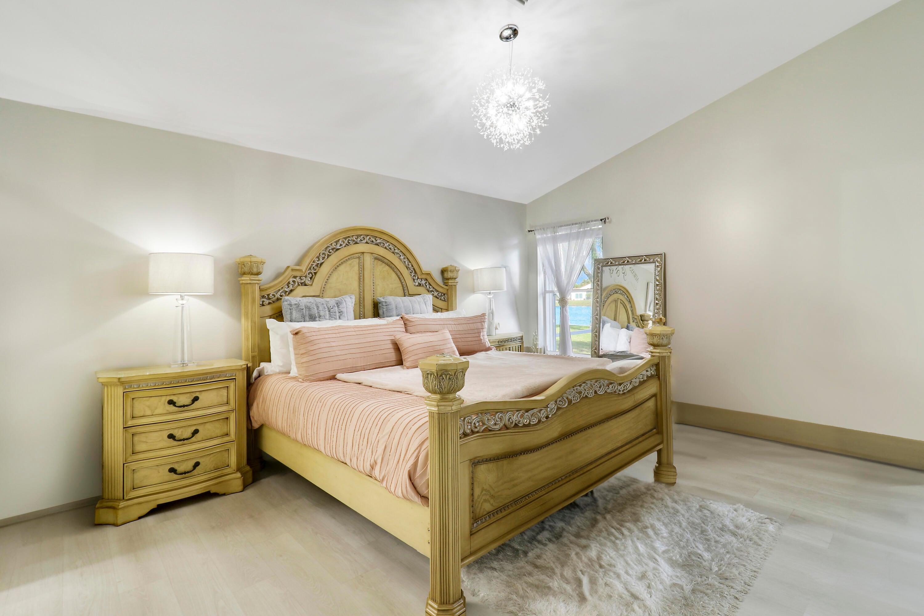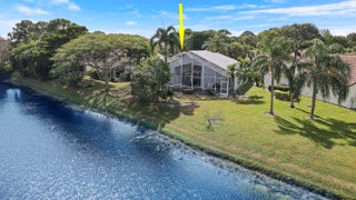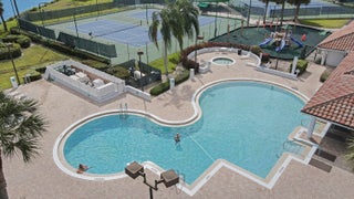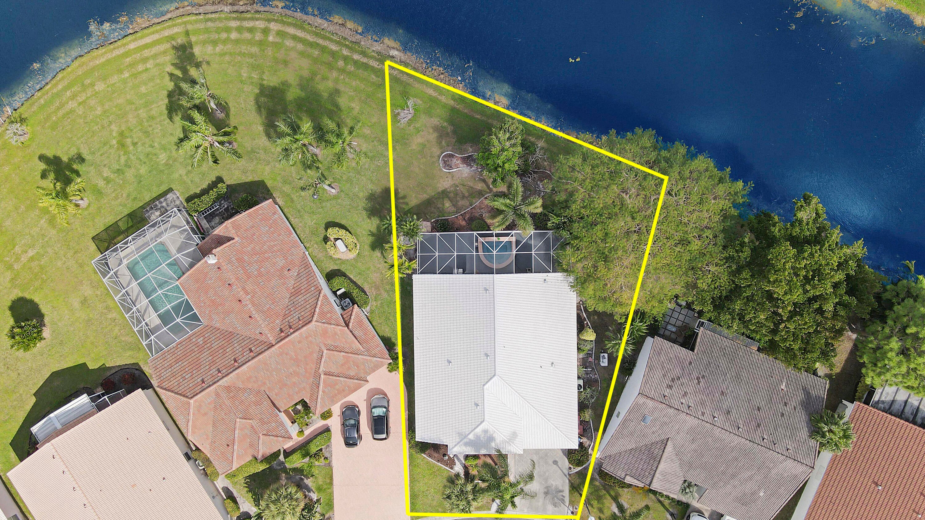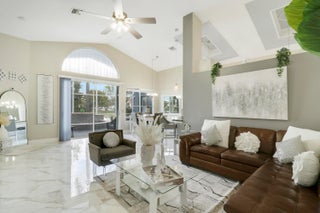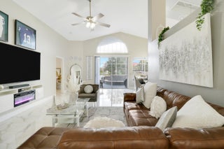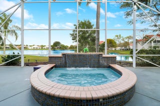 Spectacular lakefront 4-bedroom home in sought after River Bridge. Upgrades include: 2024 ROOF, KITCHEN BACKSPLASH, APPLIANCES, PORCELAIN MARBLE STYLE FLOORS in living areas and laminate wood floors in all bedrooms. The tastefully remodeled second bathroom doubles as a cabana bath. Additional features include high ceilings a spacious SCREENED IN PATIO w/A LARGE INGROUND SPLASH POOL w/WATERFALL OVERLOOKING THE LAKE. Accordion shutters throughout and so much more.