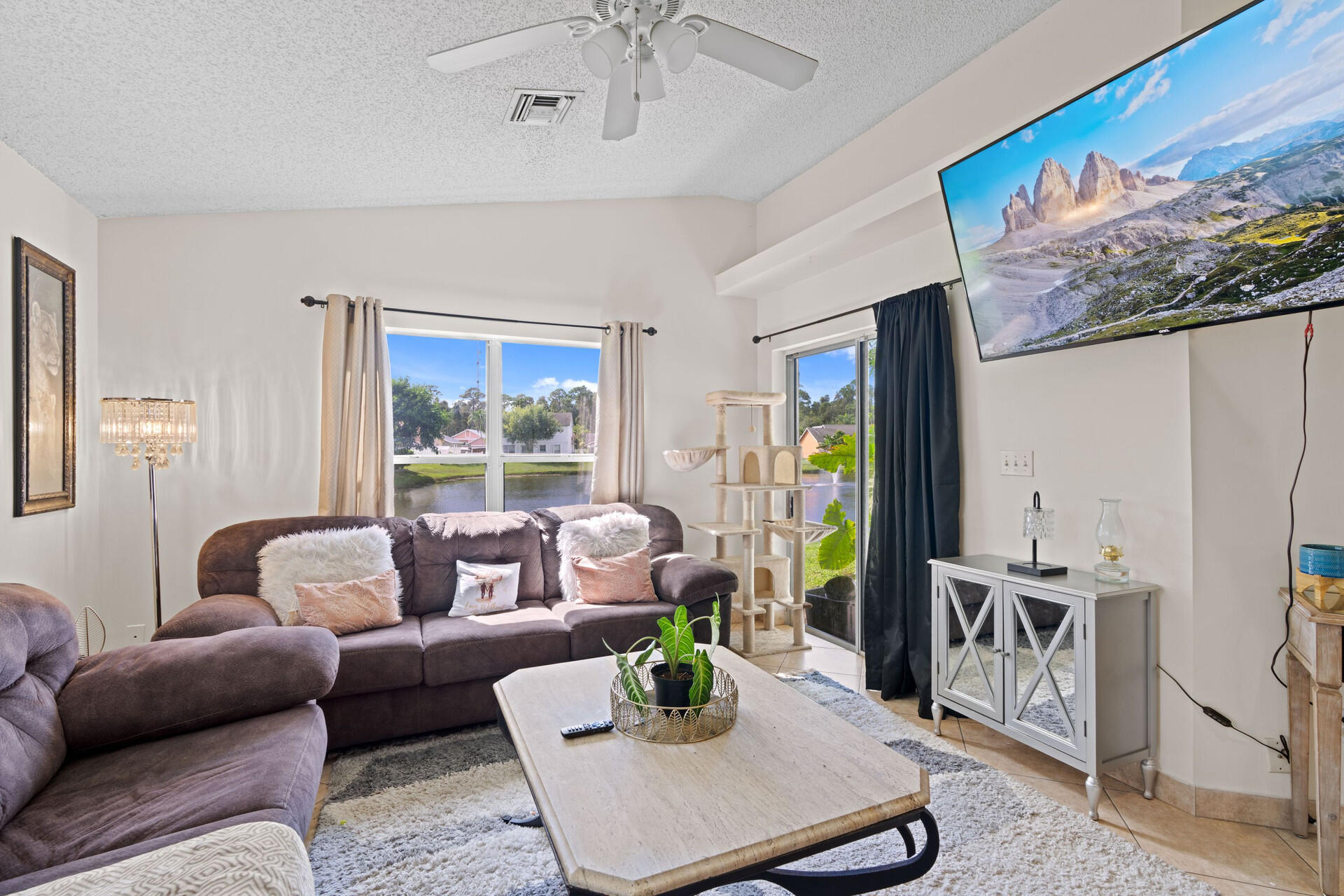 Well-maintained 3BR/2BA single-family home with 2-car garage in a gated, lakefront community. Features an open floor plan with ceramic tile throughout, spacious living and family rooms, dining area, and split bedrooms with large closets. Enjoy lake views from the screened porch or open deck. Foxhall is a family-friendly neighborhood with HOA that includes high-speed internet/cable, pool, dog park, and playground. Minutes from PBI Airport, I-95, Turnpike, beaches, golf, dining, and shopping. This home won't last!