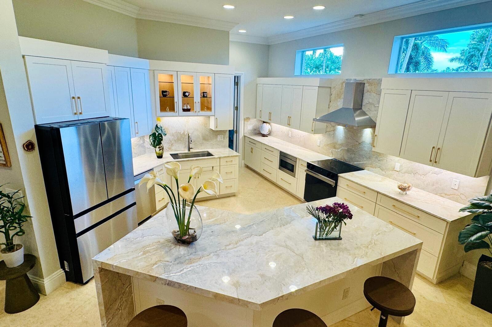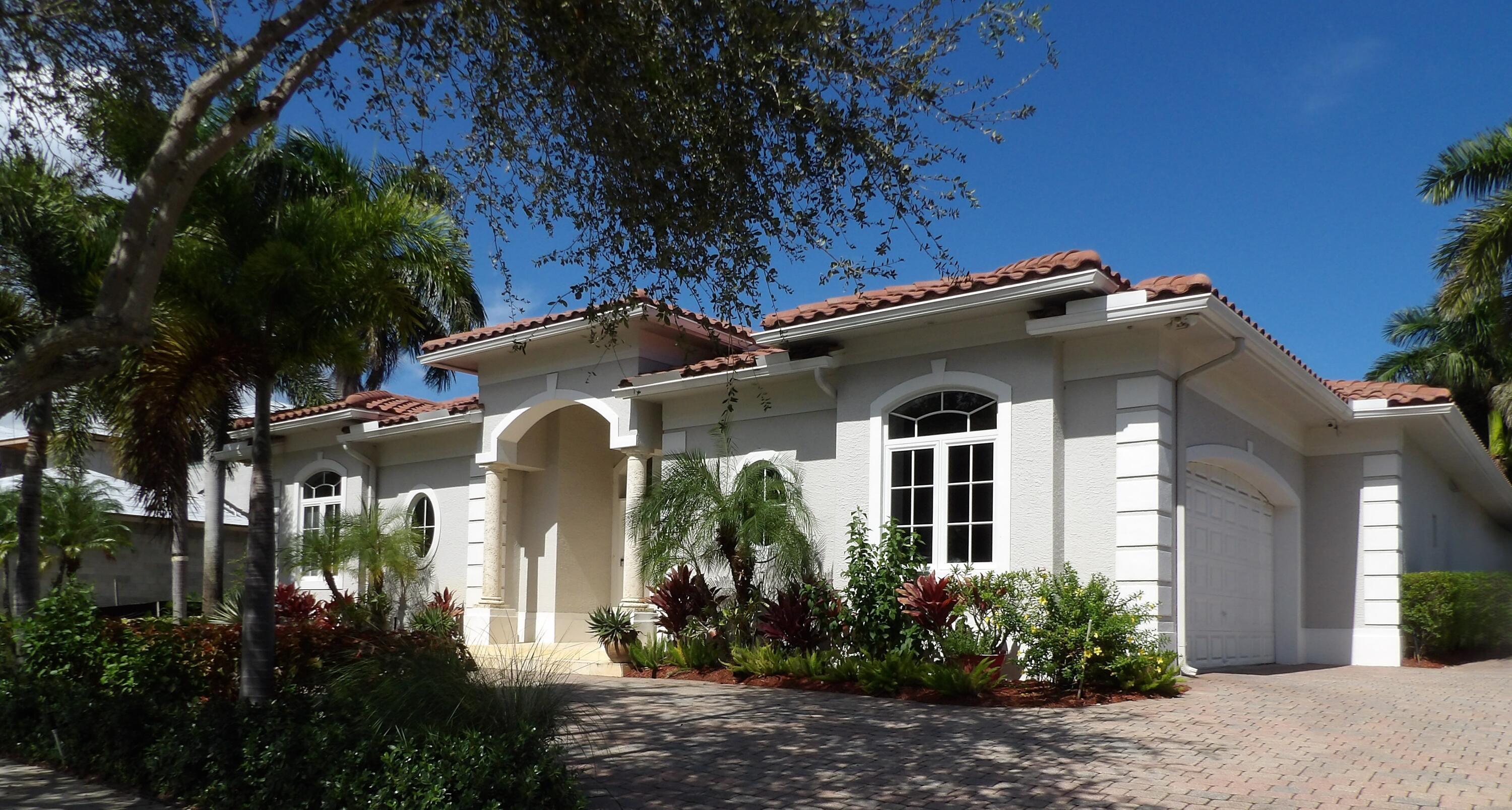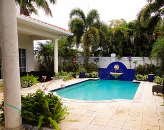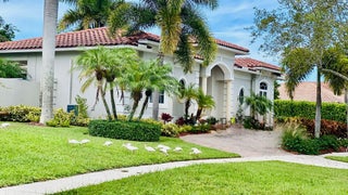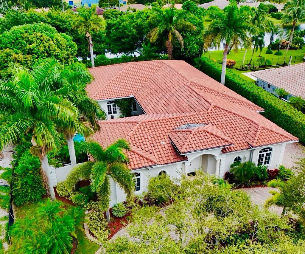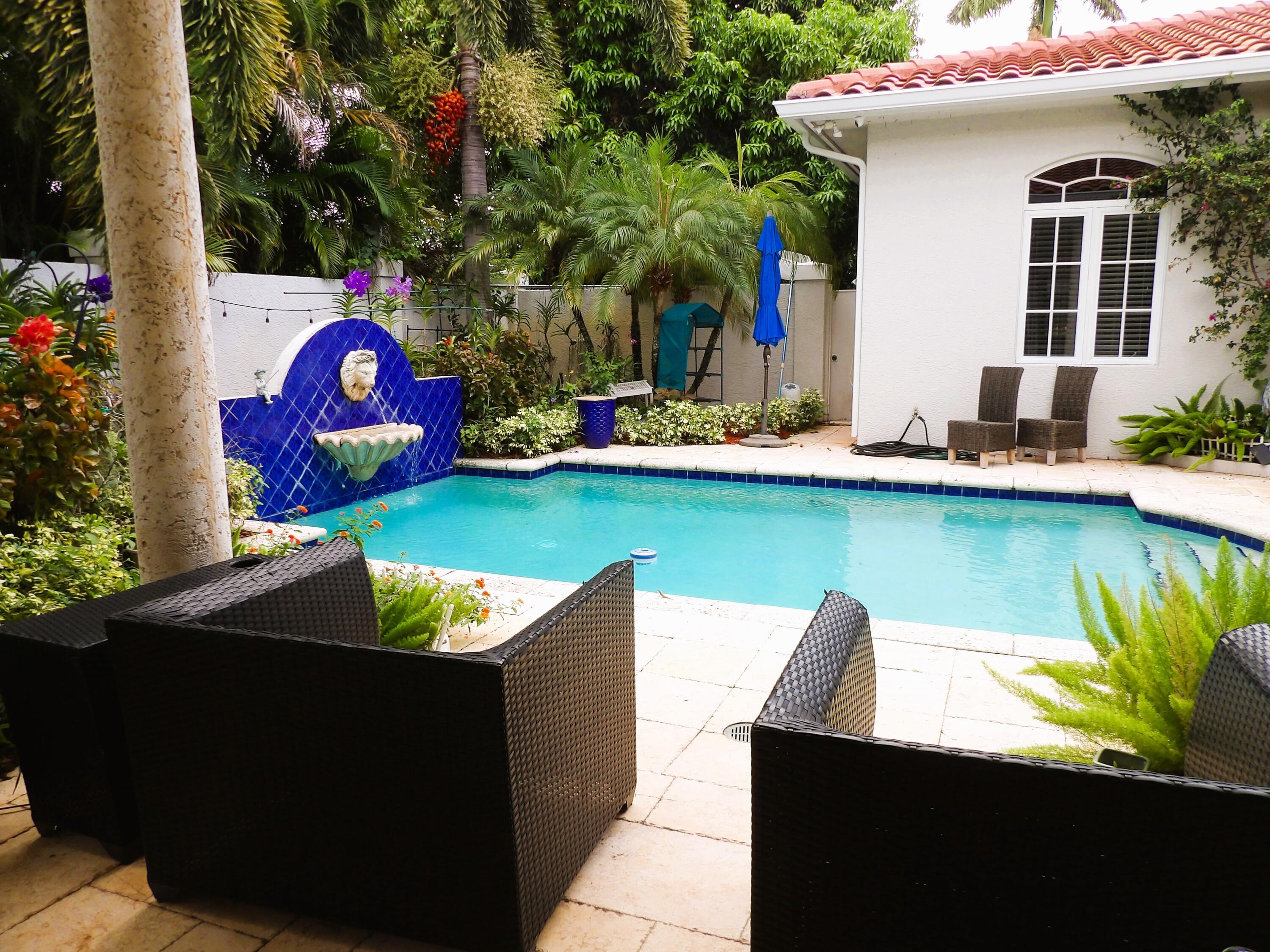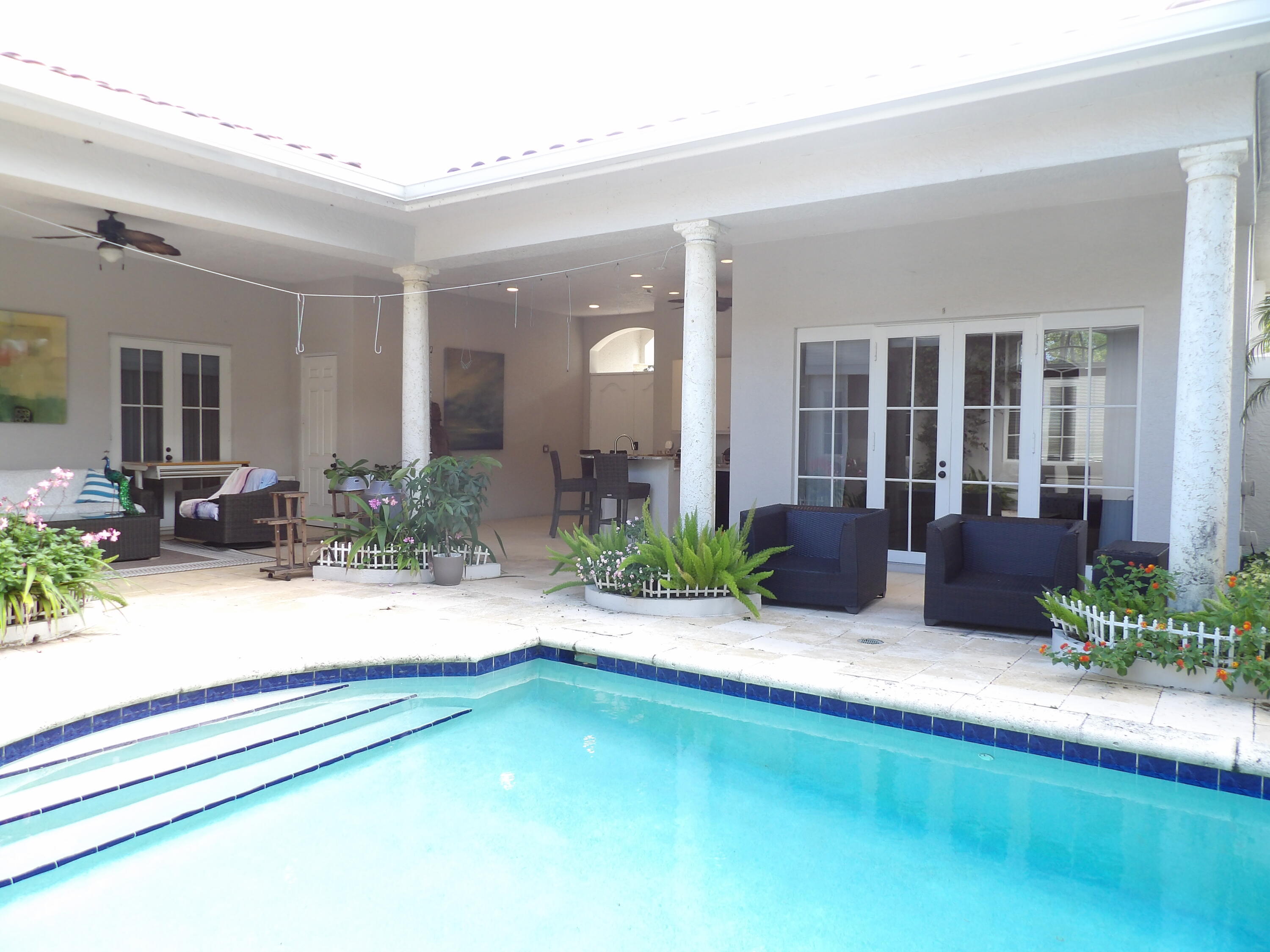 Elegant custom estate in prestigious Presidential Estates, built in 2008 with hurricane-safe construction rated to 240 mph. This home offers 4 spacious bedrooms, an office, and 3.5 baths. The classically center courtyard true private retreat features a private guest quarters, pool, fountain, and summer kitchen--perfect for entertaining or relaxing. Inside, a brand-new quartzite gourmet kitchen pairs with solid wood cabinetry, seemles tile flooring. Elegant details include Egypcian marble thougout, Swarovski crystal chandeliers, and gold accents for timeless sophistication. Set on a 110x137 lot plus a 1/4-acre canal easement with direct access to Lake Mangonia, two kayaks included. Just minutes to downtown, beaches, airport, and premier shopping. This home offers both luxury and convenience.