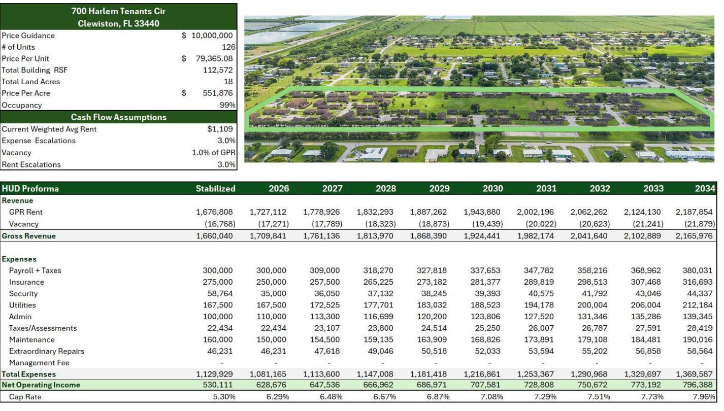 Harlem Garden Apartments is a 126-unit, fully HAP-assisted property sitting on 18 acres in Clewiston with no property taxes. Occupancy is 97%+, rents are backed by HUD, and the asset is fully staffed and in compliance.2024 was distorted by one-time costs (insurance spike, HUD repayment, extraordinary repairs). When we normalize, NOI comes in around ~$525k. With the next HUD rent adjustment and expense optimizations, we project $650k NOI in 2026, which supports our $10MM asking price at a 6.5% cap.