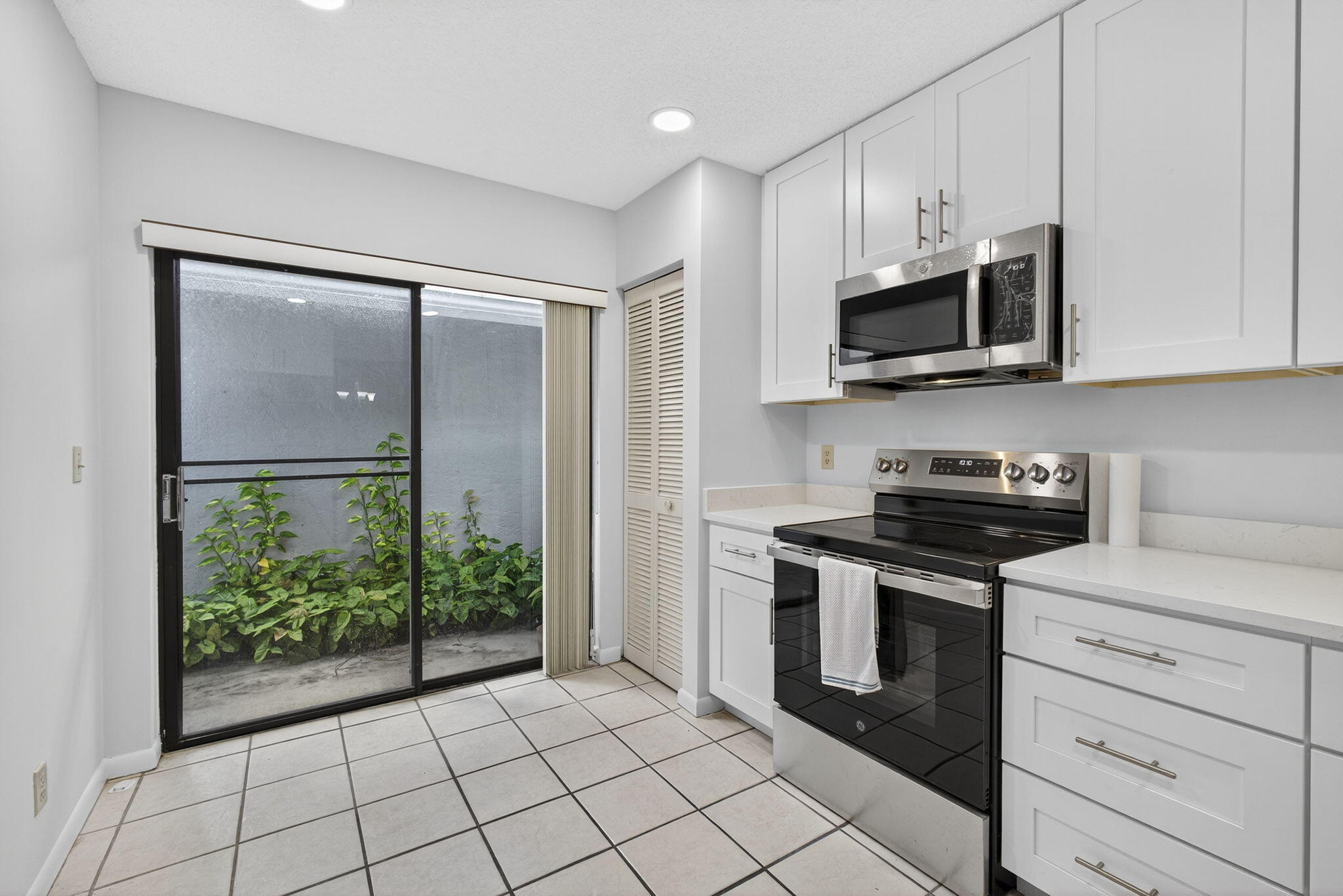 Welcome to The Arbours, a desirable 55+ community offering a relaxing lifestyle with amenities that include clubhouse, pool, and tennis courts. This beautifully updated 3-bedroom, 2-bathroom split floor plan villa features a 1-car detached garage with additional parking right outside your door. The remodeled kitchen boasts stainless steel appliances, Quartz countertops, and white shaker cabinets, creating a bright and modern space. The home is completely tiled throughout and includes a remodeled guest bathroom, impact windows (2021), and walk-in closets in every bedroom. The spacious Florida Room is perfect for entertaining and conveniently includes the laundry room with a full-size washer and dryer. Recent upgrades, new roof 2022, A/C 2022, water heater 2024