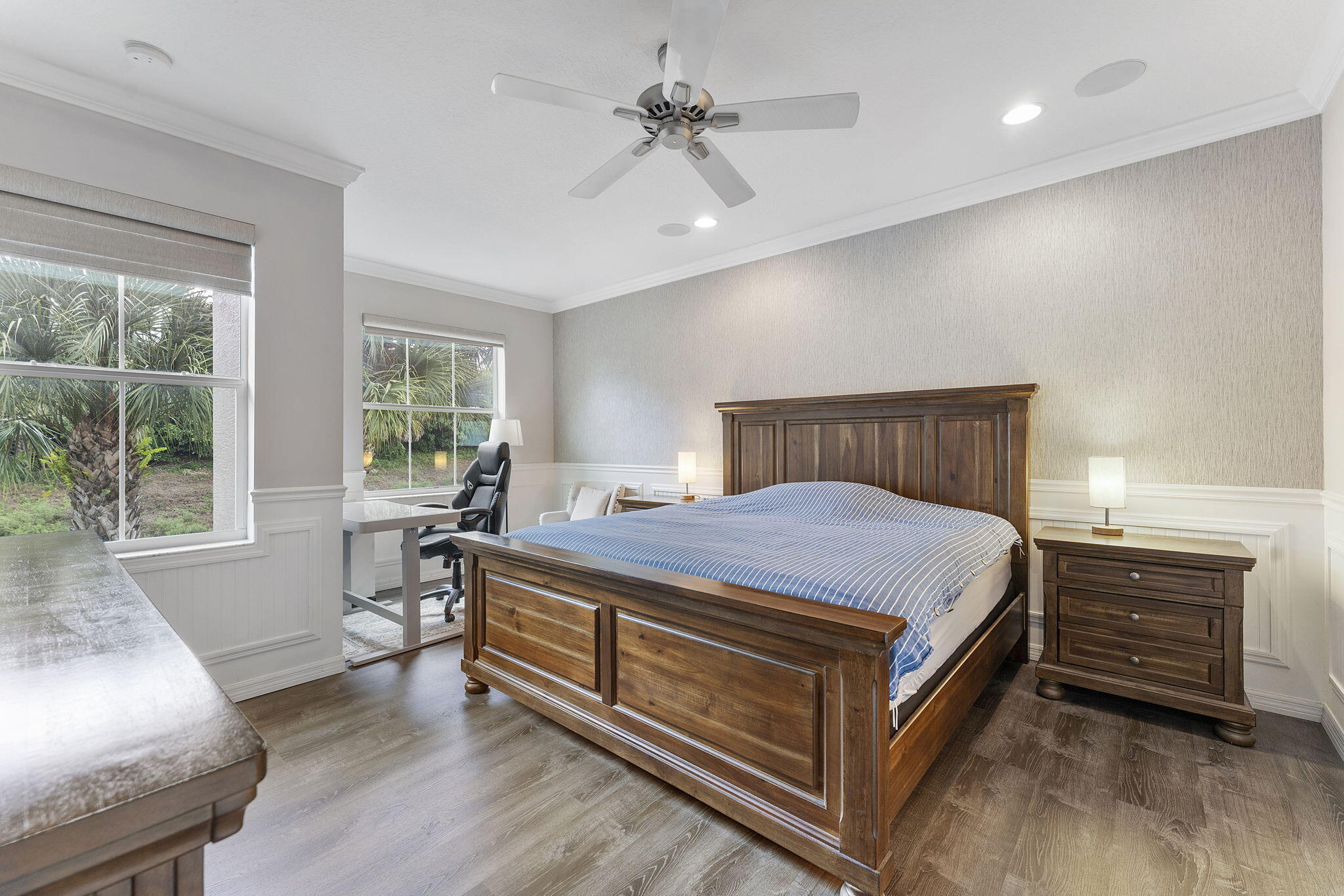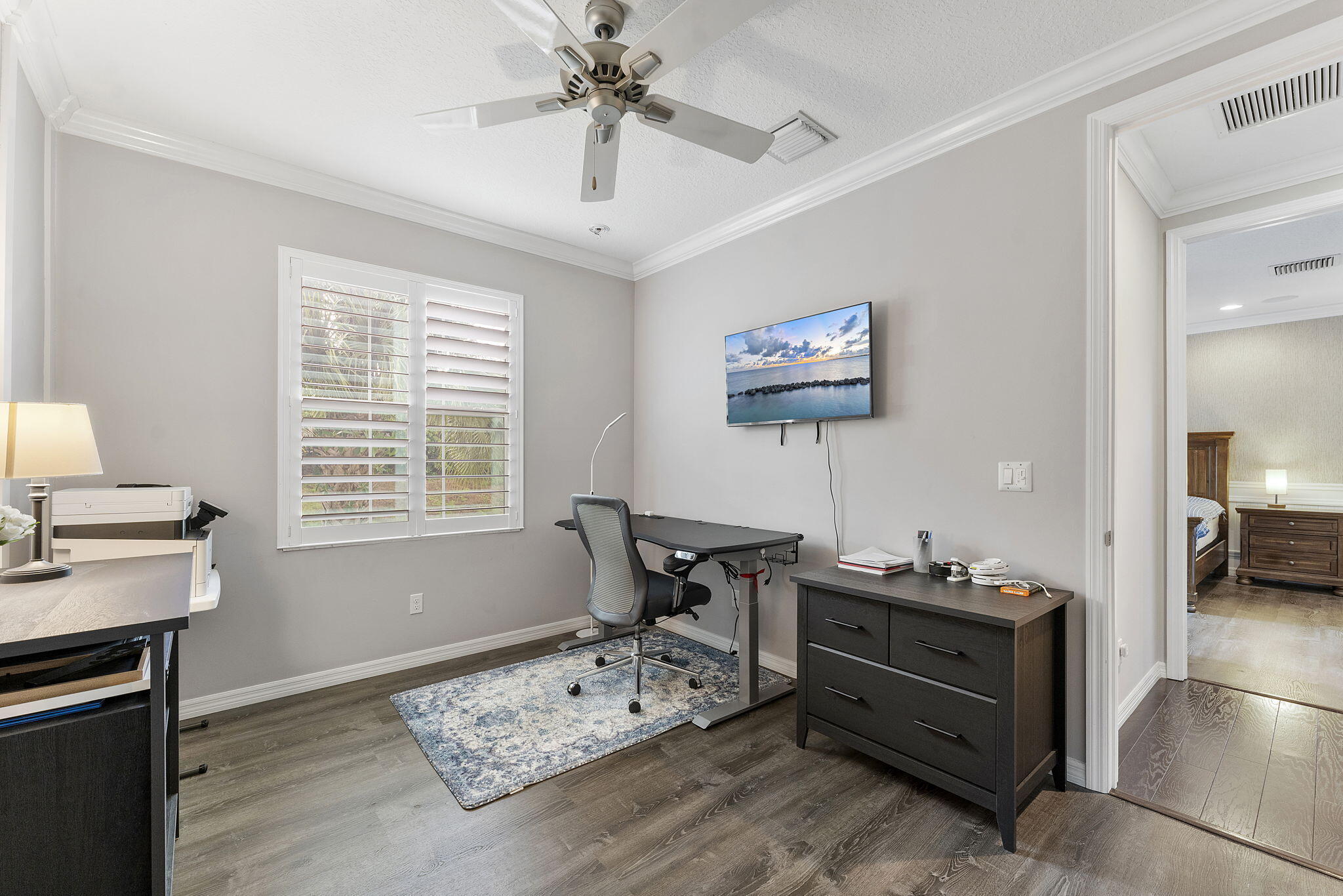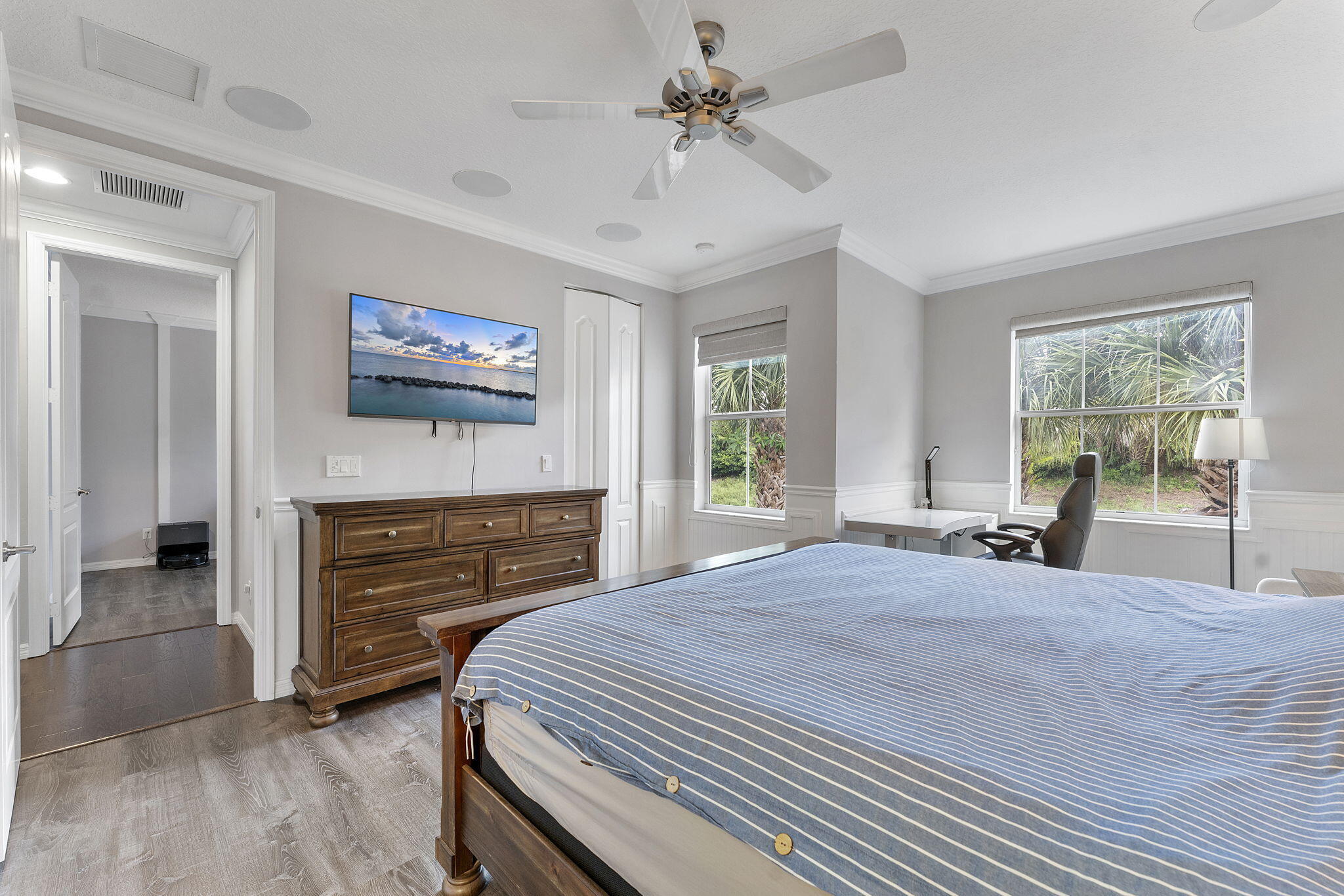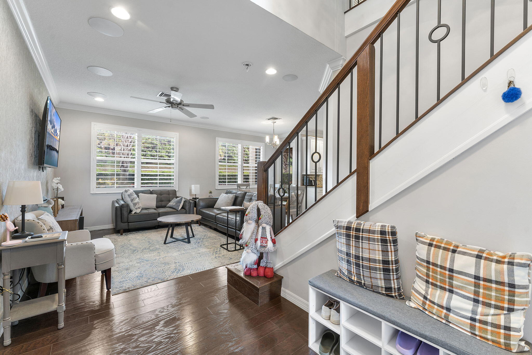 Welcome to this beautiful, furnished, and well-maintained townhome in the heart of Palm Beach Gardens! This elegant residence features custom hardwood floors throughout, enhancing its warm and inviting atmosphere. The spacious chef's kitchen is a highlight, complete with an island, stainless steel appliances, and soft-close wood cabinetry, perfect for culinary enthusiasts. As you enter, you'll admire the exquisite custom wainscoting and crown molding across the entryway and all bedrooms, adding a touch of sophistication to every corner.Feel safe and secure with complete impact windows, and indulge in the luxurious master bath, which is equipped with edge-less glass shower doors.Additional features include plantation shutters and window shades for added privacy.This townhome is perfectly situated near fine dining, Gardens Town Center, Gardens Mall, and all the amenities Palm Beach Gardens has to offer. Don't miss this opportunity to live in a wonderful community!