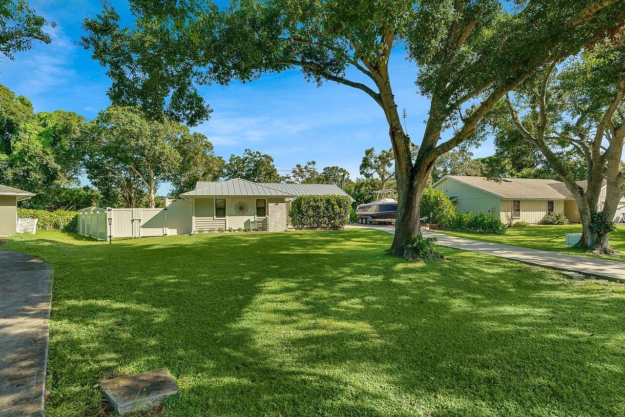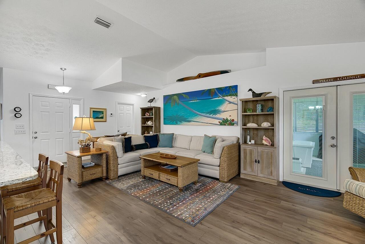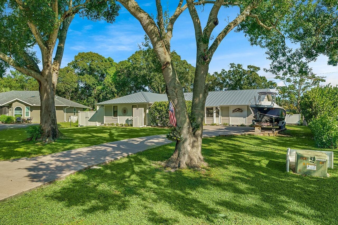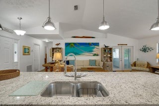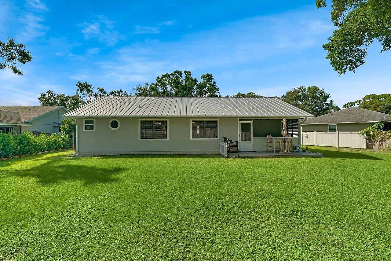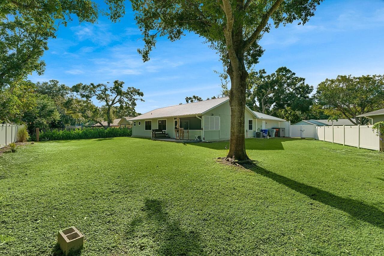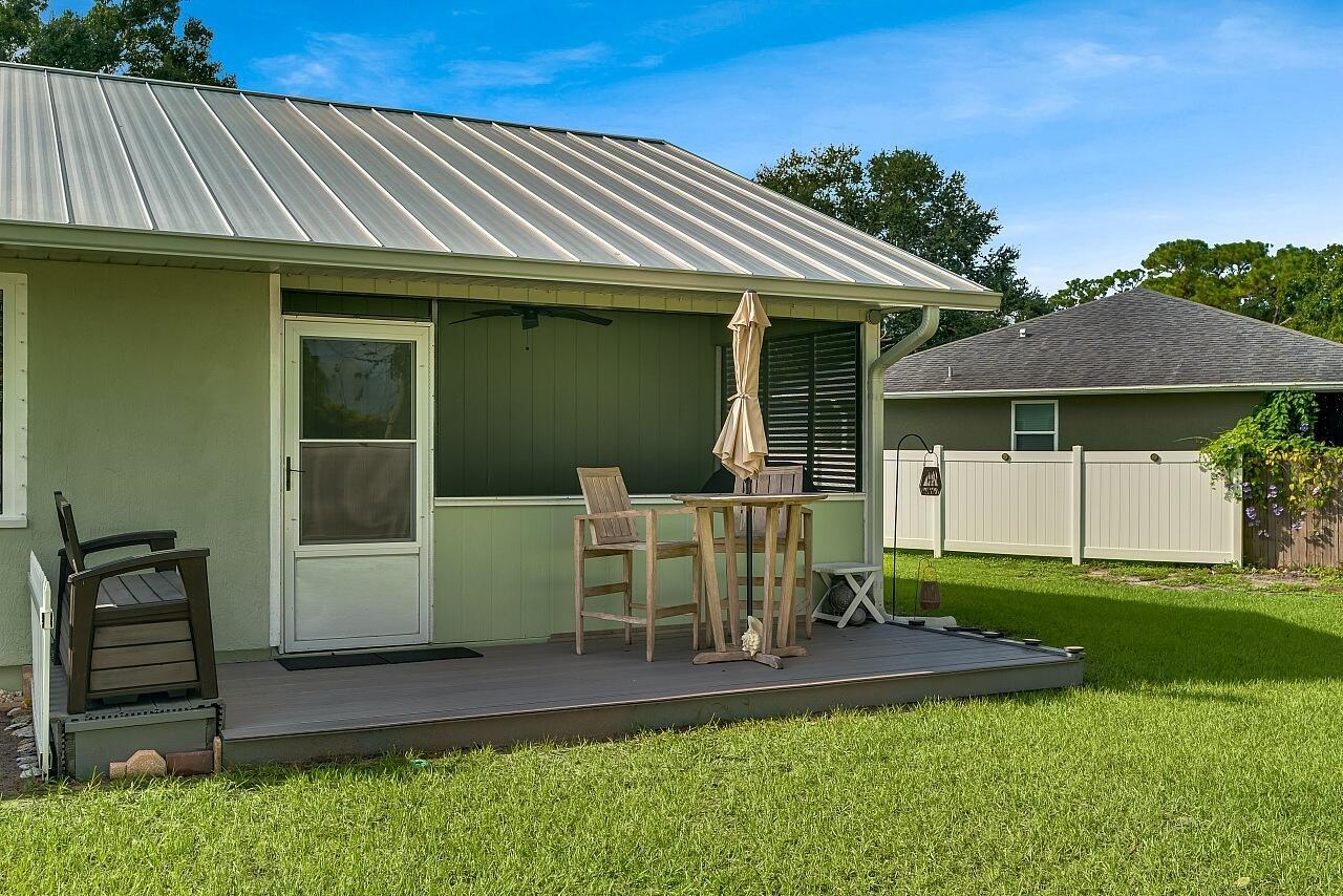 Experience Florida living at its finest in this 3-bed, 2-bath coastal dream home. Upgraded from top to bottom with a desirable split floor plan & vaulted ceilings. Open layout creates a bright, airy feel. The modern kitchen has crisp white cabinetry, granite counters, bar seating with massive island & stainless steel appliances. French doors open to a screened patio, perfect for relaxing or entertaining in the backyard. The primary suite features dual vanities, vaulted ceiling, a huge tiled full glass shower & built in closet shelving. 2020 standing seam metal roof, 2020 water heater & 2013 AC