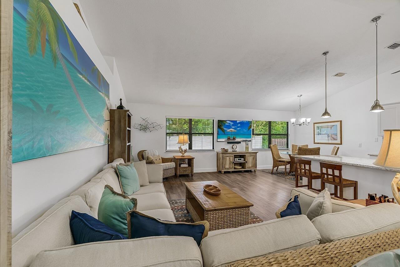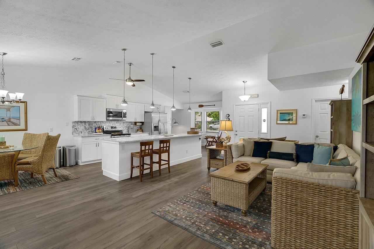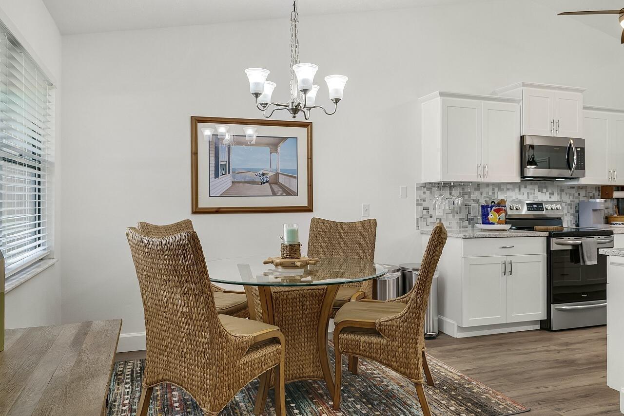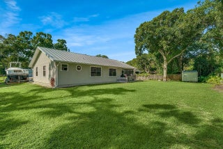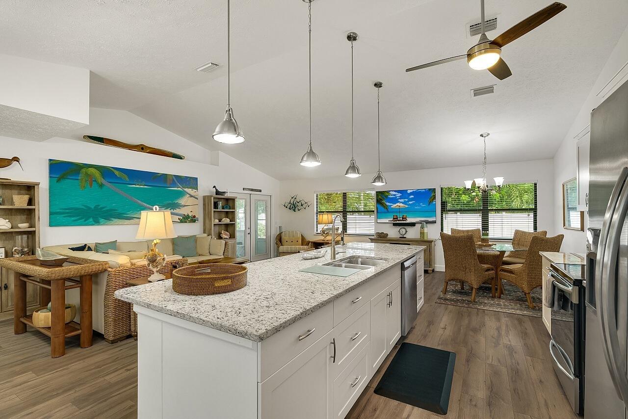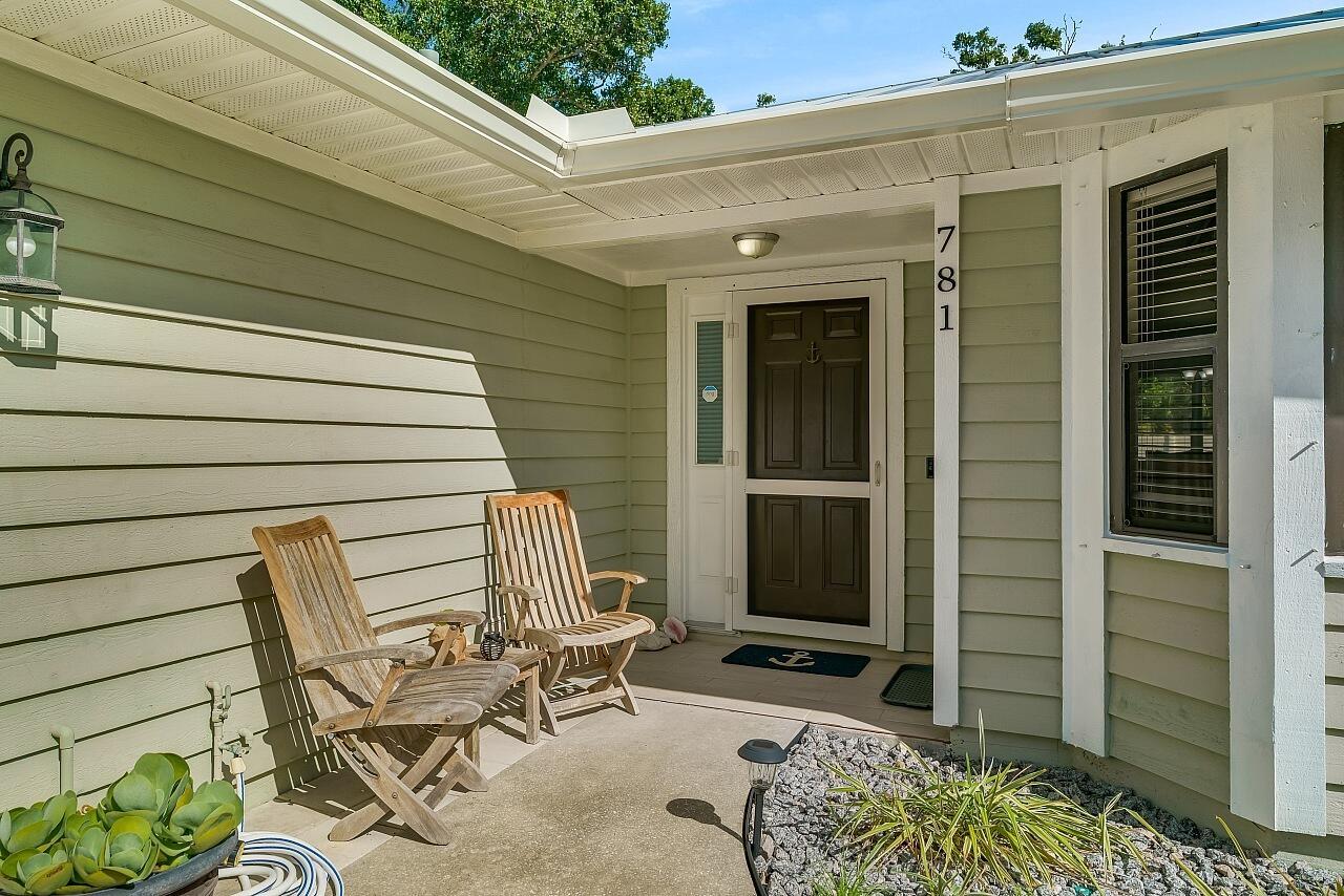 Experience Florida living at its finest in this 3-bed, 2-bath coastal dream home. Upgraded from top to bottom with a desirable split floor plan & vaulted ceilings. Open layout creates a bright, airy feel. The modern kitchen has crisp white cabinetry, granite counters, bar seating with massive island & stainless steel appliances. French doors open to a screened patio, perfect for relaxing or entertaining in the backyard. The primary suite features dual vanities, vaulted ceiling, a huge tiled full glass shower & built in closet shelving. 2020 standing seam metal roof, 2020 water heater & 2013 AC