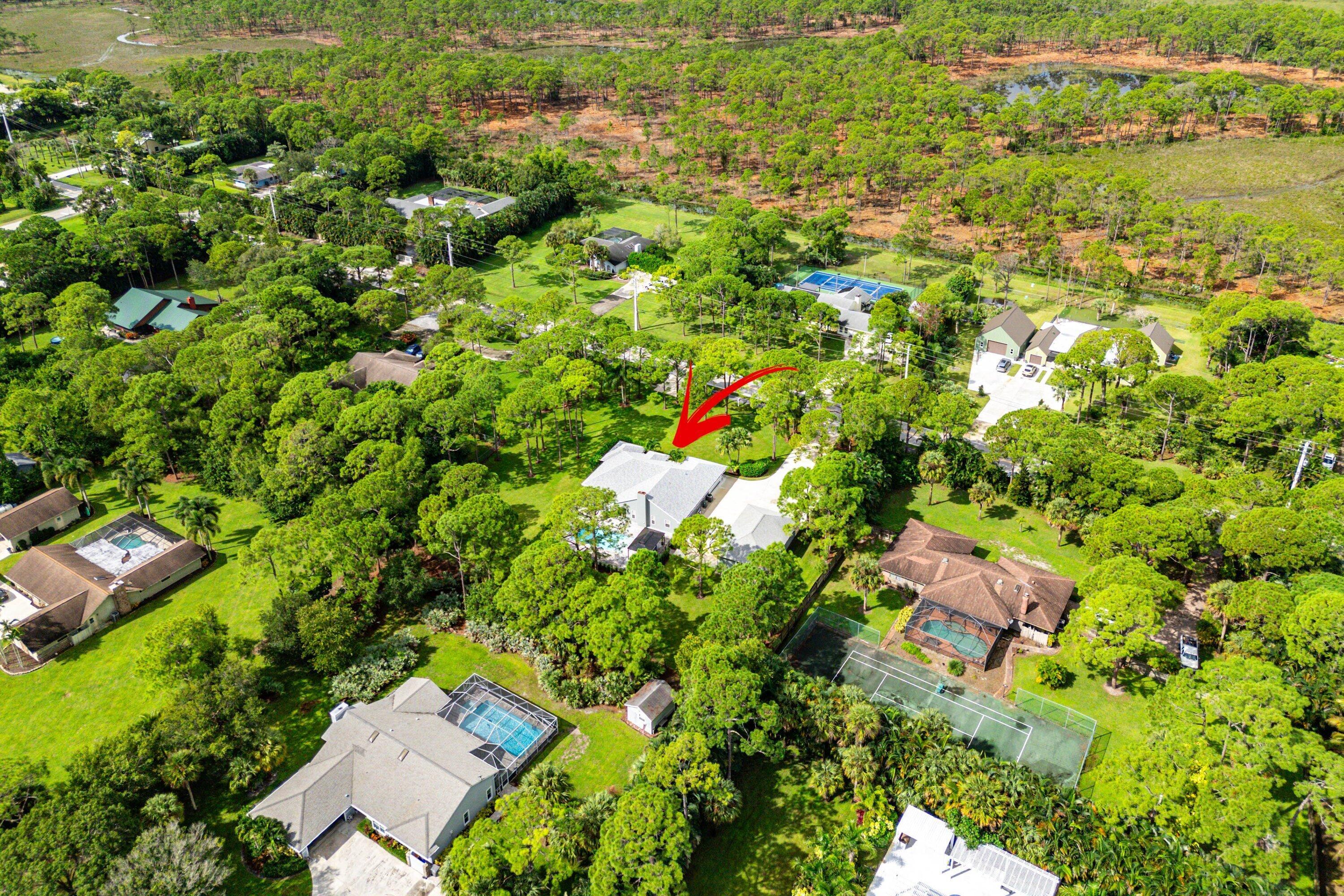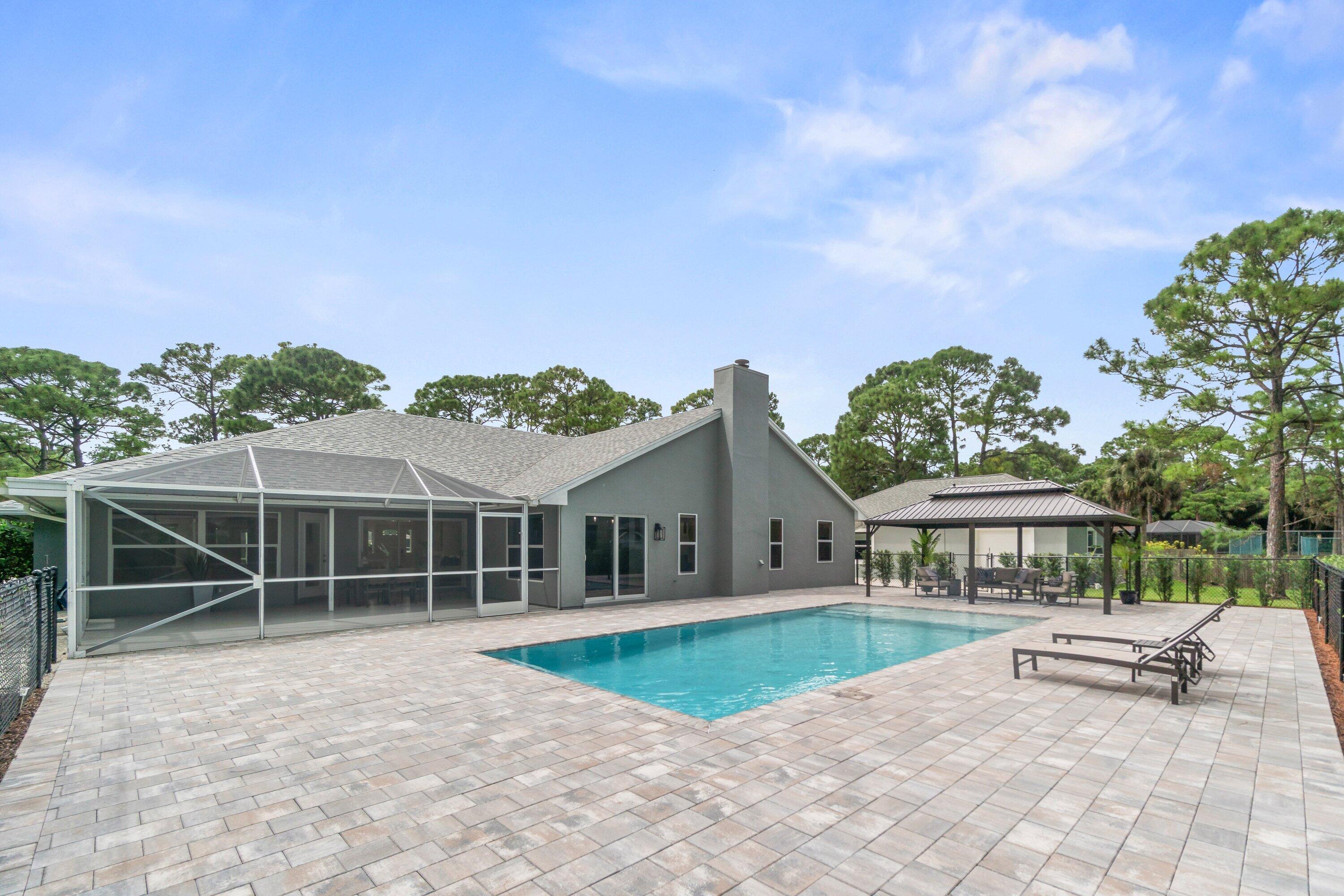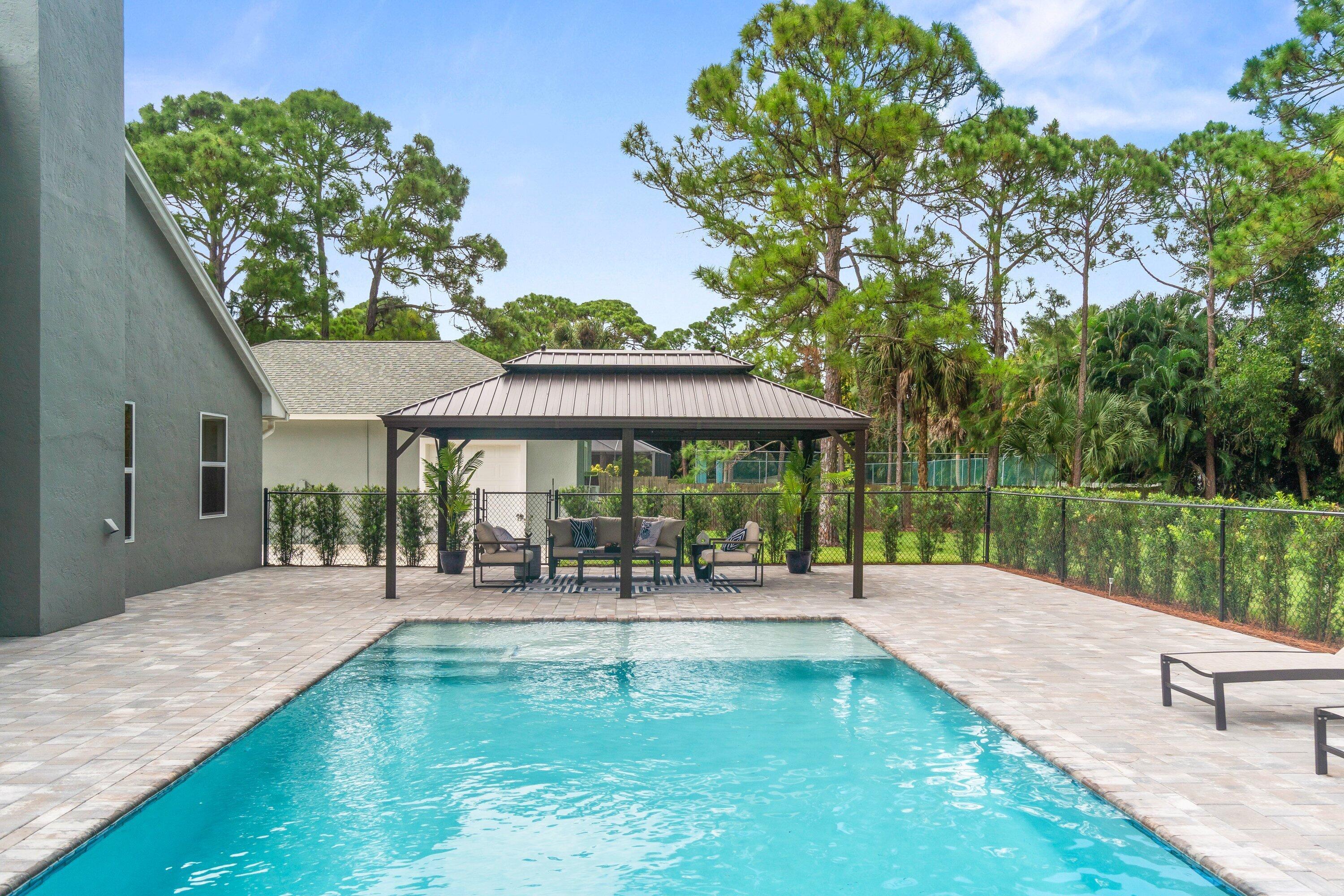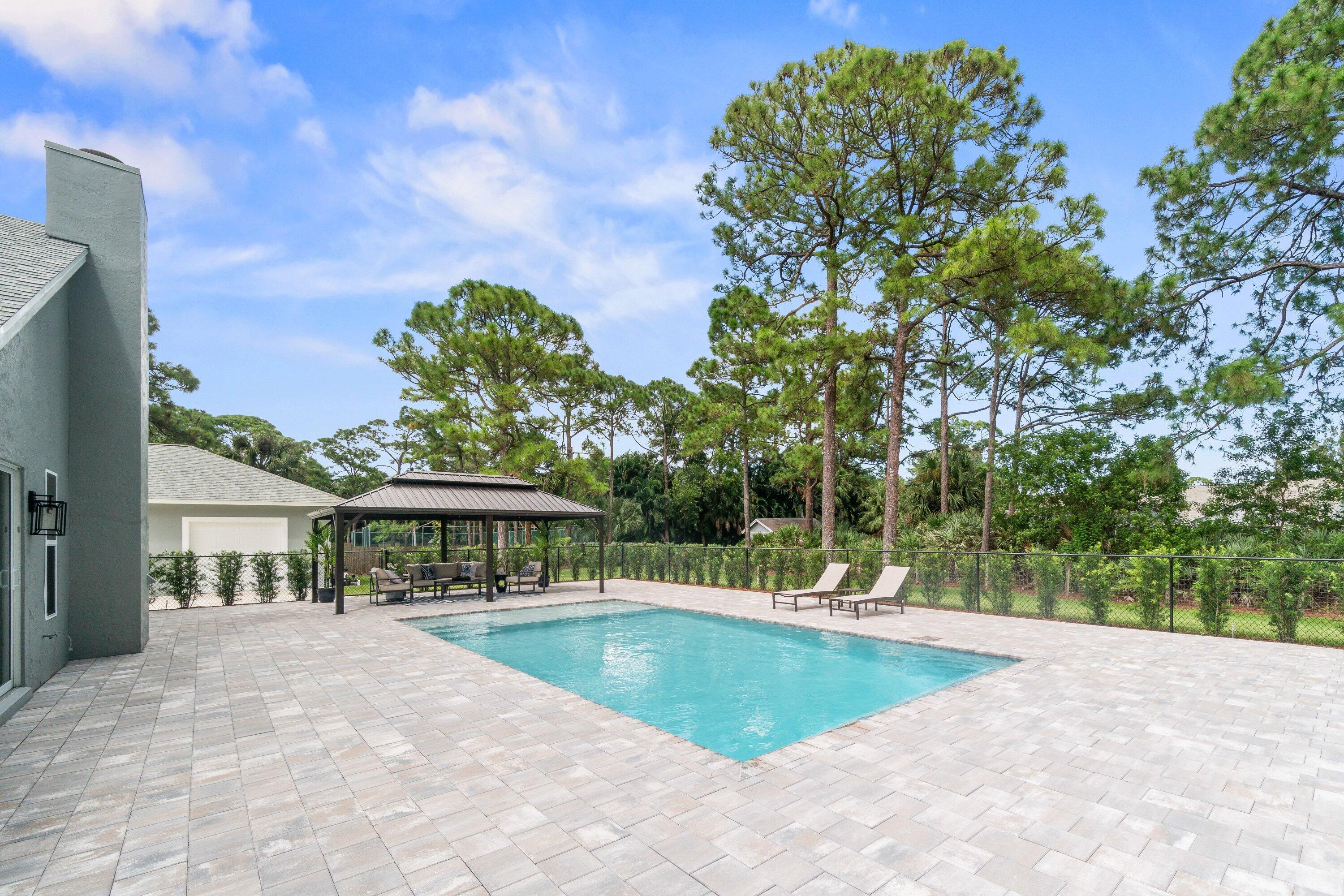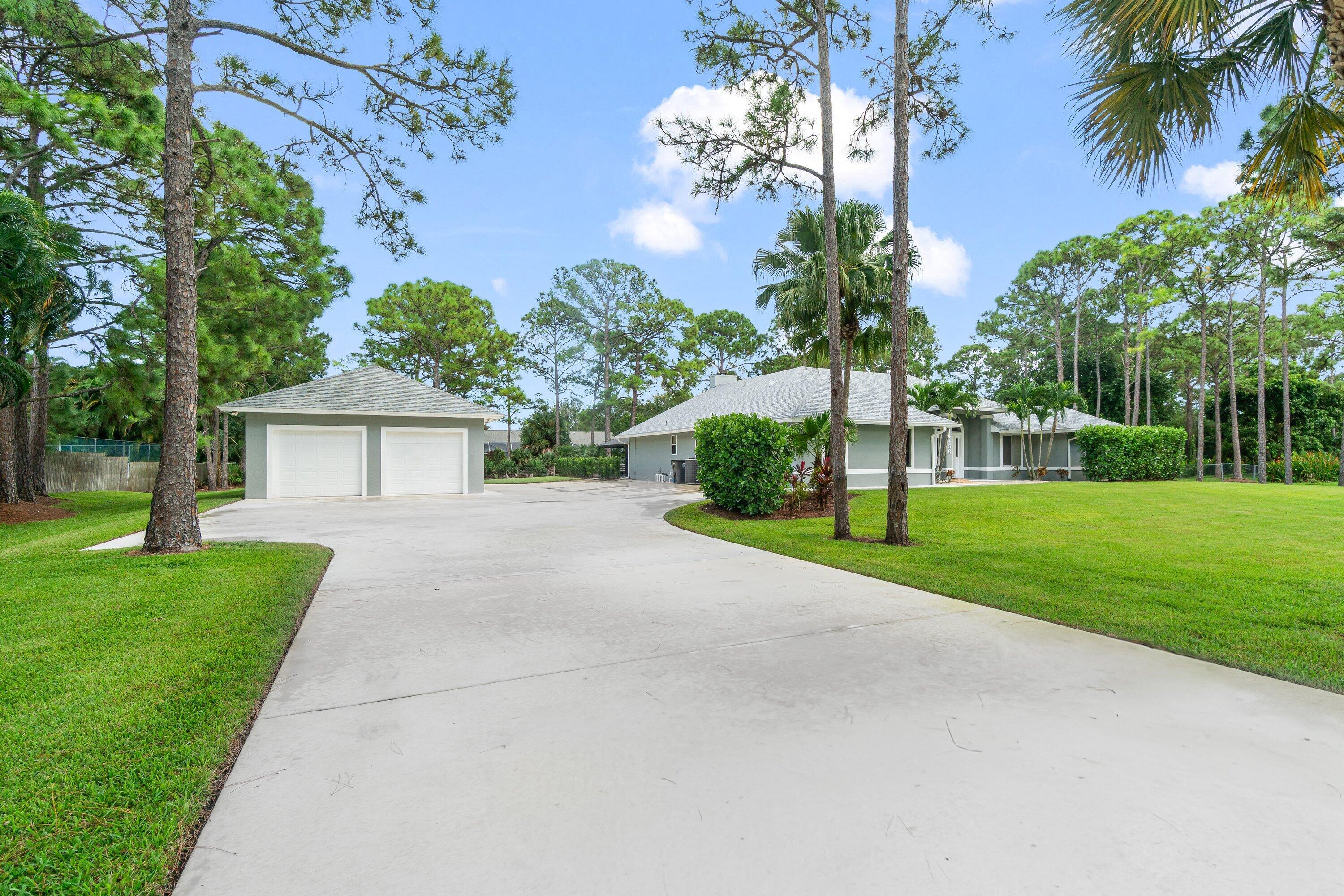 Palm Beach Country Estates Where Elegance Meets Coastal Living Positioned on a paved road in one of Northern Palm Beach County's coveted communities on a 1 acer lot , this completely remodeled estate blends refined design with flexible living. A sweeping 5,800-sq-ft driveway leads to both the main residence and a huge 1075sq ft CBS-built detached building--engineered to hold at least six cars. Perfect as a collector's garage, workshop, or future guest house, this space offers unmatched versatility. Inside, the residence shines with sunlit, open interiors. A formal living room welcomes guests, while the gourmet kitchen--quartz countertops, porcelain farmhouse sink, wood-accent island, and custom cabinetry--anchors the home. Just beyond, the family room with fireplace and the formal diningarea overlook the new resort-style saltwater pool. The master suite is a private retreat with custom blinds, dual quartz vanities, an oversized shower, and jacuzzi tub. Seamless indoor-outdoor living is at the forefront, with a covered, screened patio finished in faux-wood tile and a backyard oasis featuring pool, gazebo, and ample entertaining space. Additional highlights: new roof (2019), partial impact windows, new saltwater pool (2025), extended driveway (2023), and CBS outbuilding for cars, storage, or customization. All of this just minute from fine dining, shopping, golf, and Palm Beach Estate is just 6 miles away from Palm Beach's world-class beaches.