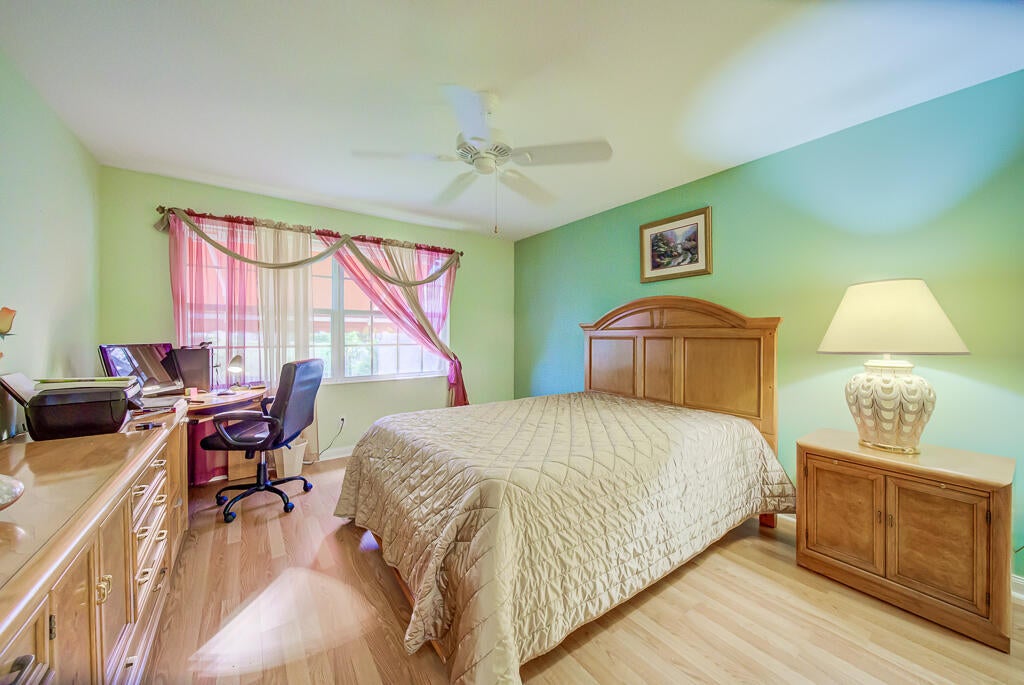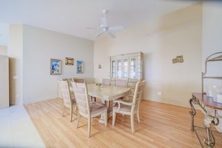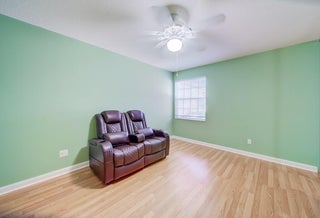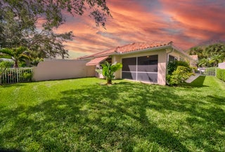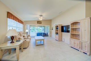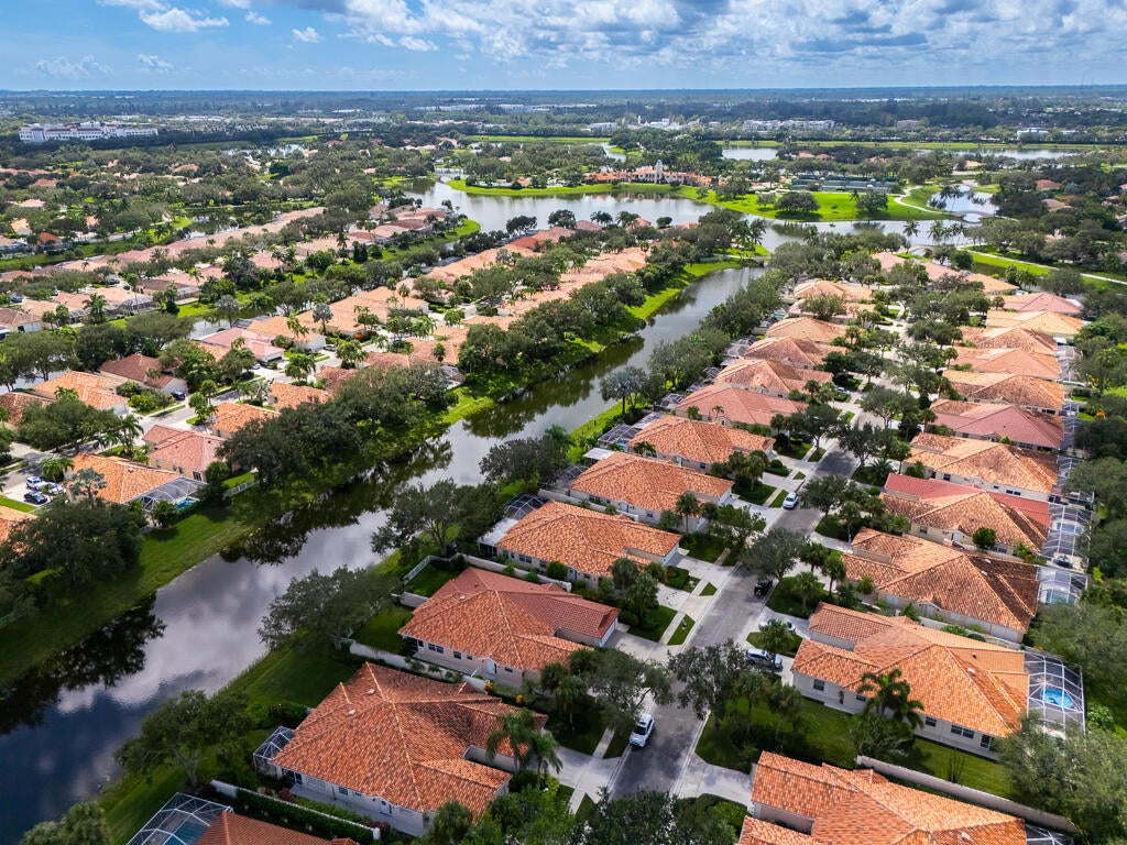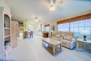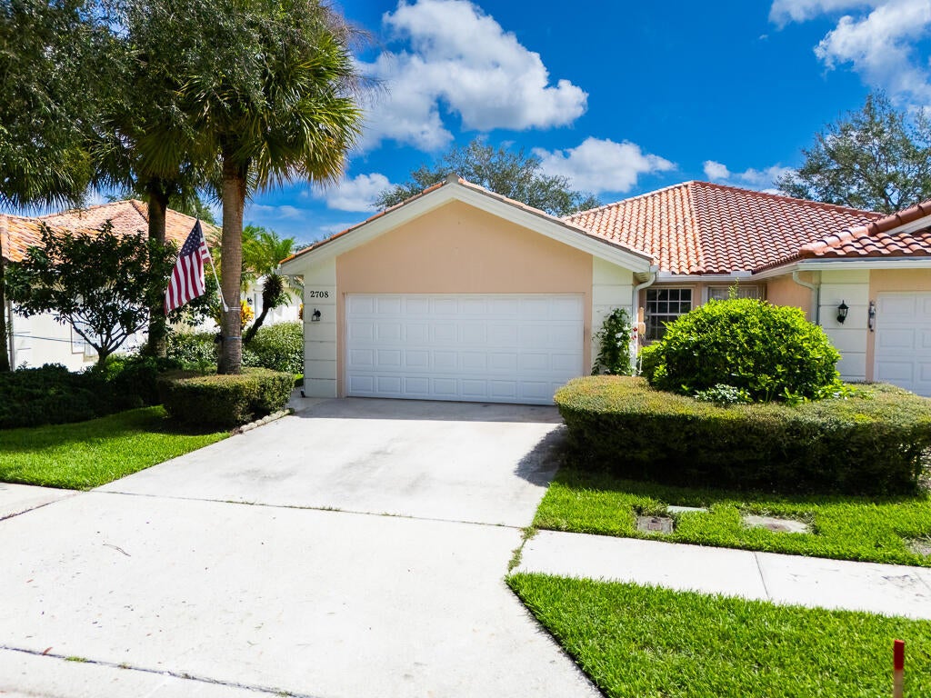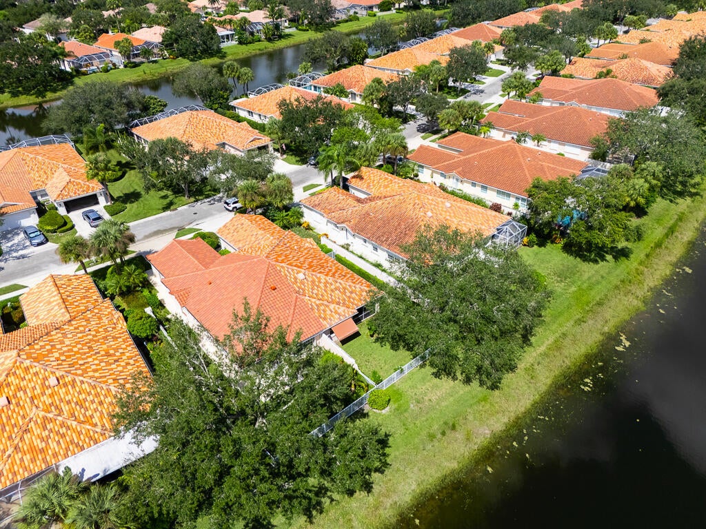 Welcome to this charming lakeview villa, offering 2 bedrooms, 2 bathrooms, and a 2-car garage. RiverWalk offers luxury, resort-style living with ought membership fees! This one-story home features an open layout with elevated ceilings, neutral colors, tile floors in common areas, recessed lighting, and ceiling fans. The modern kitchen boasts white cabinetry and granite countertops, perfect for culinary pursuits. An inside laundry room adds convenience, complete with a sink and washer/dryer. The spacious master bedroom includes laminate floors, a walk-in closet with custom built-ins, a second closet, and an ensuite bathroom featuring a double vanity sink, shower with glass doors, and a linen closet.Step outside to your fenced-in yard, featuring a covered and screened patio with a hot tub and complete hurricane panels. Therr is also a remote controlled electric awning off of the masterbedroom window for added shade in the patio. Enjoy the vibrant community amenities, including three lakeside pools, a sports center, playground, bocce ball, tennis, pickleball, walking trails, a clubhouse, fitness center, meeting rooms, activity rooms, billiards, ping pong, a library and more. Don't delay and schedule your showing today of your new home!