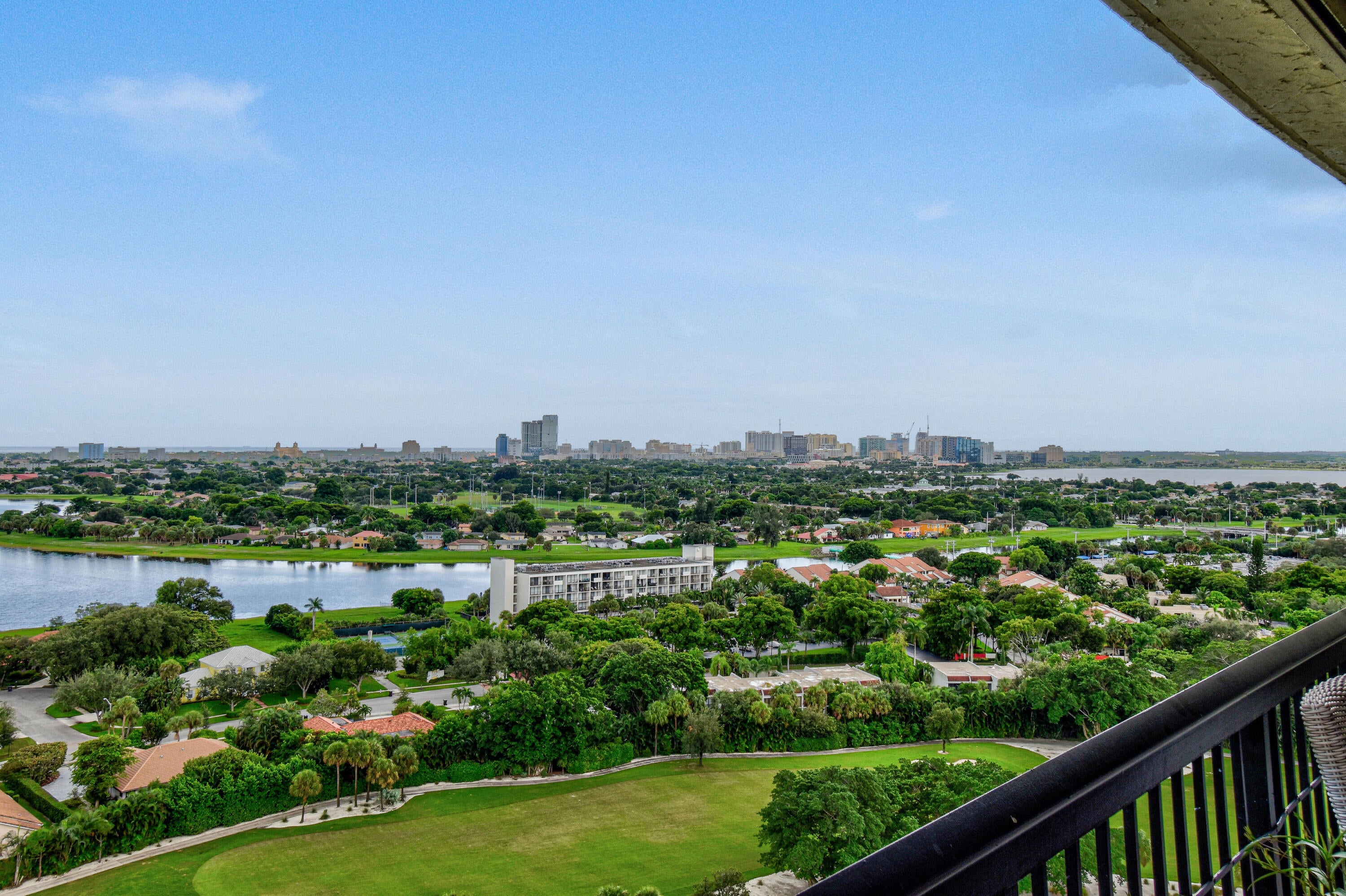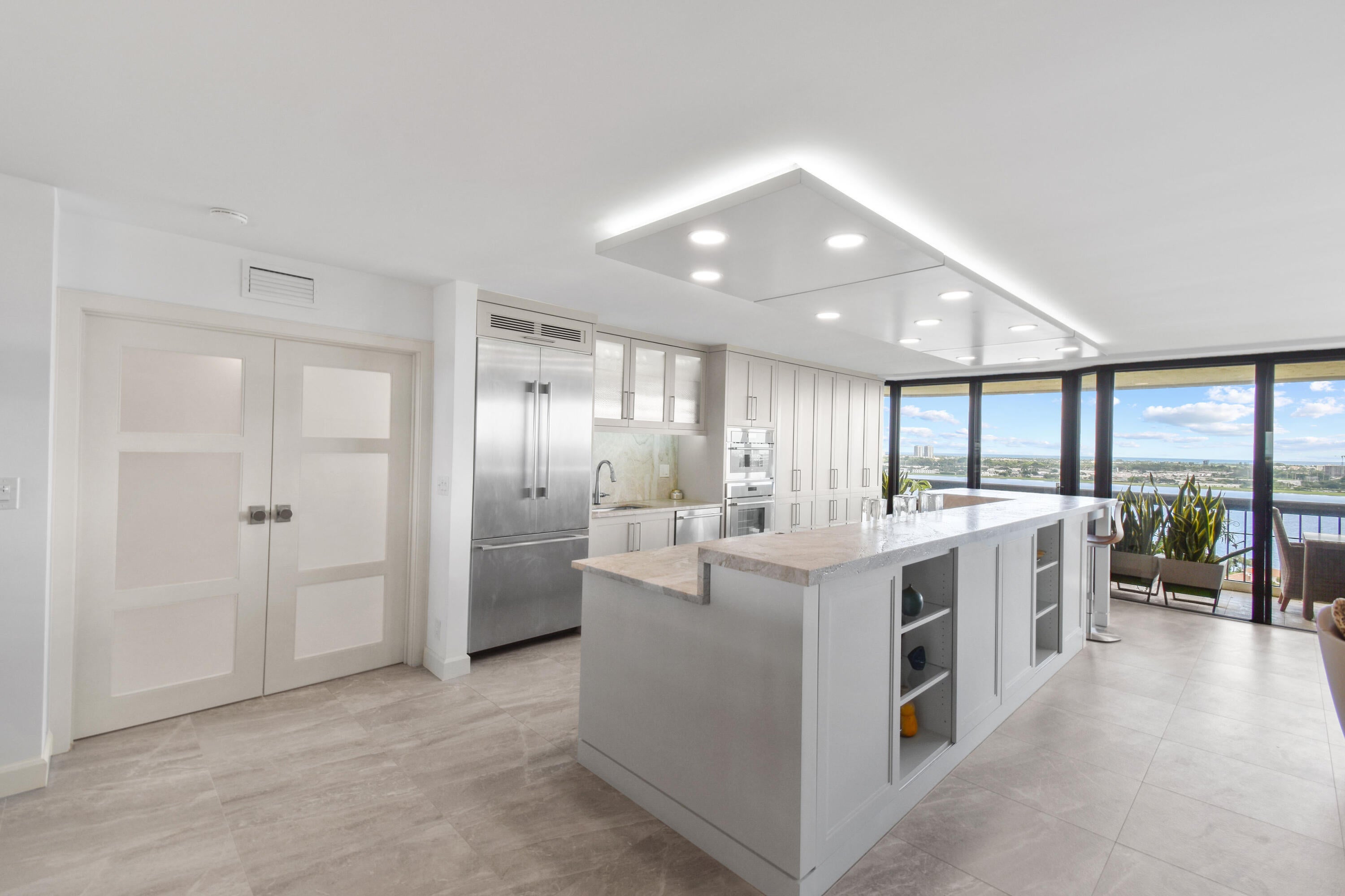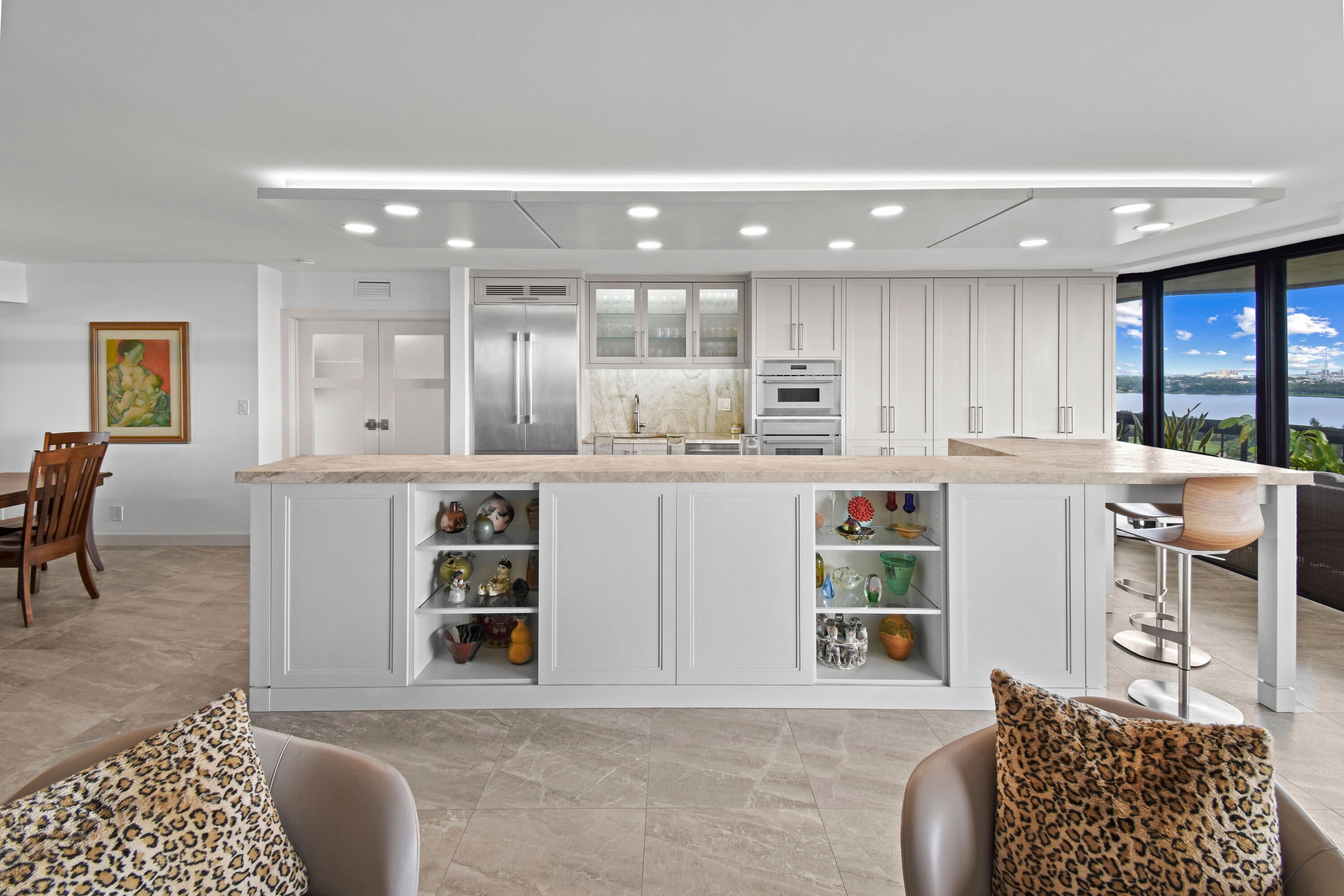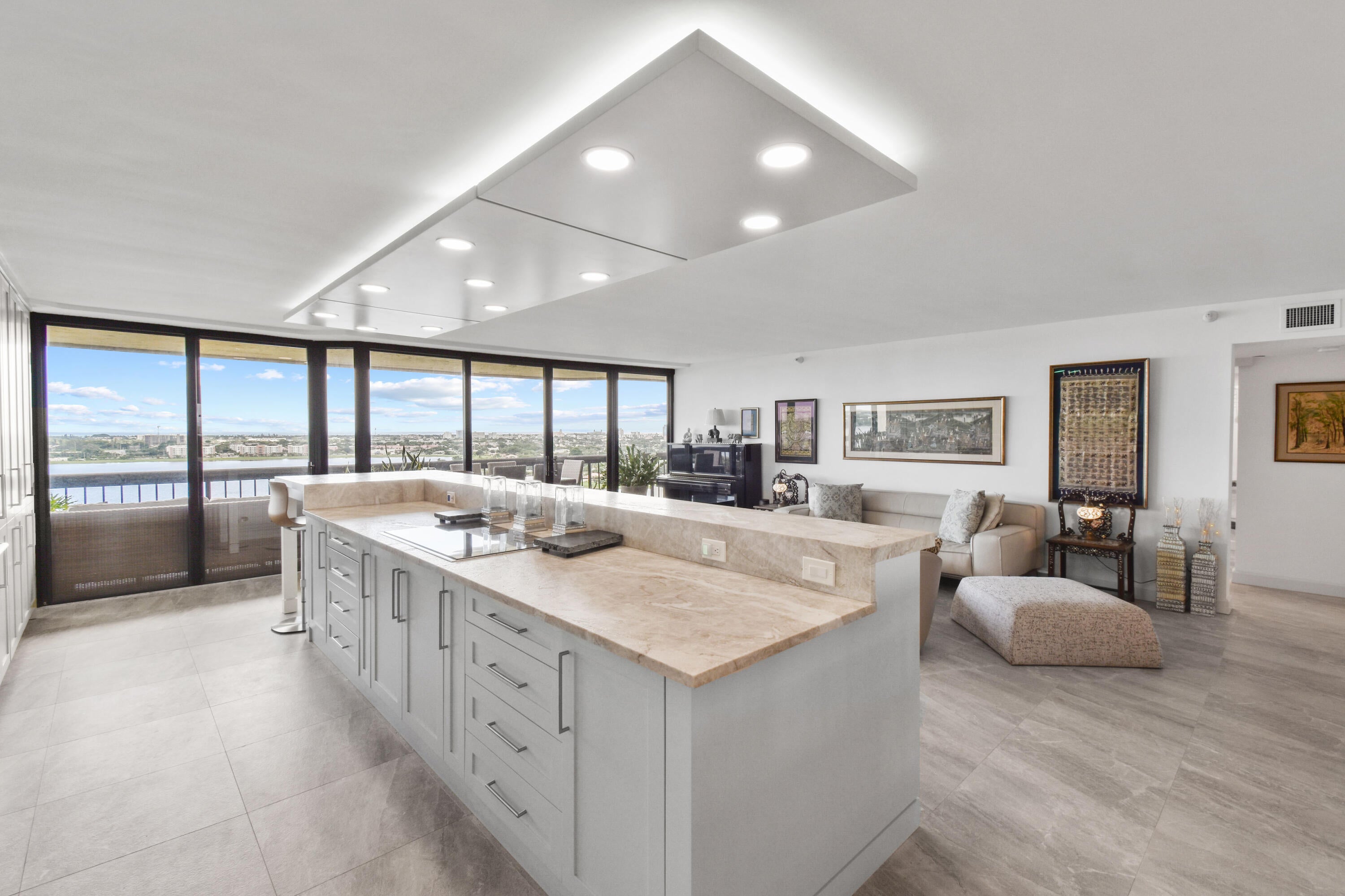 Experience luxury living in this beautifully renovated 2-bedroom, 2-bath condo in the heart of West Palm Beach, just minutes from the island of Palm Beach and downtown West Palm. ''Enjoy east-facing views stretching all the way to the Atlantic Ocean and from West Palm up to The Gardens, spectacular sunrises and sunsets and great views of the President golf course directly below.''The chef's kitchen features leathered Taj Mahal quartzite countertops, a five-burner induction cooktop, Thermador appliances, and sleek stainless steel finishes. Custom closet cabinetry and built-ins elevate every room, including primary bedroom bookshelves milled to perfection. Expansive sliders with phantom screens bring in refreshing breezes while framing the views.Natural light fills the residence, accentuated by custom frosted-glass doors and a glowing rain-glass display cabinet that add both style and openness. The kitchen island doubles as a focal point in the living area, where a discreetly built-in television is revealed only when needed. On either side, backlit shelving creates the perfect stage for books, art, or personal treasures, bringing warmth and character to the space. Set on 7 acres of lush grounds, the building offers resort-style amenities including a tennis court/pickleball court, a private pool, and the security of 24/7 concierge service. This is a rare opportunity to own a turnkey ocean-view retreat blending elegance, comfort, and convenience in one of South Florida's most desirable locations.