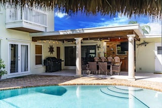 This 4-bedroom, 3-bath pool home is made for Florida living! The open layout highlights the pool and backyard oasis with outdoor kitchen, and new tiki hut. Perfect for entertaining! Inside features tile floors, granite counters, stainless appliances, and a 110-gallon faux fish tank. Upstairs, the master suite offers a walk-in closet, balcony overlooking the pool, steam shower, and jetted tub. Metal roof, impact sliders, and shutters complete the package -- all minutes from the Intracoastal, beaches, and downtown Lake Worth Beach.The furniture is negotiable.