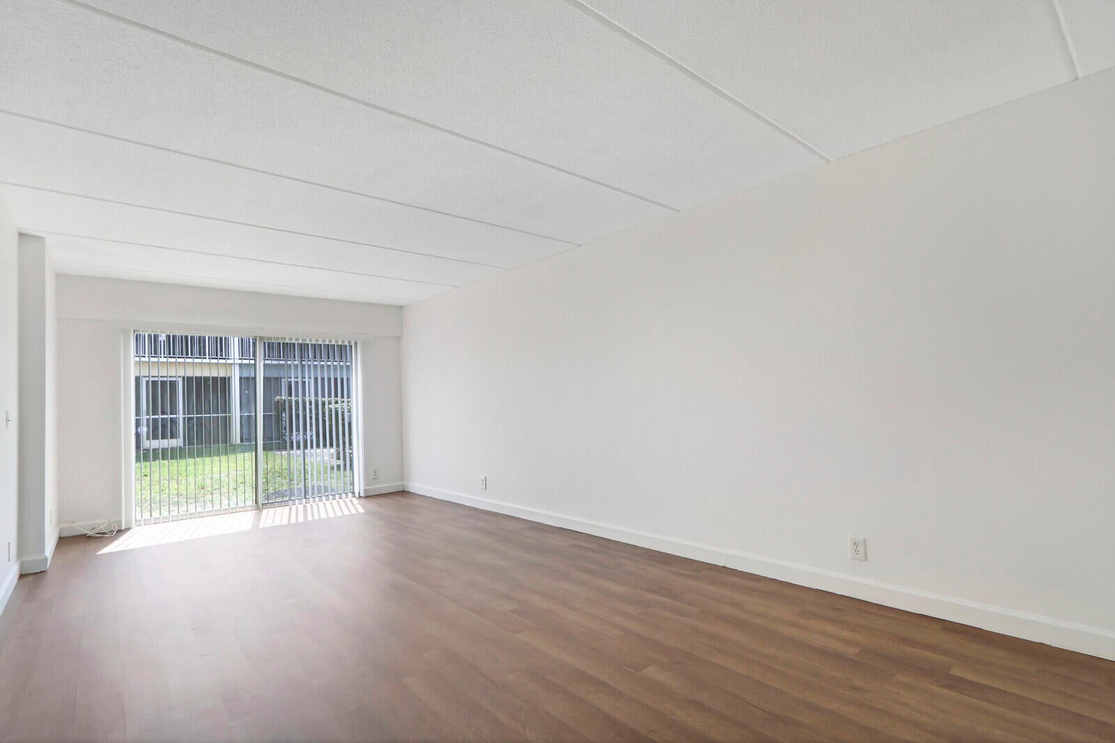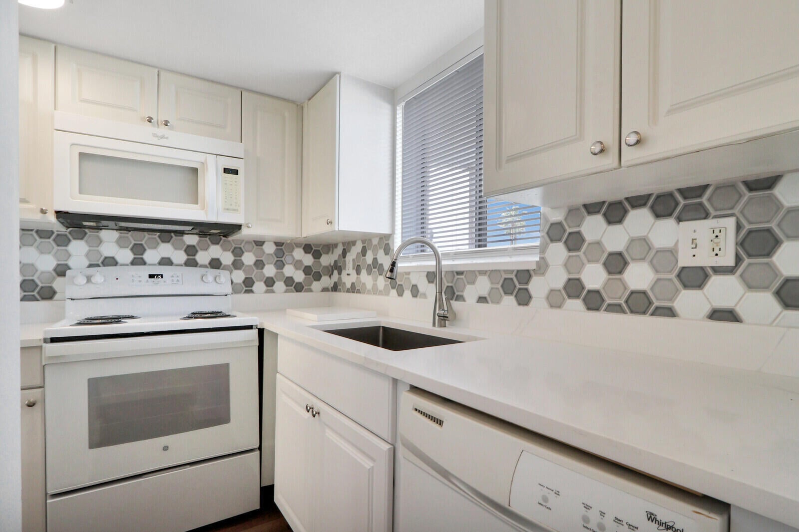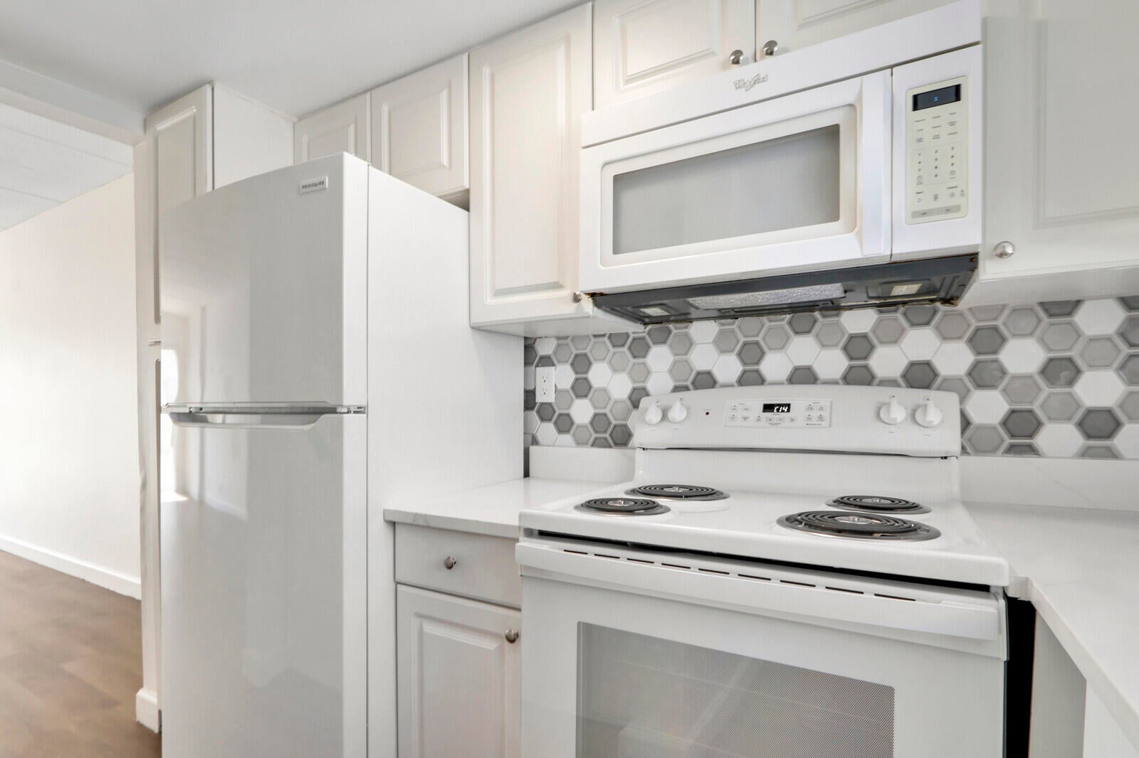 Renovated ground floor 2 br, 1 ba with BRAND NEW hurricane impact glass windows. And a full-size washer & dryer INSIDE the unit. Quartz kitchen countertops, tile backsplash, refrigerator and garbage disposal new in 2024. Stove was replaced in 2022. New luxury vinyl plank flooring throughout in 2024, no carpet. Updated bathroom in 2024. The patio space was enclosed to create an oversized living room. Sliding door to the grass yard. 2 generously sized bedrooms, the primary bedroom with a walk-in closet. 1 assigned parking space in front of the unit and plenty of extra parking available on the street. Community pool. On-site management office. Dogs are welcome, no aggressive breeds. Close to stores & restaurants, some a short walk away. Perfect for both investors and owner-occupants.