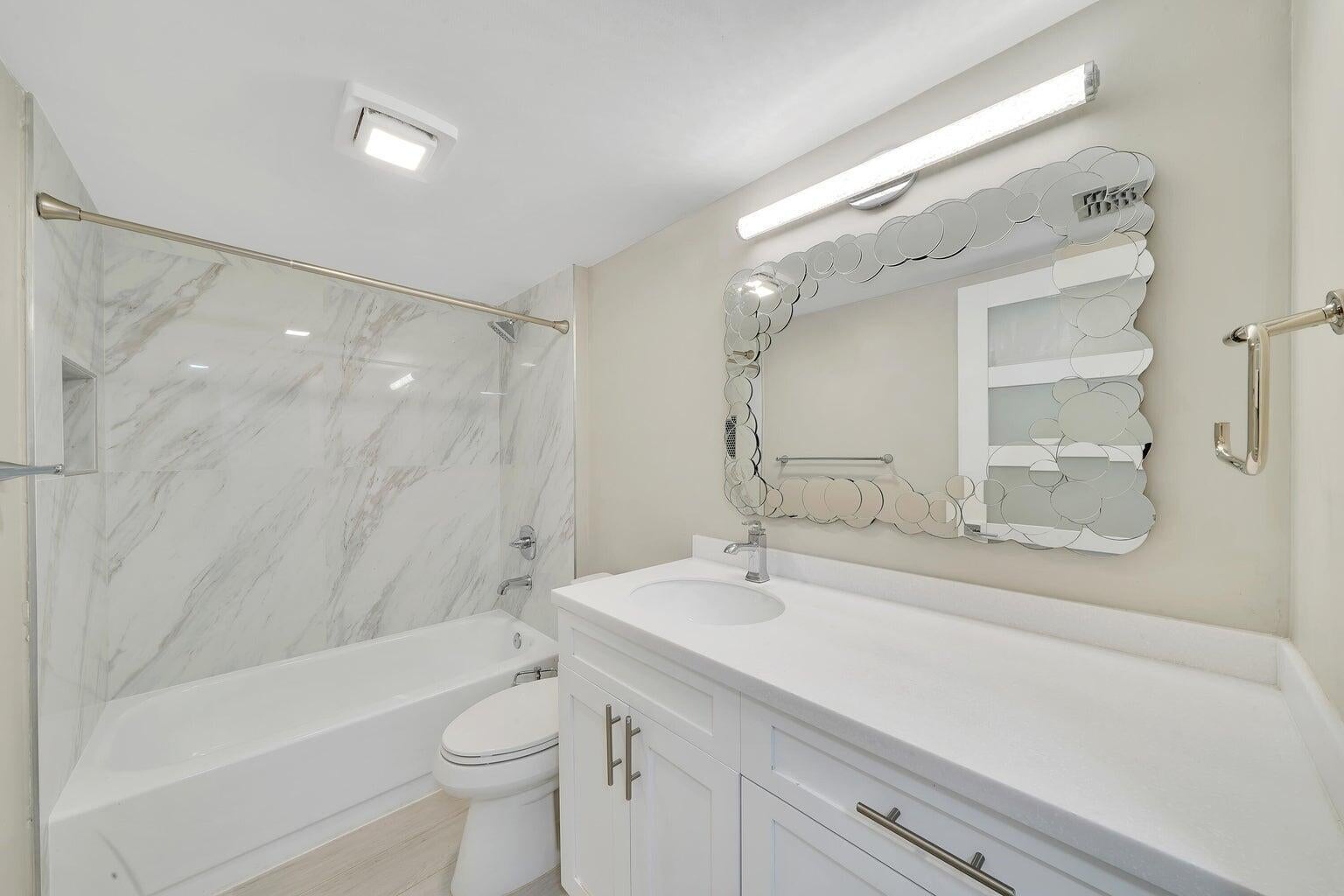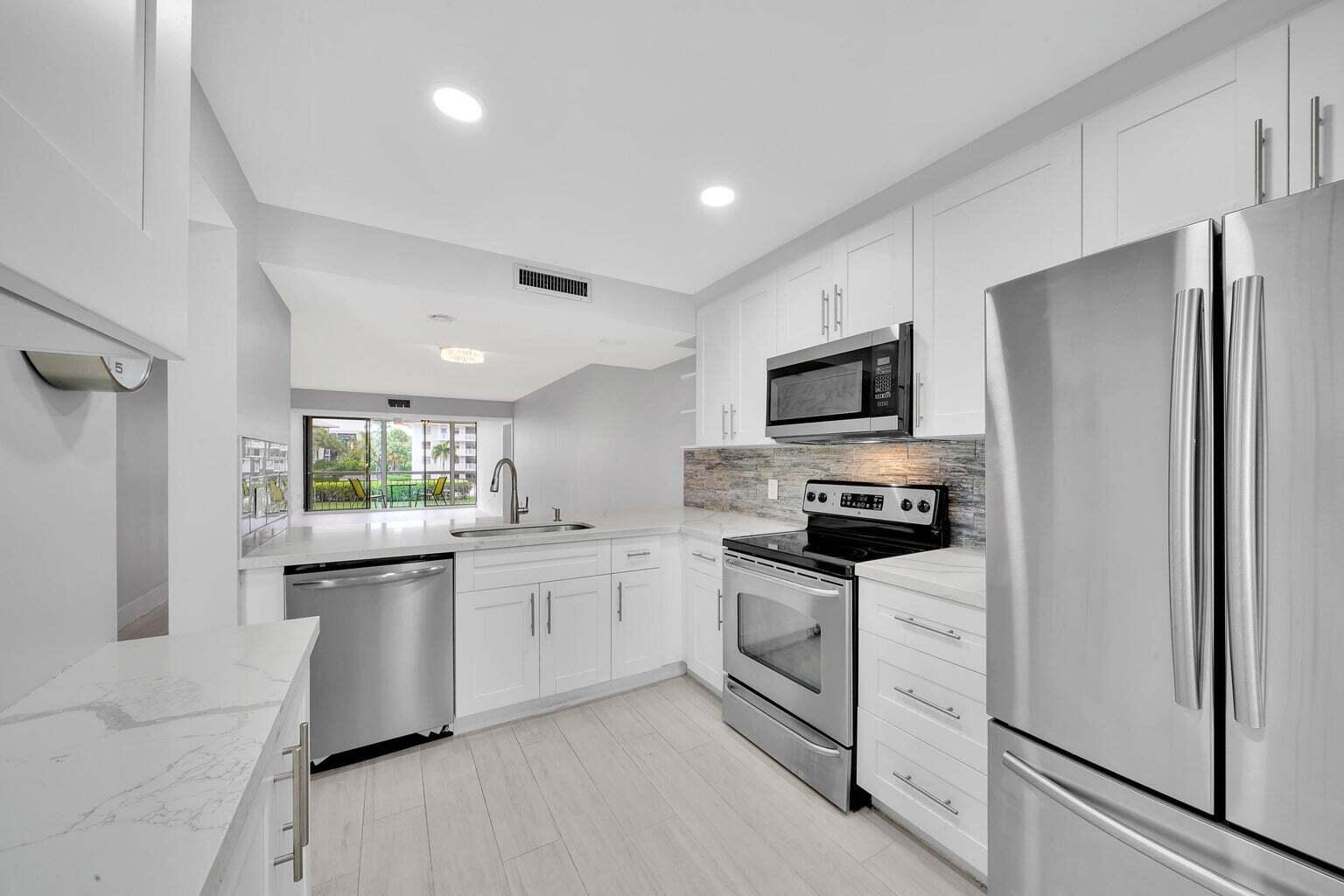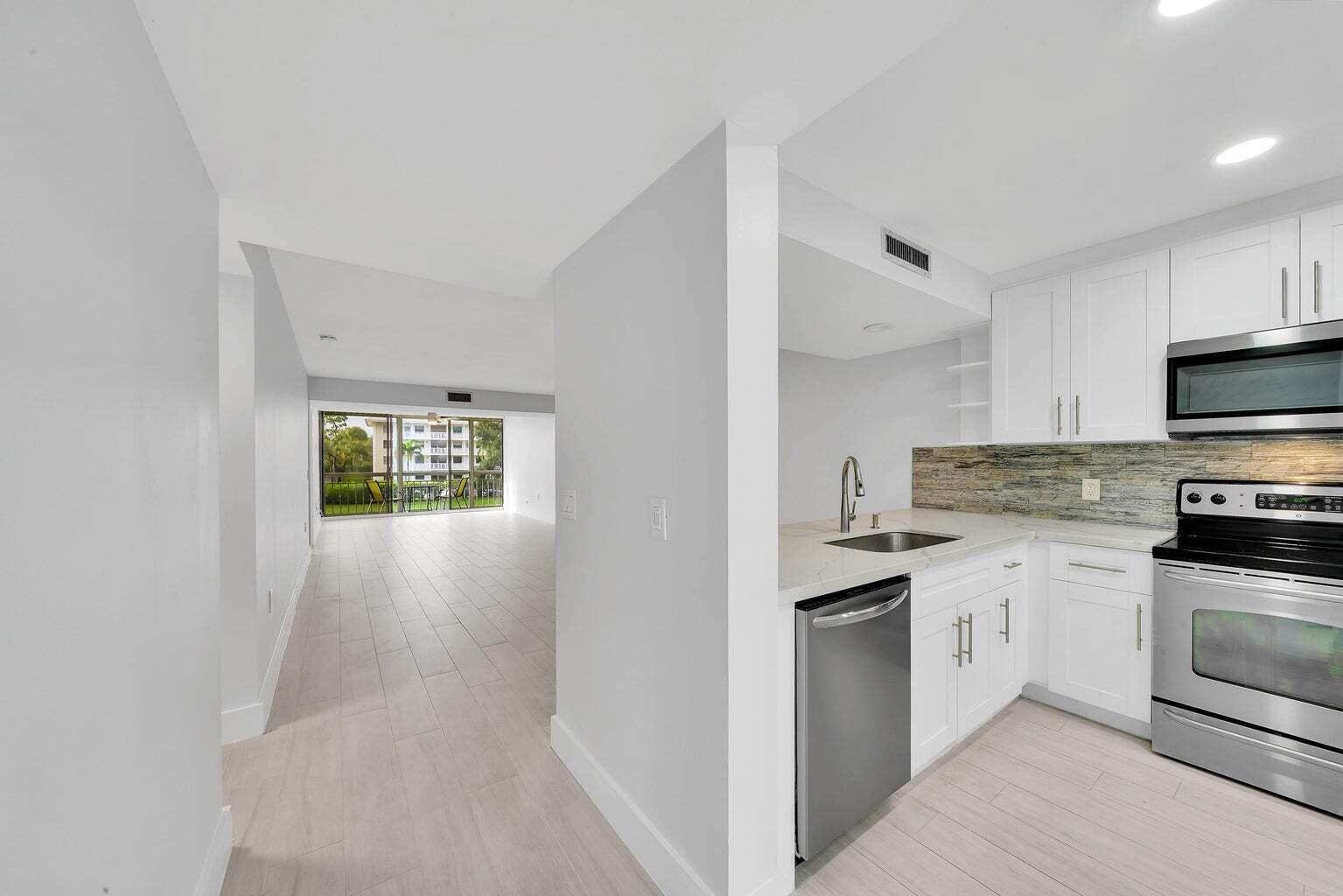 Totally remodeled with 2 screened in balconies, overlooking the lake and pool. One off the master bedroom and one in living room. Very bright and spacious this 1348sq ft unit has just been painted and looks beautiful for its new tenant. Quartz countertops in kitchen and bathrooms with slow close cabinets. One of the best locations in Boca Raton. Just 10 minutes to Town center Mall, beaches , Mizner Park. Laundry room large enough for a twin bed or desk Assigned parking. Great location come and see this gem. Very good school district.