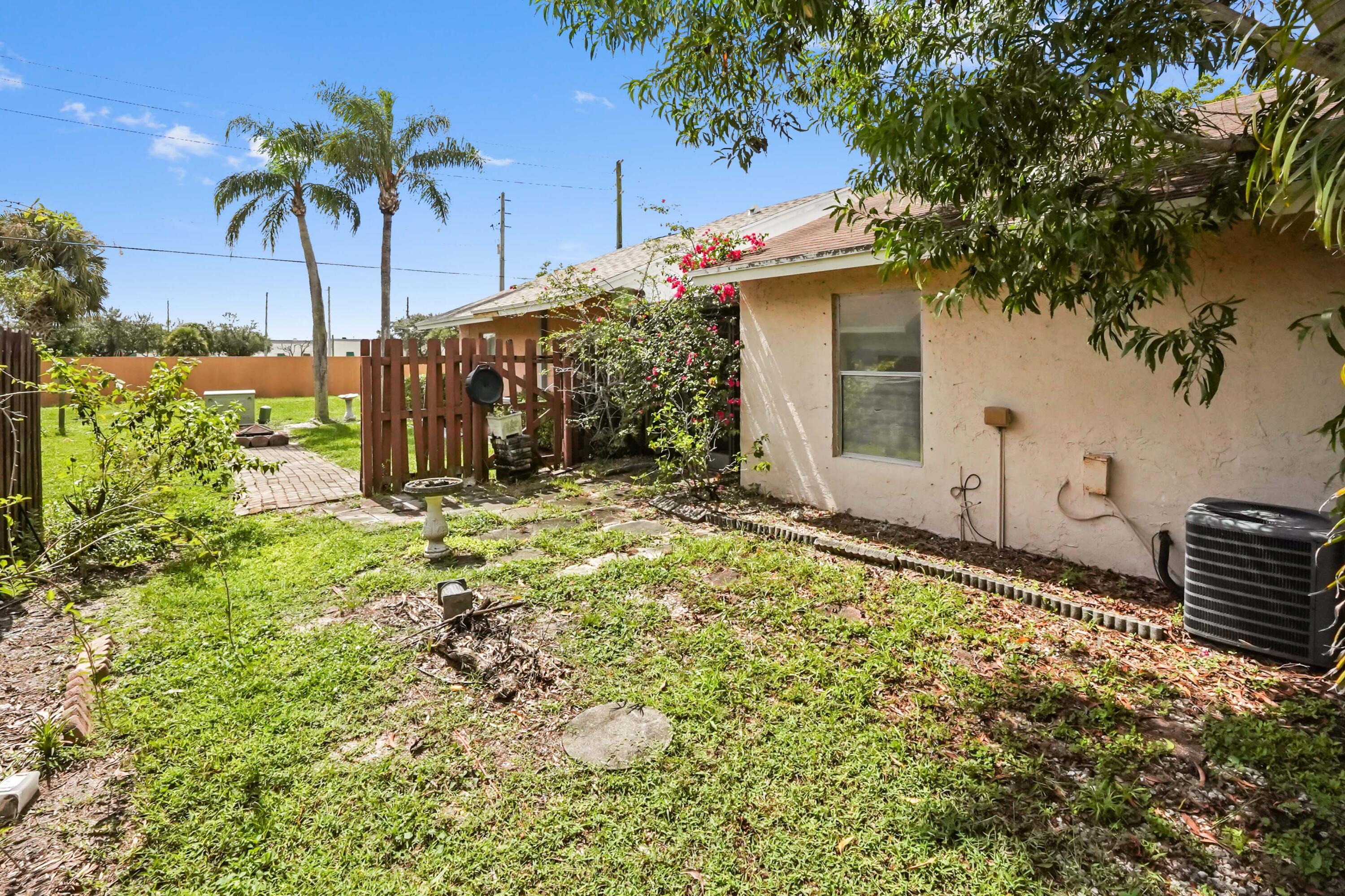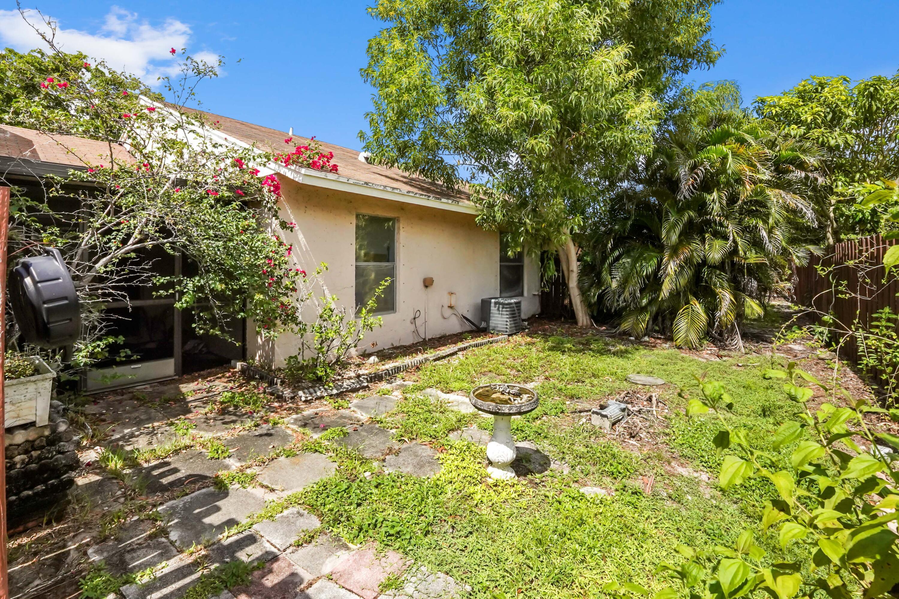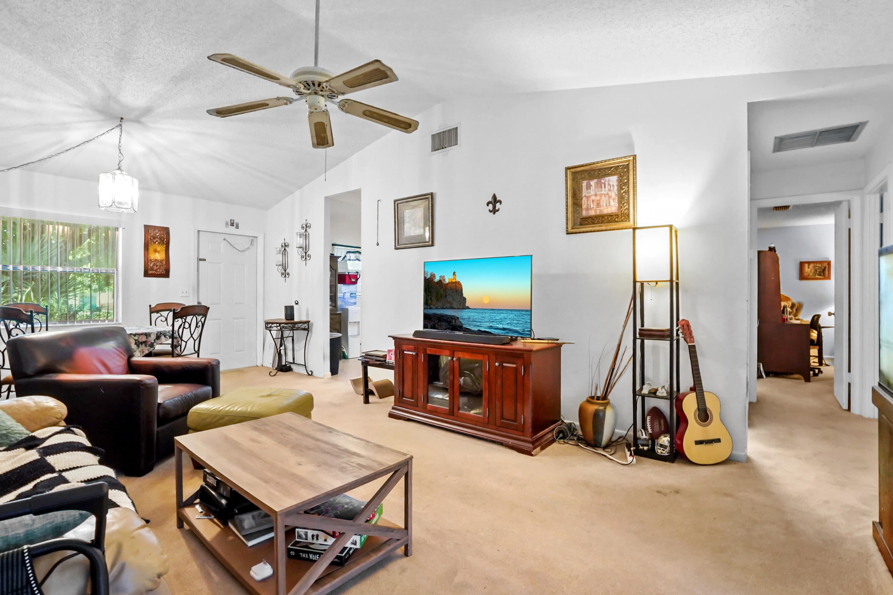 Welcome to this charming single-story villa, perfectly situated in a desirable neighborhood in Lake Worth, FL. The residence offers an incredibly spacious feel, immediately welcoming you with a vaulted ceilings that soar above the open-concept living and dining areas. This highly functional floor plan is bathed in natural light, creating a bright and airy atmosphere. The kitchen is functional and ready for use, featuring light, cream-colored cabinetry and a tiled floor, providing a fantastic opportunity for a buyer to easily customize and modernize their dream space.The bedrooms are generously sized and bright, each equipped with a ceiling fan for comfort and carpet flooring. Step outside to discover your own private, fenced-in tropical sanctuary. It features a private brick-paver patio/grilling area, perfect for al fresco dining and entertaining. This home's prime location in Lake Worth combines the tranquility of a quiet neighborhood with unbeatable access to local shopping, dining, and parks. This is a rare chance to purchase a home with great bones, a fantastic layout, and the freedom to customize every detail.