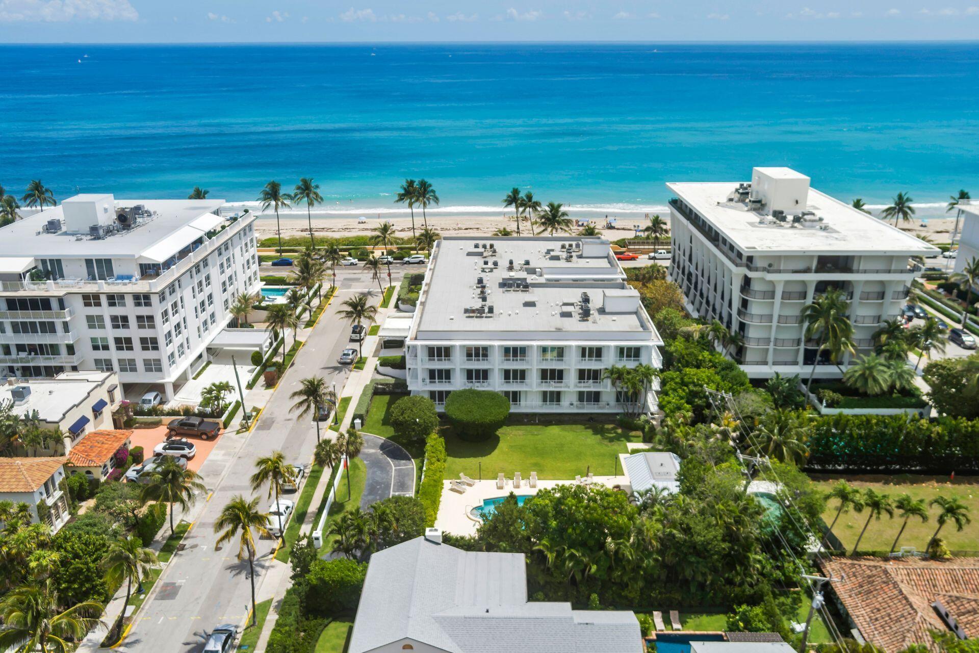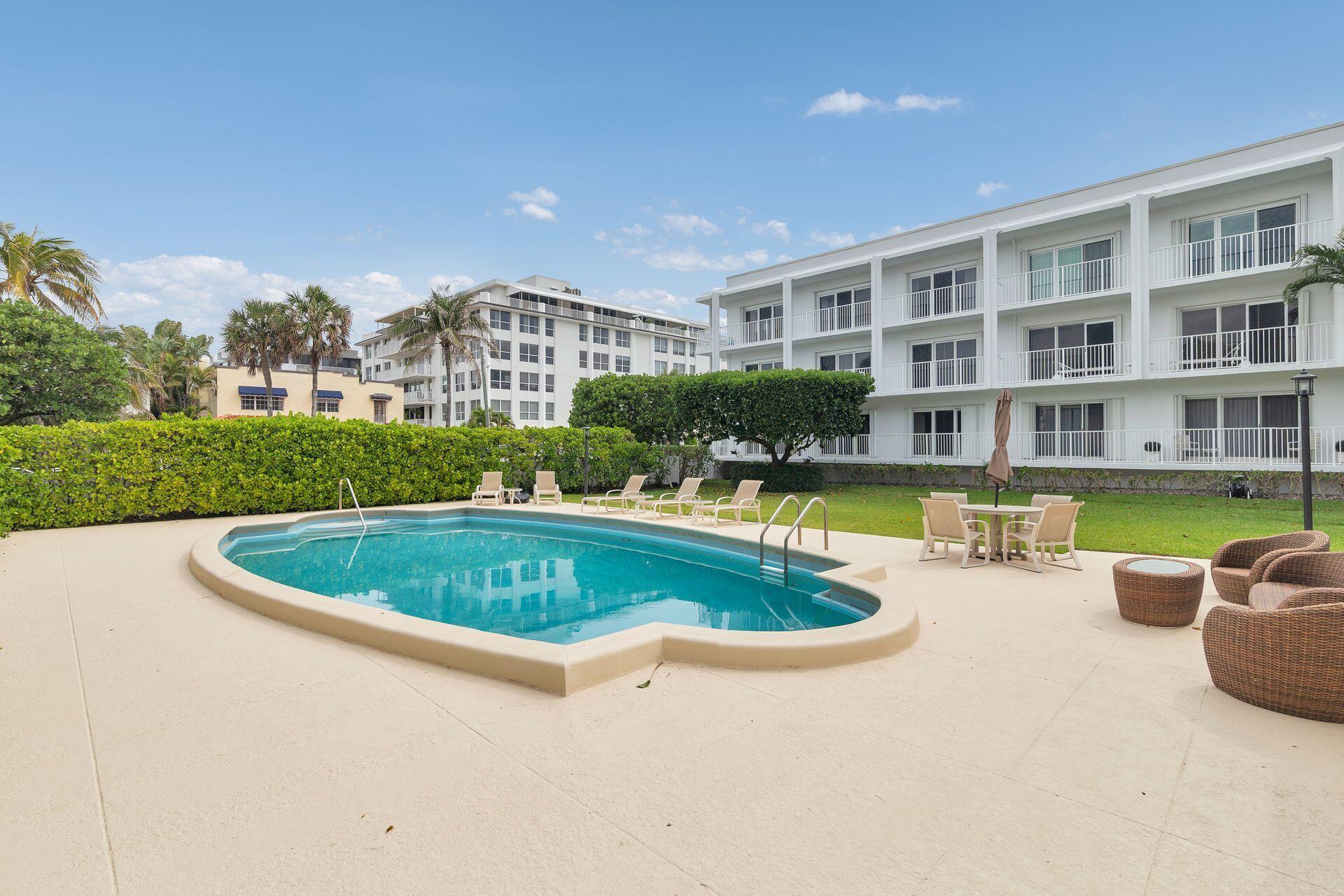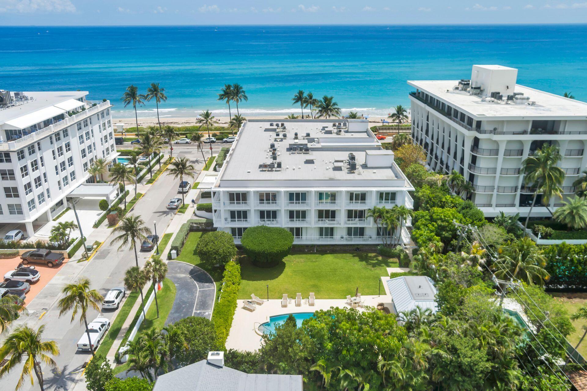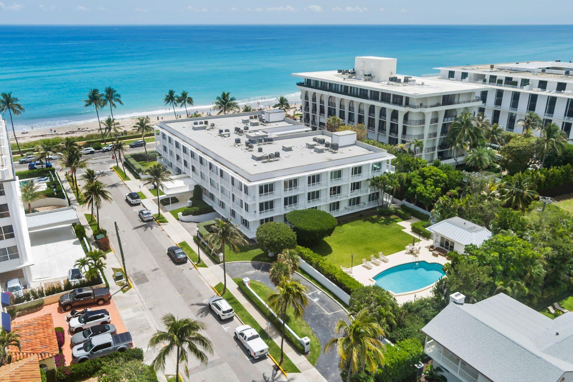 Experience the best of coastal living in this spectacular ocean front boutique building in Palm Beach. This stunning 2 bedroom, 2 bath with views of the large heated, private pool from your balcony is ideally located across the street from Mid-Town Beach and only two blocks from Worth Avenue. This first-floor turnkey end unit has tile throughout while offering a private view from each room to the pool and lush landscaping. The newly renovated lobby and hallways exude modern elegance. You are also surrounded by lush landscaping with serene outdoor seating. Residents also have access to a brand-new gym and the convenience of a doorman service building. Additionally, the Three Fifty Condo is pet friendly. The perfect Palm Beach pied-a-terre awaits, with one of the lowest HOA on the island!