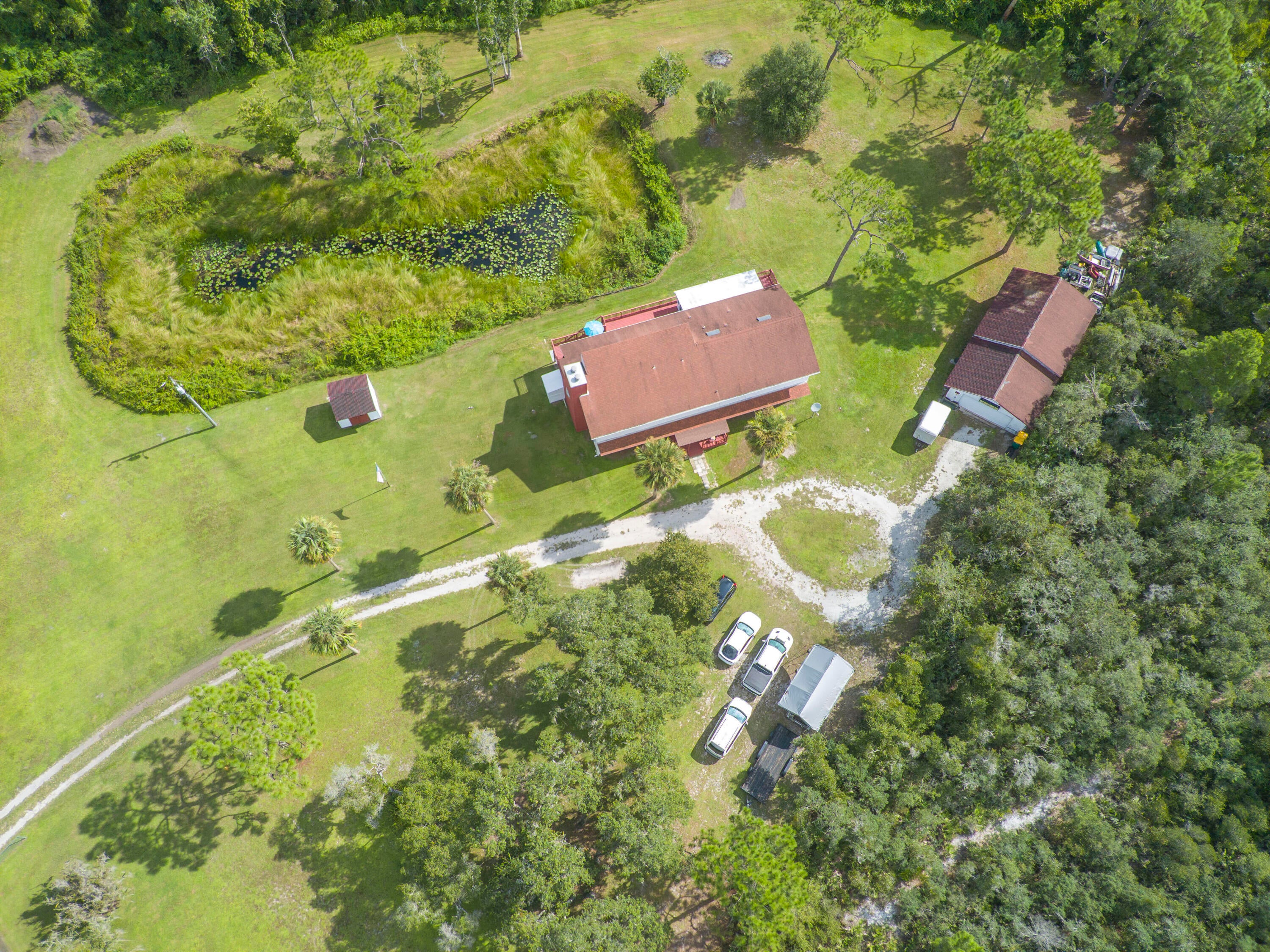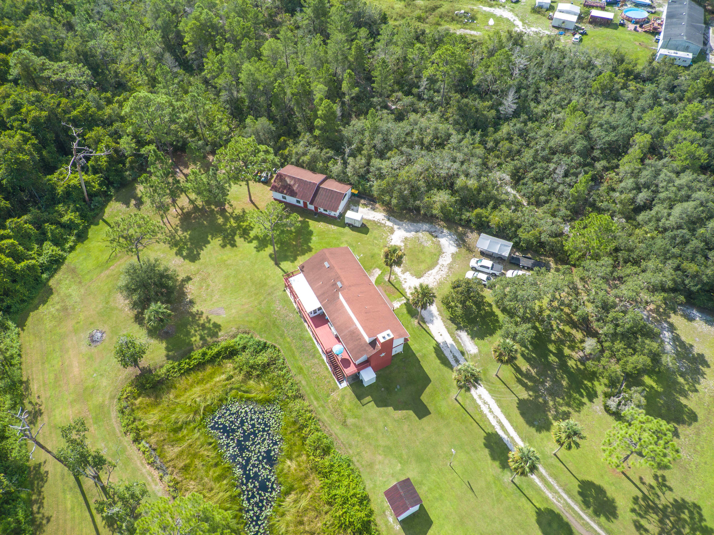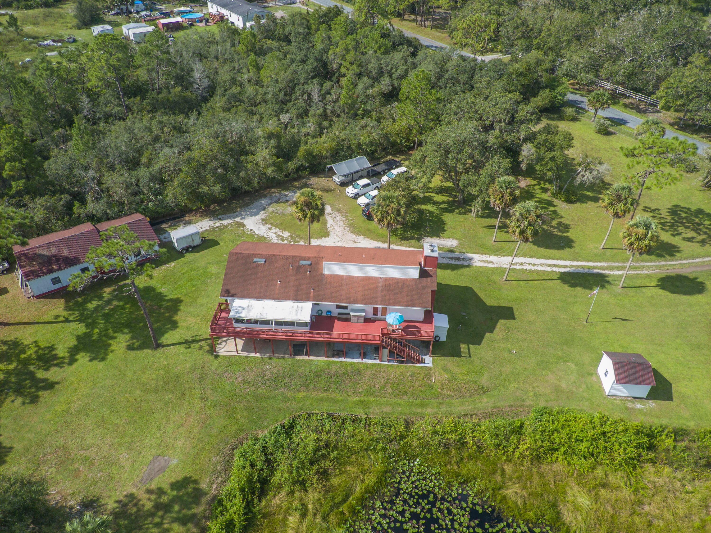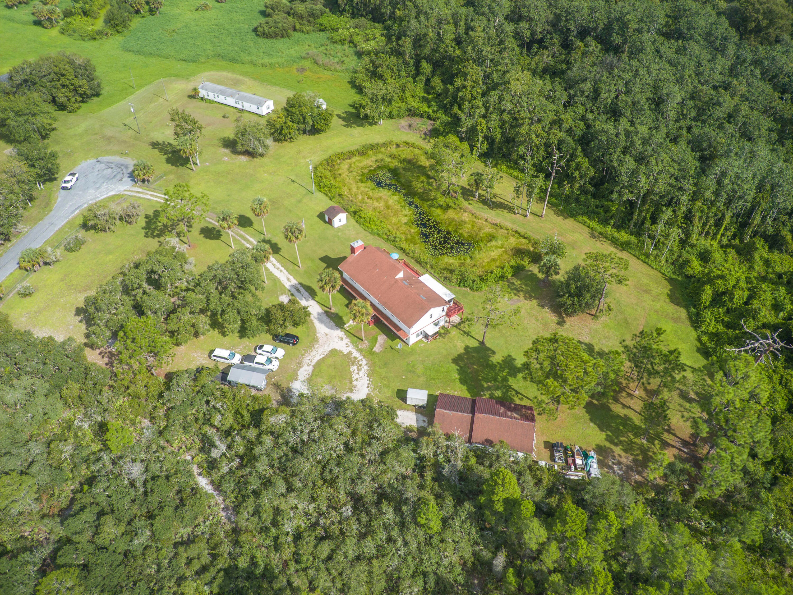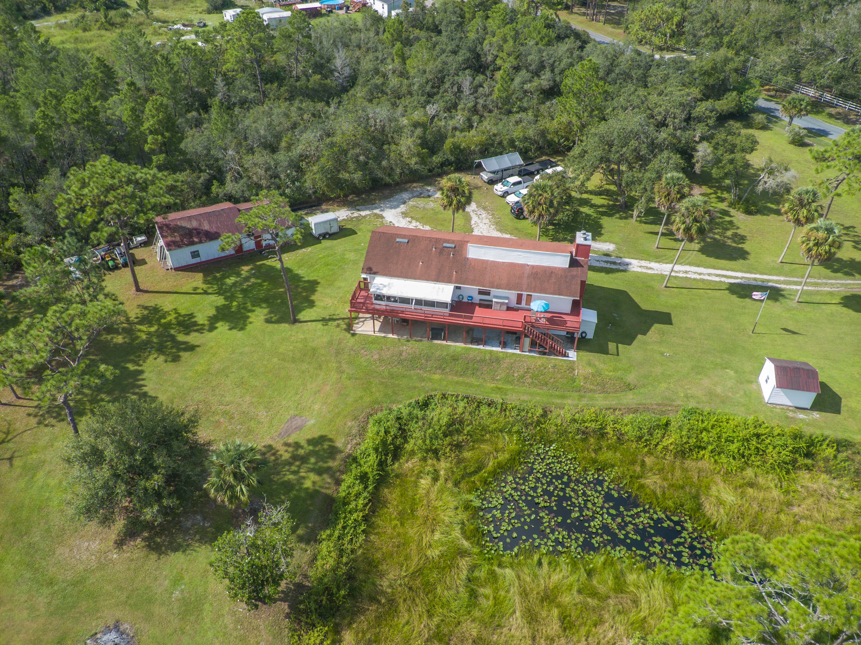 5.5-acres located on a secluded natural preserve w/view overlooking a pond & greenbelt backyard this unique parcel features a Spacious 2-story home w/5 bedrooms & 3.5 bathrooms 2 stone fireplaces, an elevator, 2 full kitchens truly a dual living space configuration that is perfect for multigenerational accommodations. The extensive Workshop has room for 4 cars and extra projects; a bucket truck & zero turn riding mower enjoy freedom of no deed restrictions! First floor A/C 3-ton unit 2023, WH 2018 new shingle roof 2015 upstairs 4-ton A/C 2015 WH 2023 updated Colligan water purification system 2025